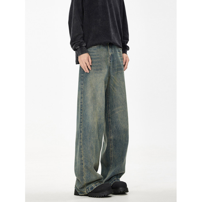 美式復古cleanfit濶腿牛仔褲男潮牌新款高街水洗做舊寬鬆直筒長褲