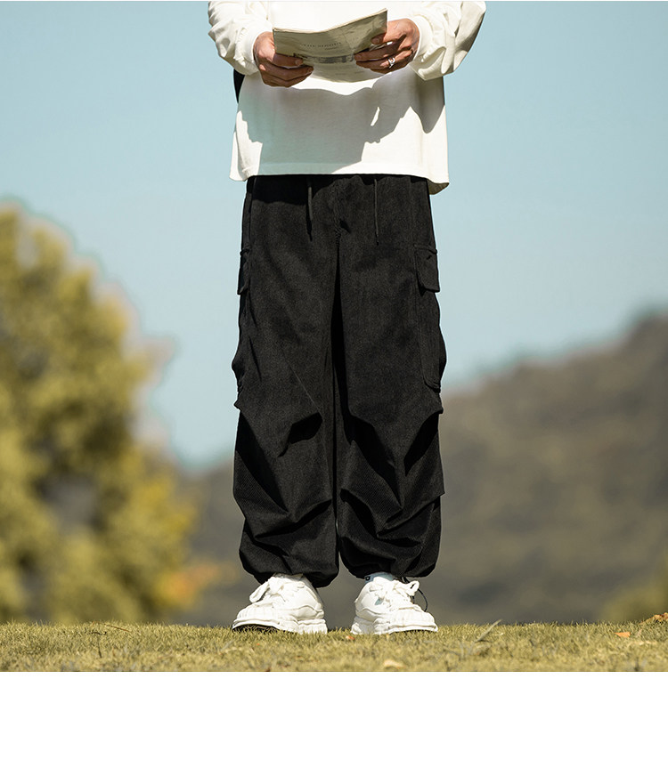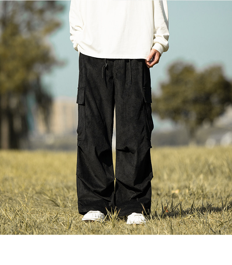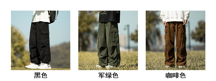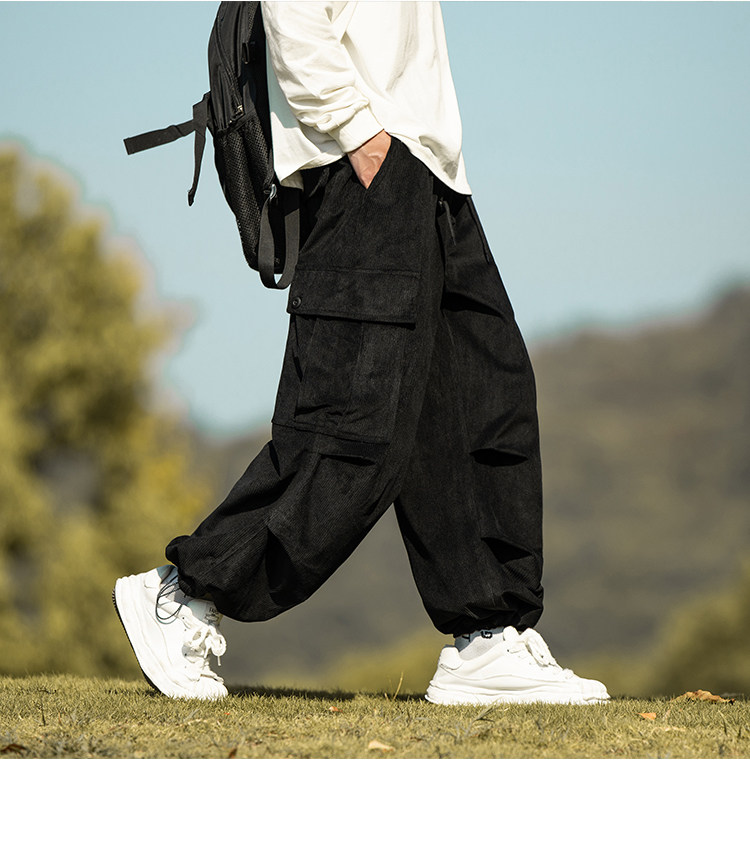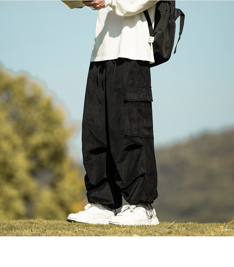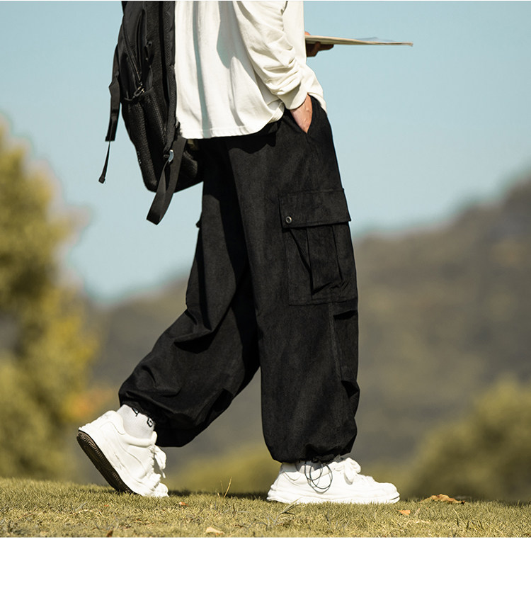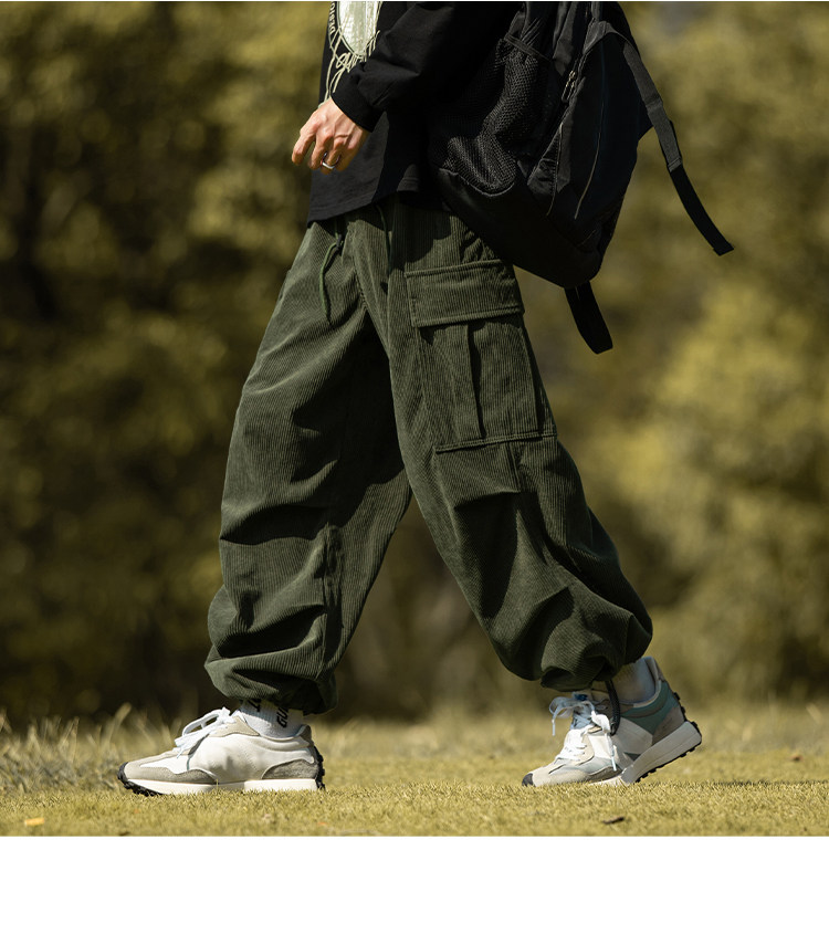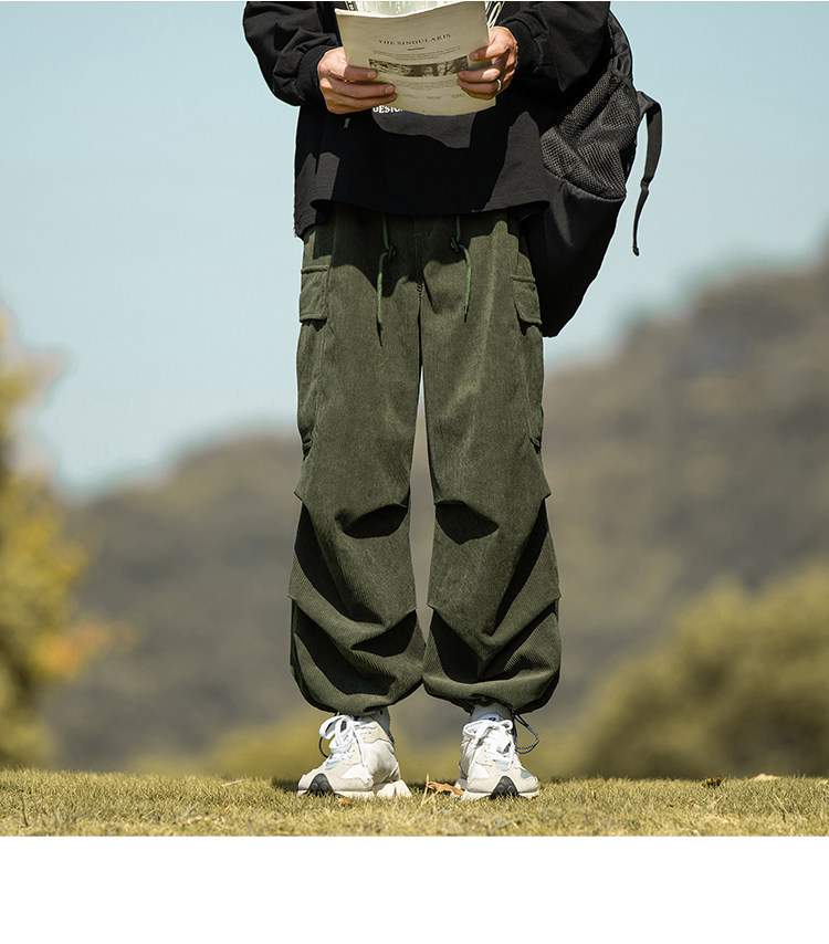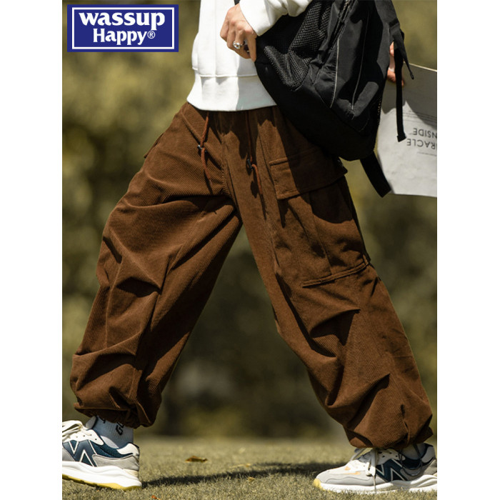 wassup happy咖啡色束腳工裝褲男秋冬季加絨加厚燈芯絨休閒長褲子