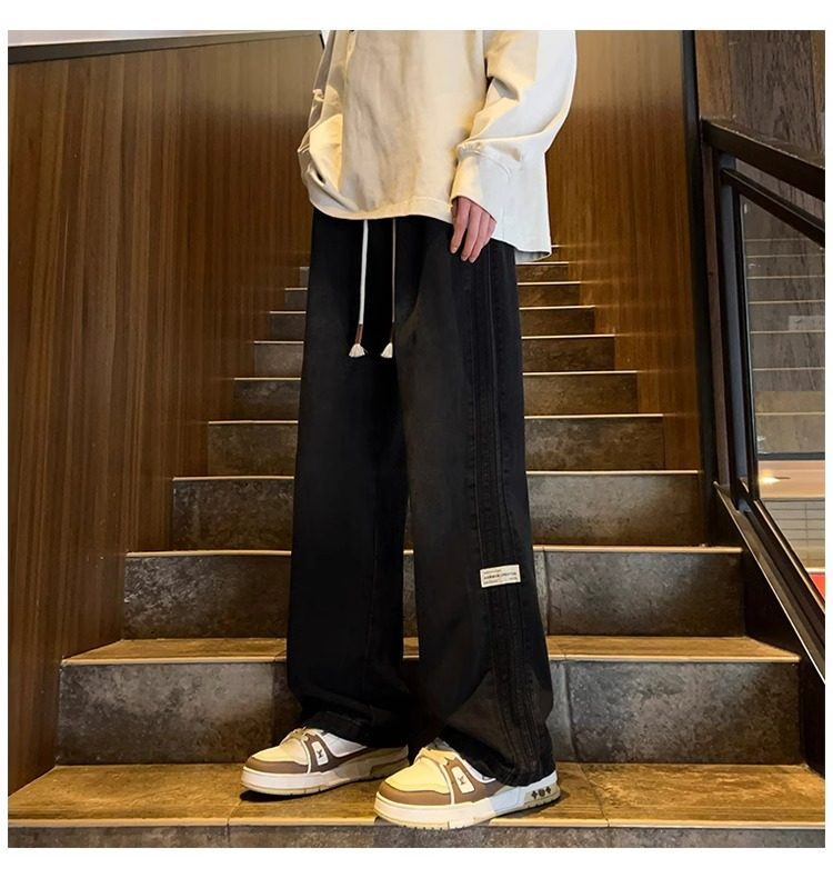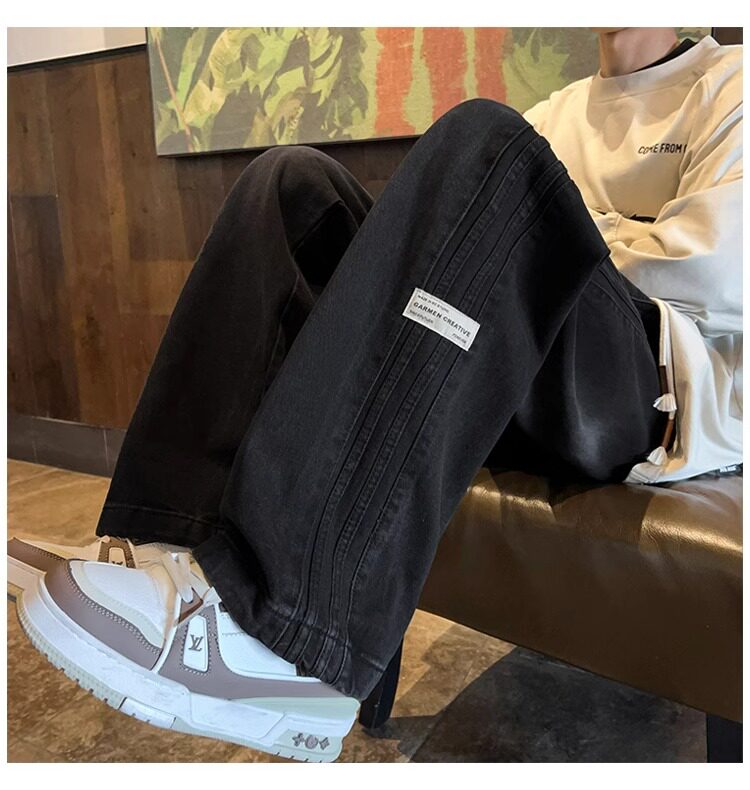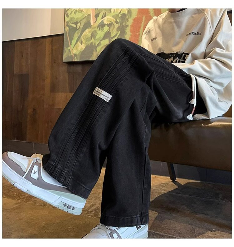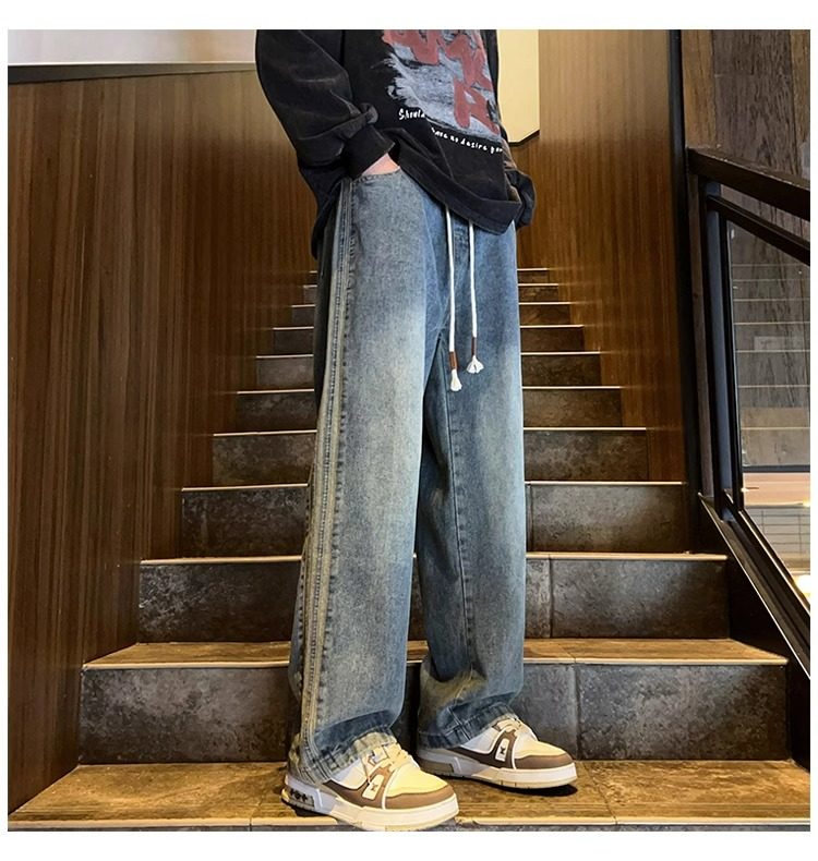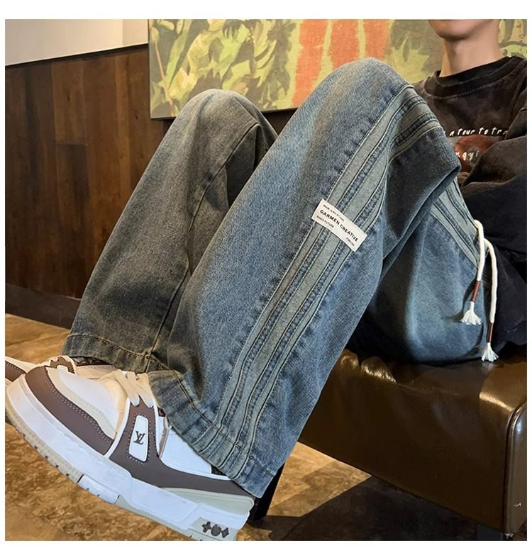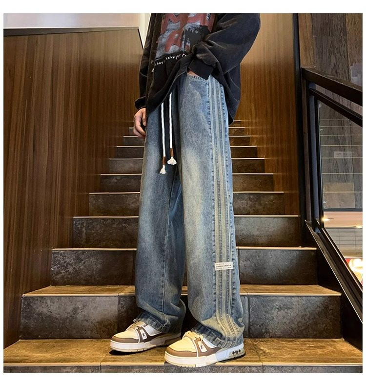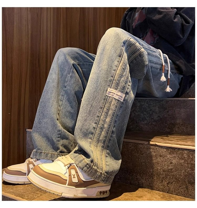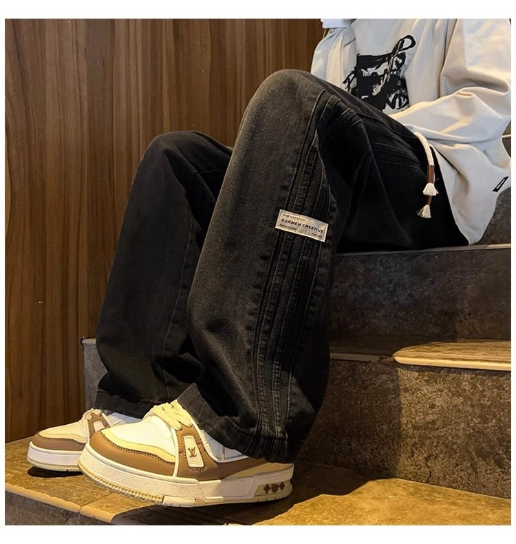 條紋美式復古牛仔褲男春秋新款高街松緊腰寬鬆休閒男士直筒長褲子