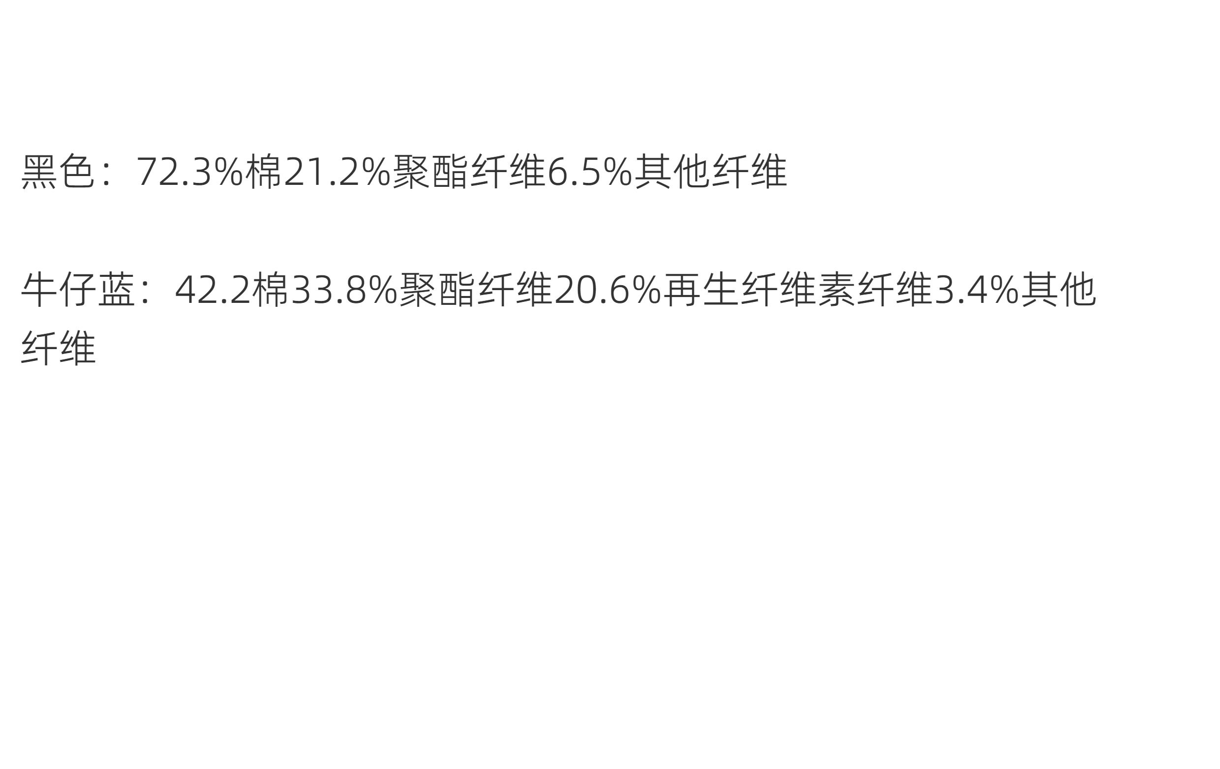 | 材質成分 | 聚酯纖維48.5% 棉36.7% 再生纖維素纖維13.3% 其他材質1.5% |