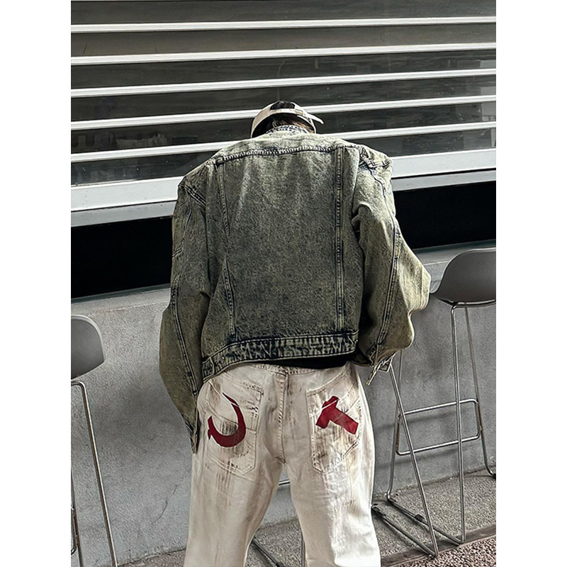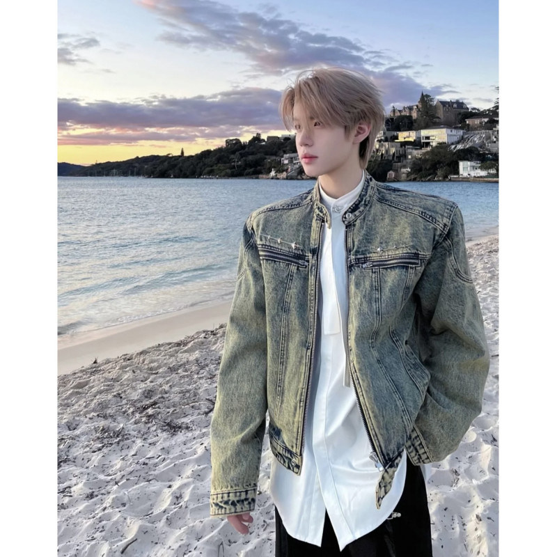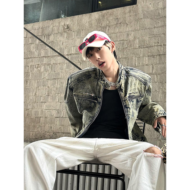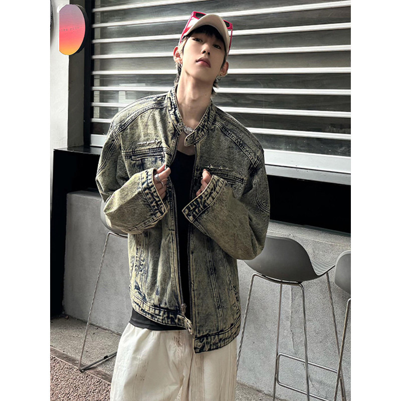 墊肩短款牛仔外套男高級感痞帥春秋美式cleanfit立領夾克男模穿搭