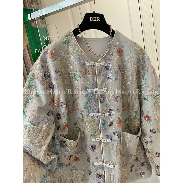 300斤大碼高級感新中式亮片外套男女春秋ins風刺綉盤釦顯瘦牛仔衣