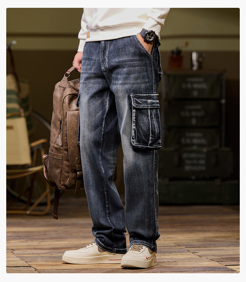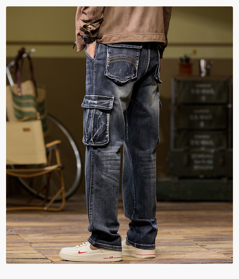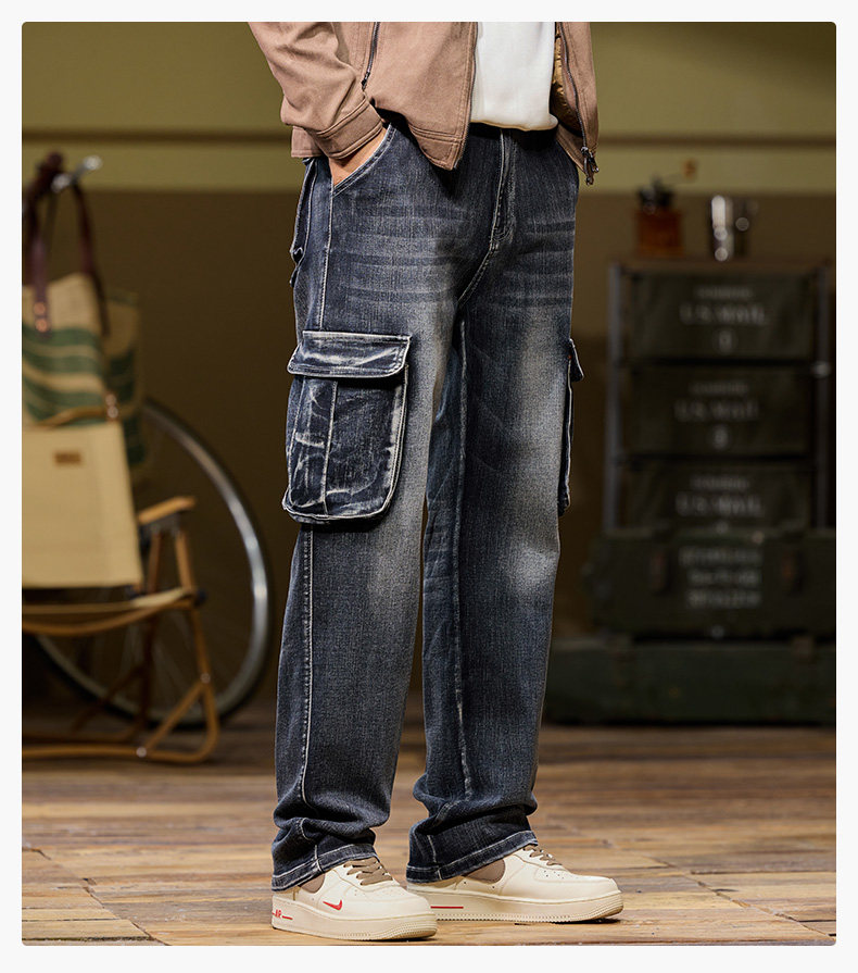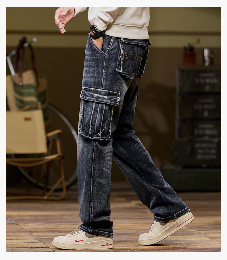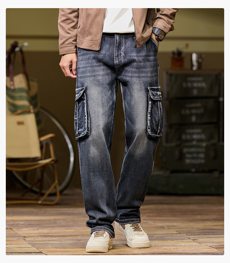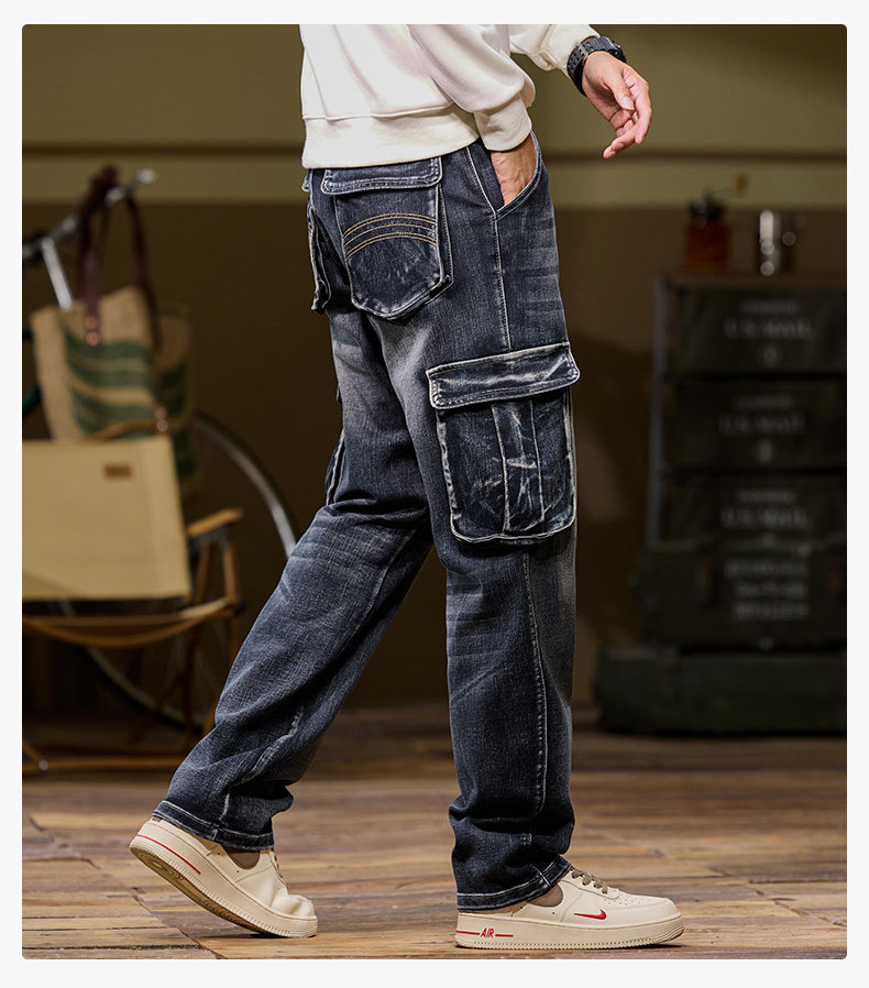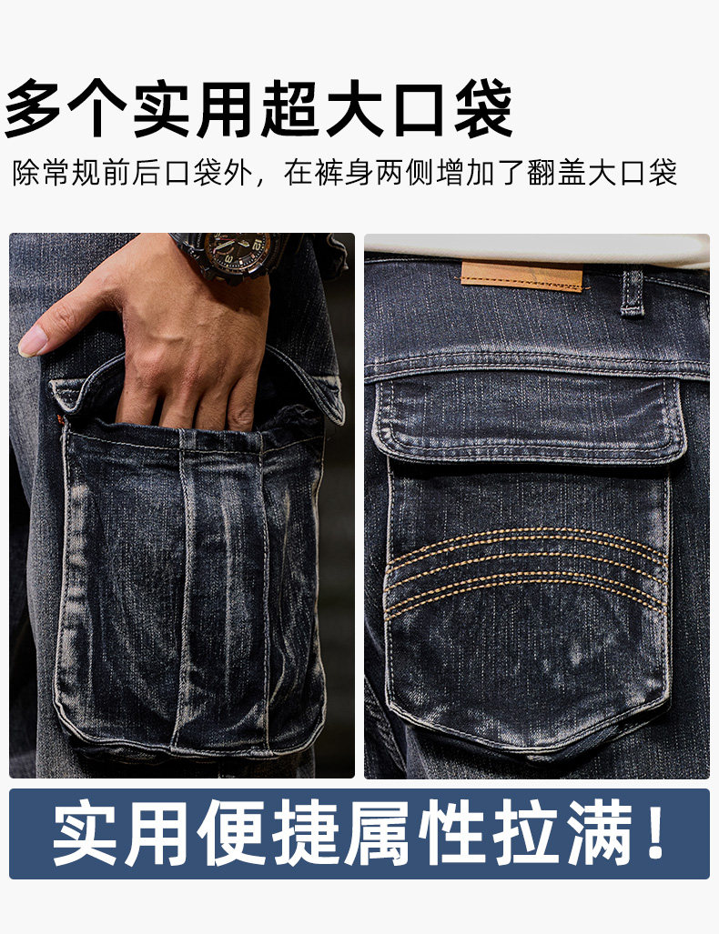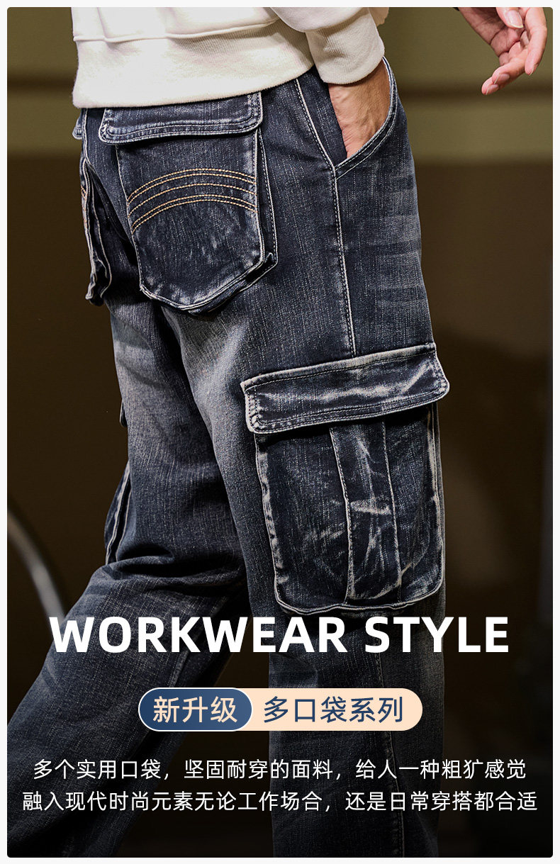 復古黑多口袋工裝牛仔褲男秋冬款直筒寬鬆潮牌高級彈力長褲九分褲