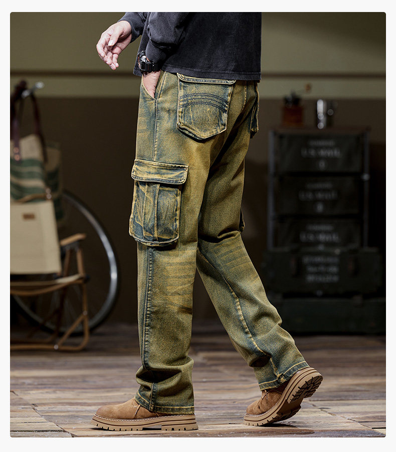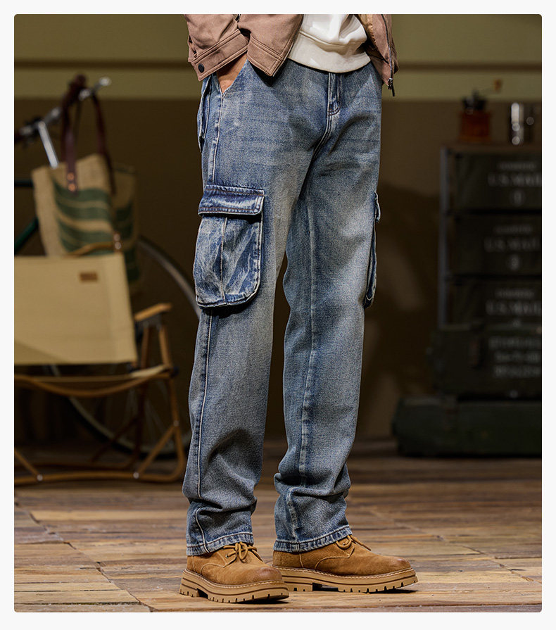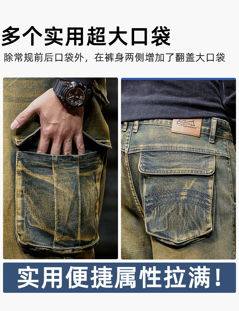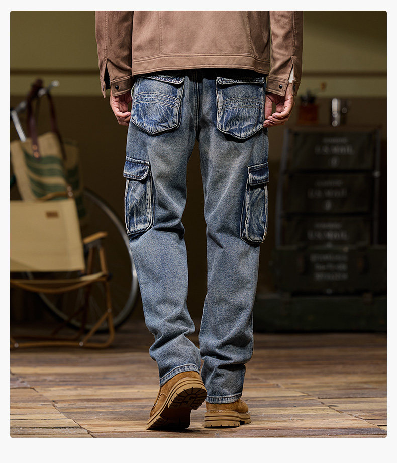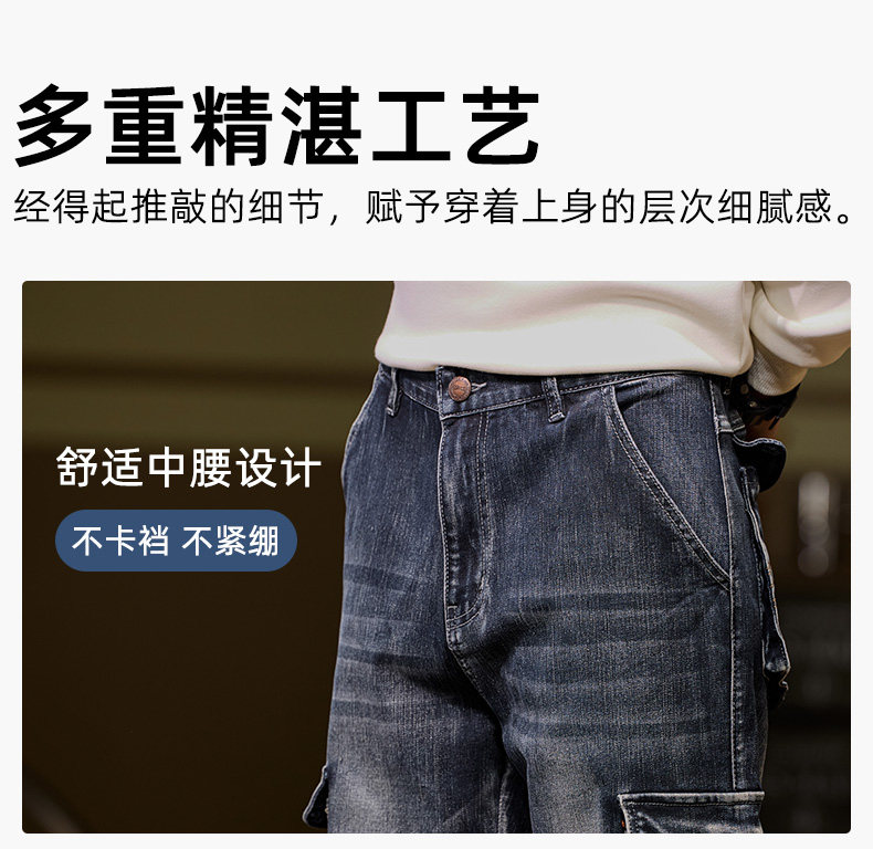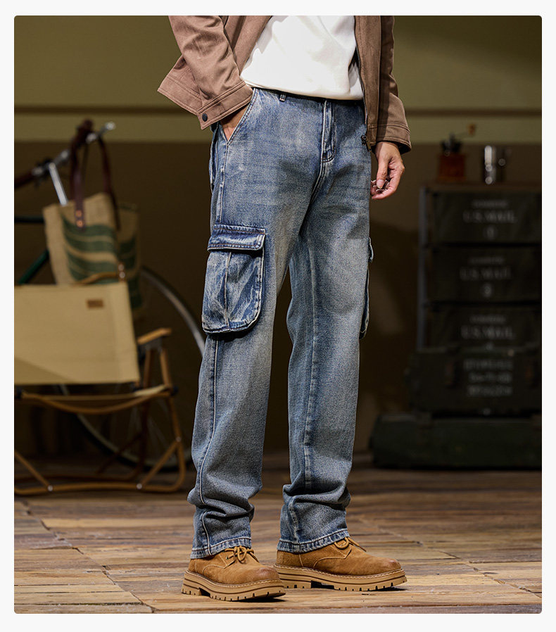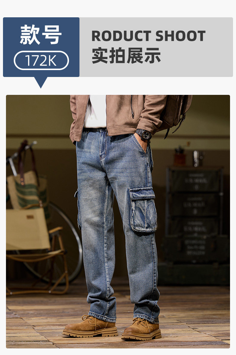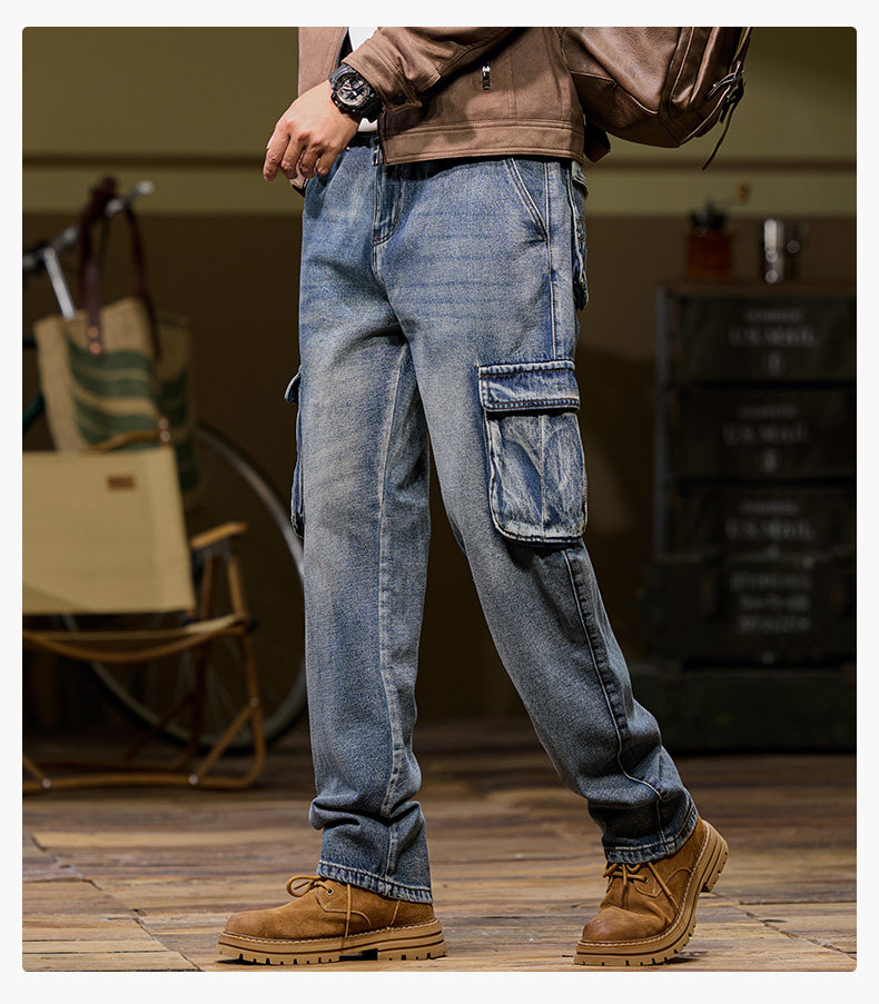 復古黑多口袋工裝牛仔褲男秋冬款直筒寬鬆潮牌高級彈力長褲九分褲