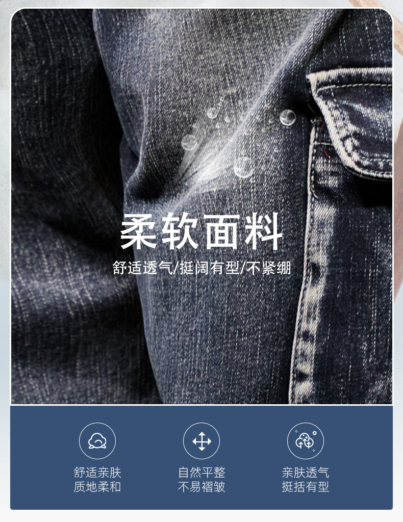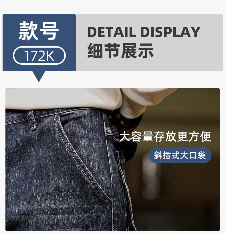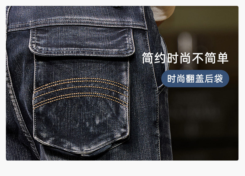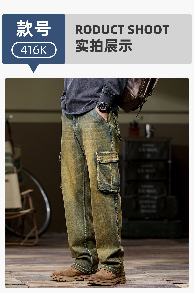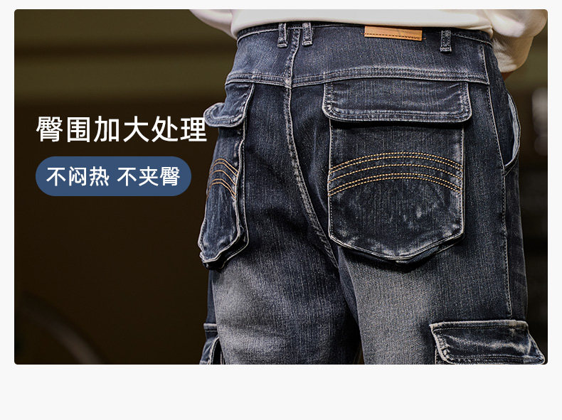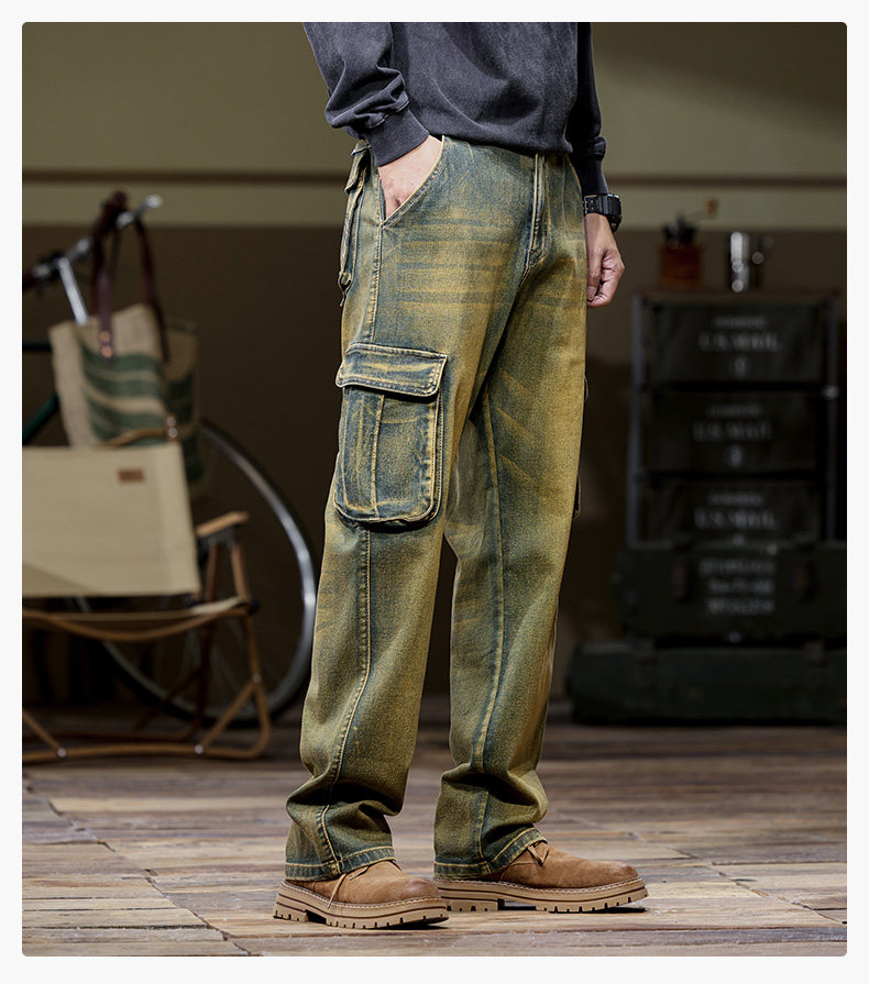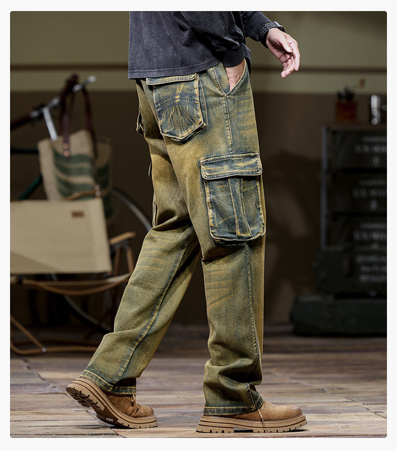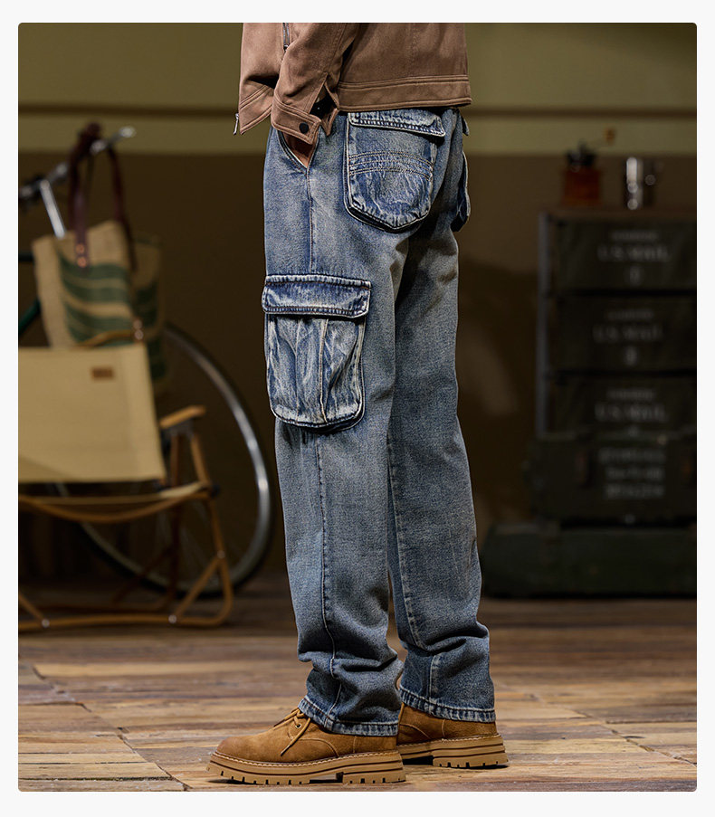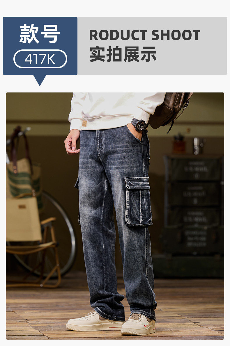 復古黑多口袋工裝牛仔褲男秋冬款直筒寬鬆潮牌高級彈力長褲九分褲