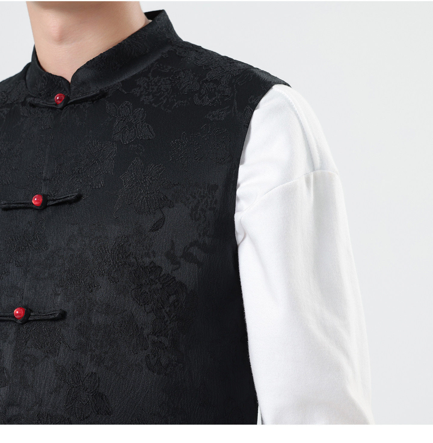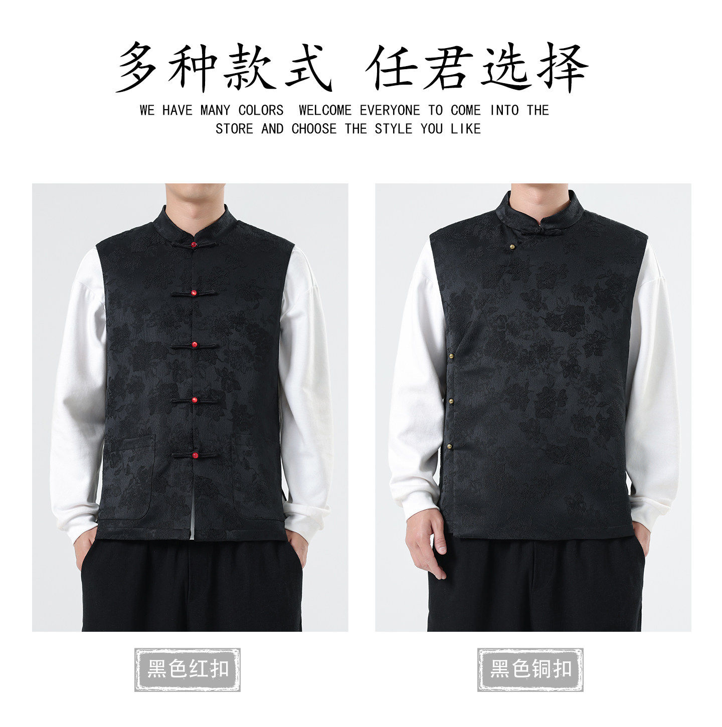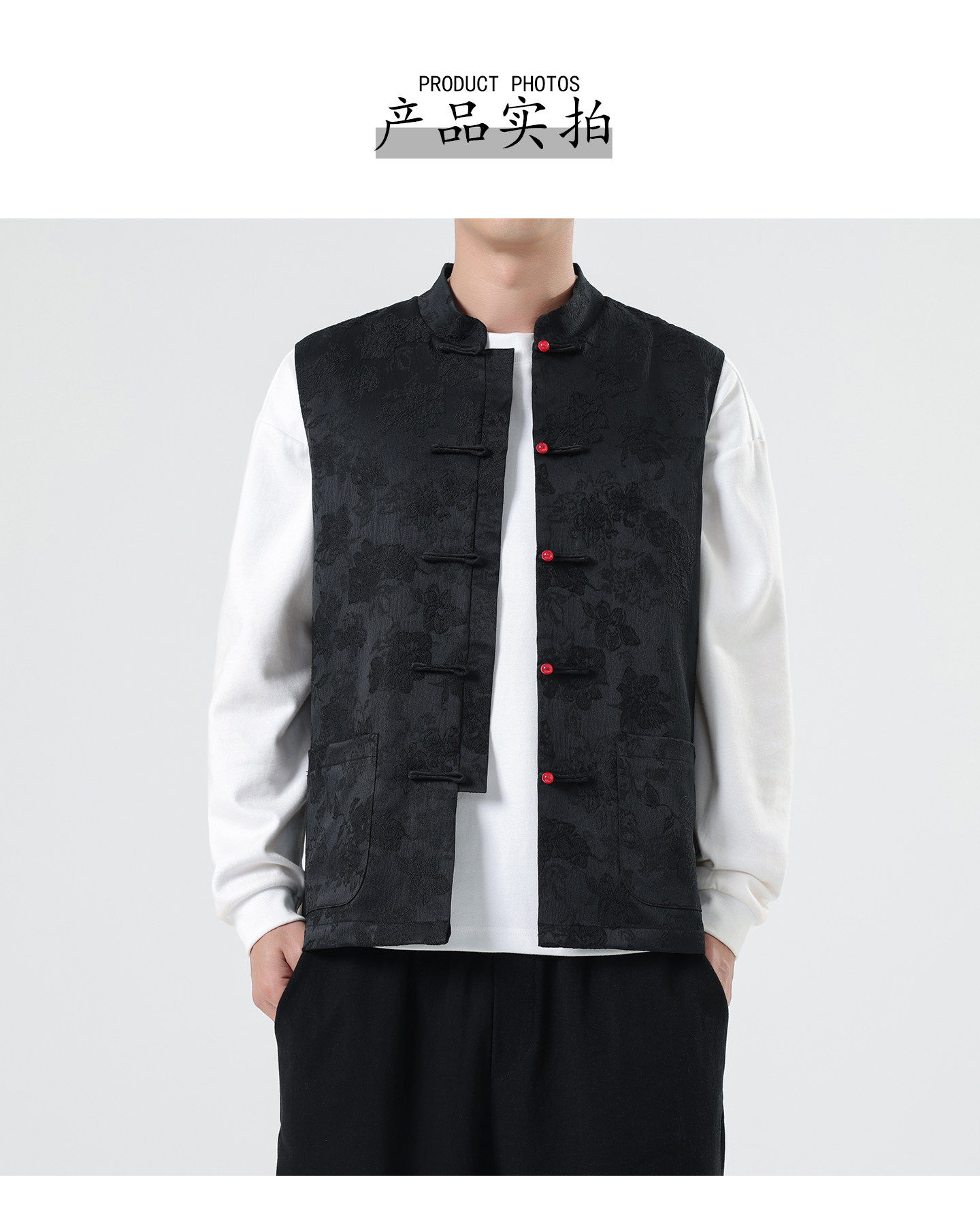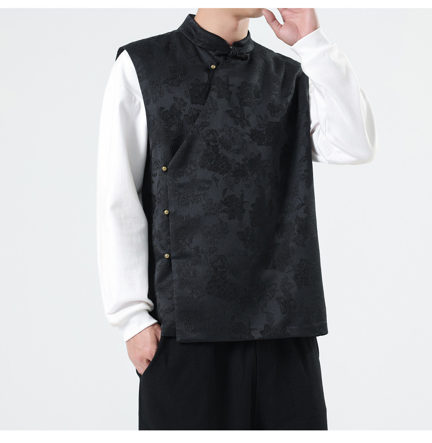 新中式復古風暗紋提花無袖唐裝馬甲風斜襟銅釦改良居士服茶服