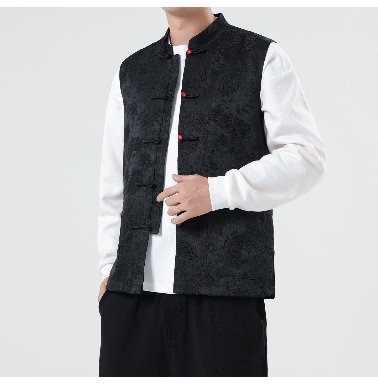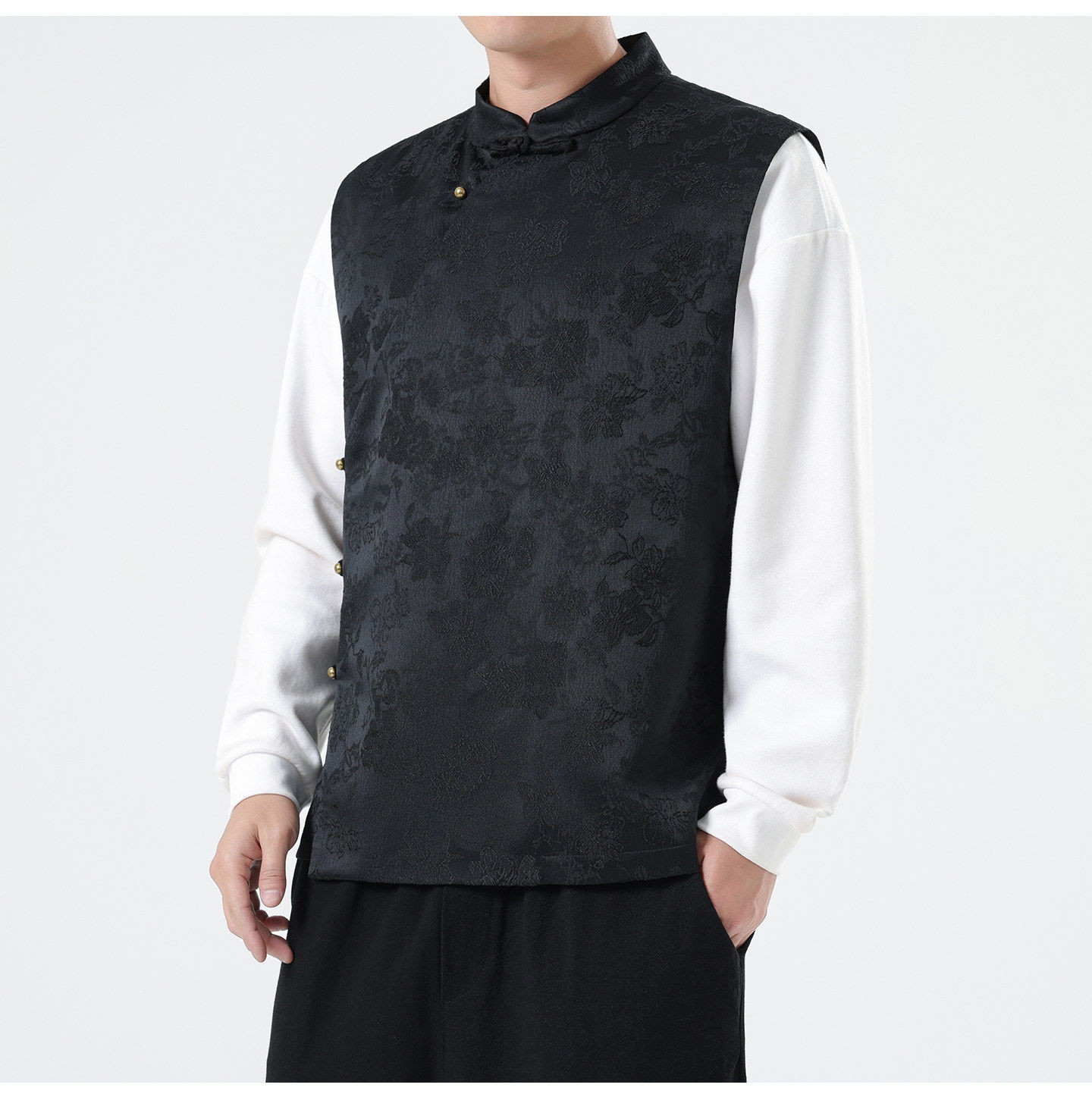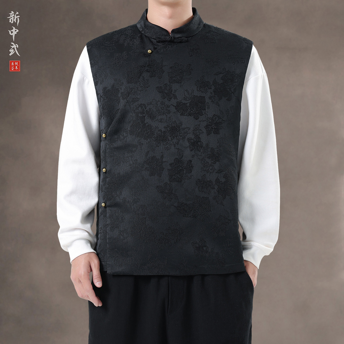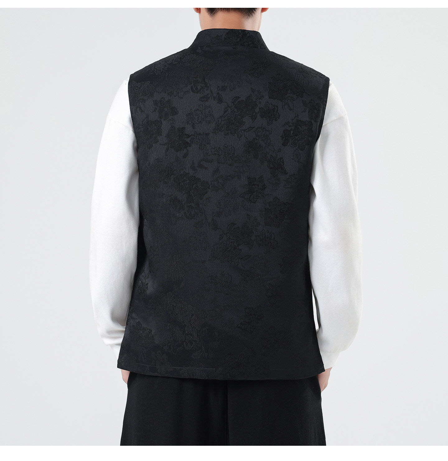 新中式復古風暗紋提花無袖唐裝馬甲風斜襟銅釦改良居士服茶服