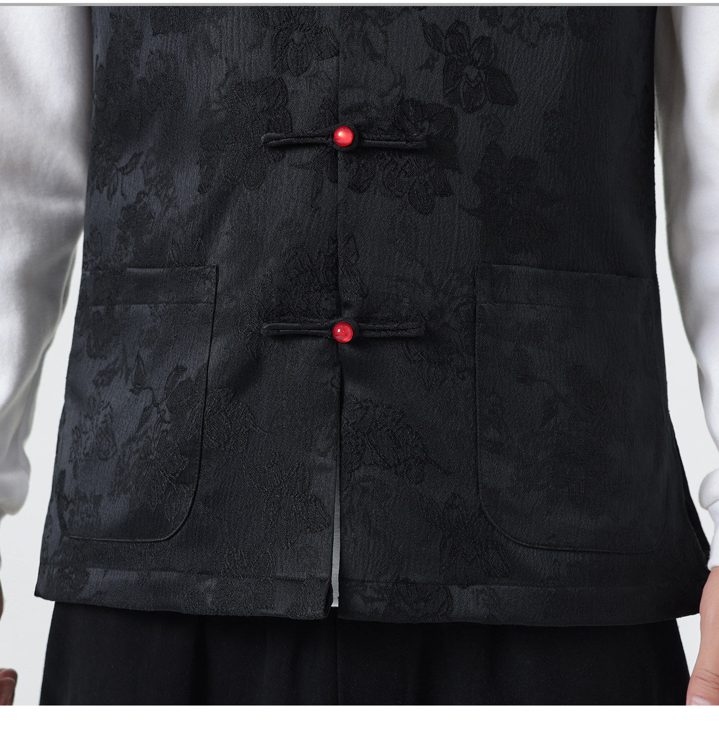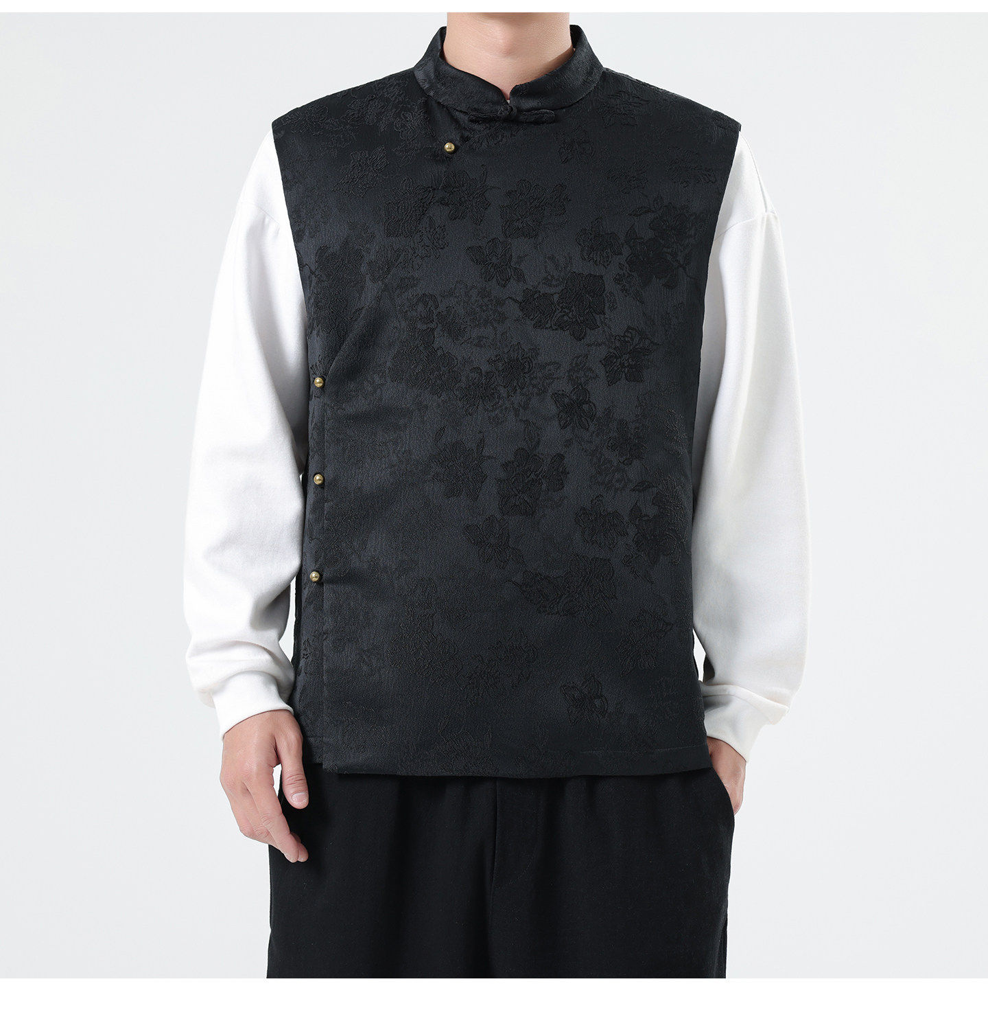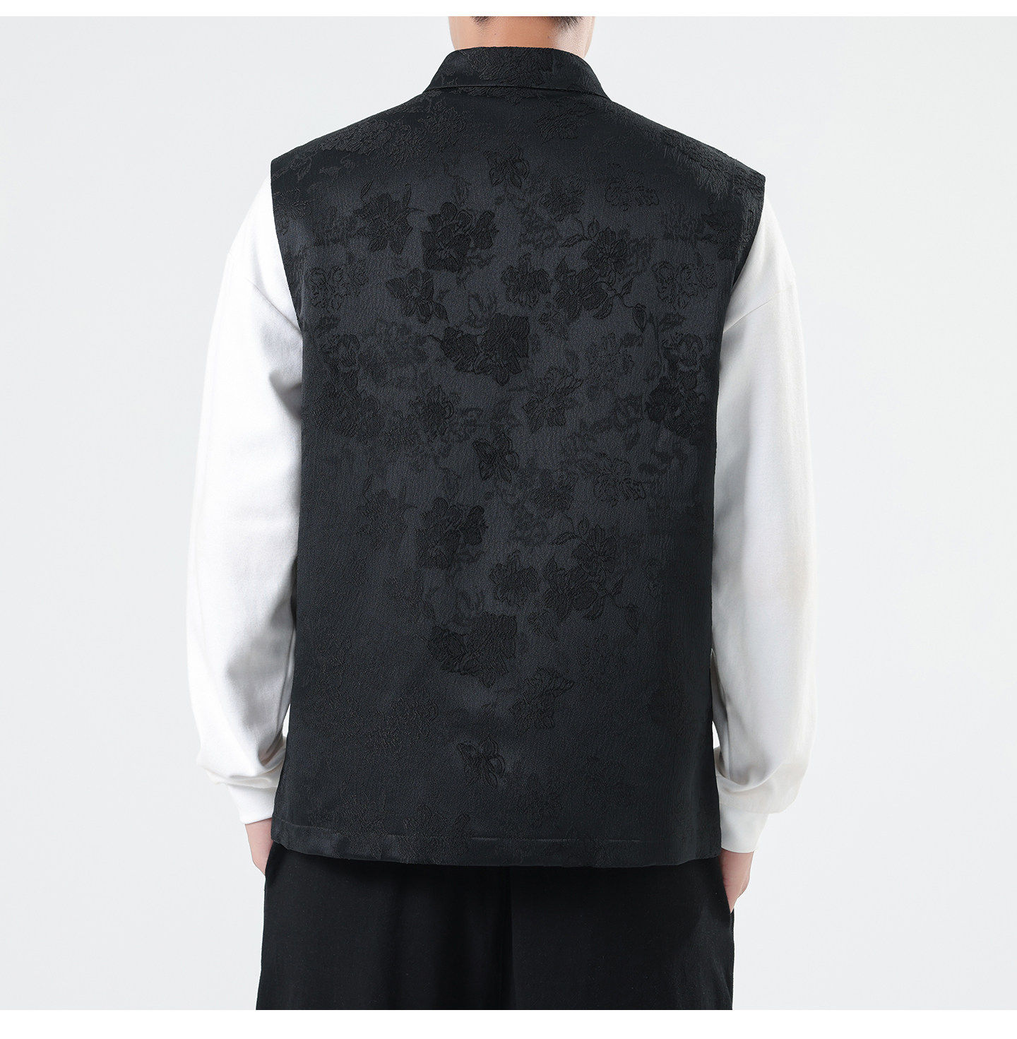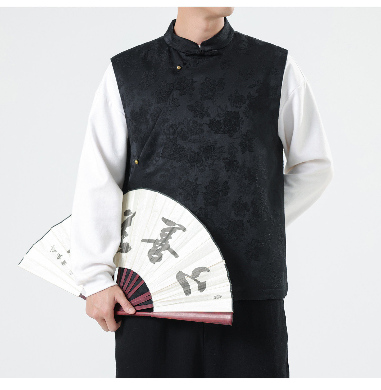 新中式復古風暗紋提花無袖唐裝馬甲風斜襟銅釦改良居士服茶服