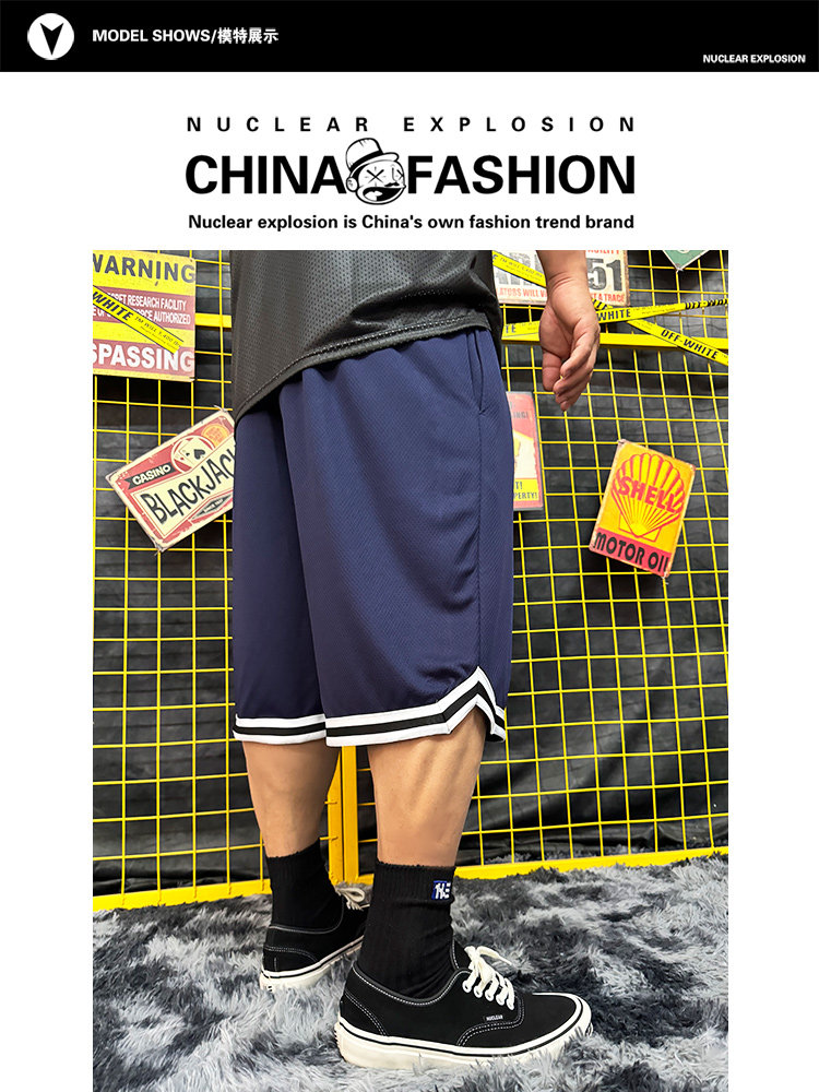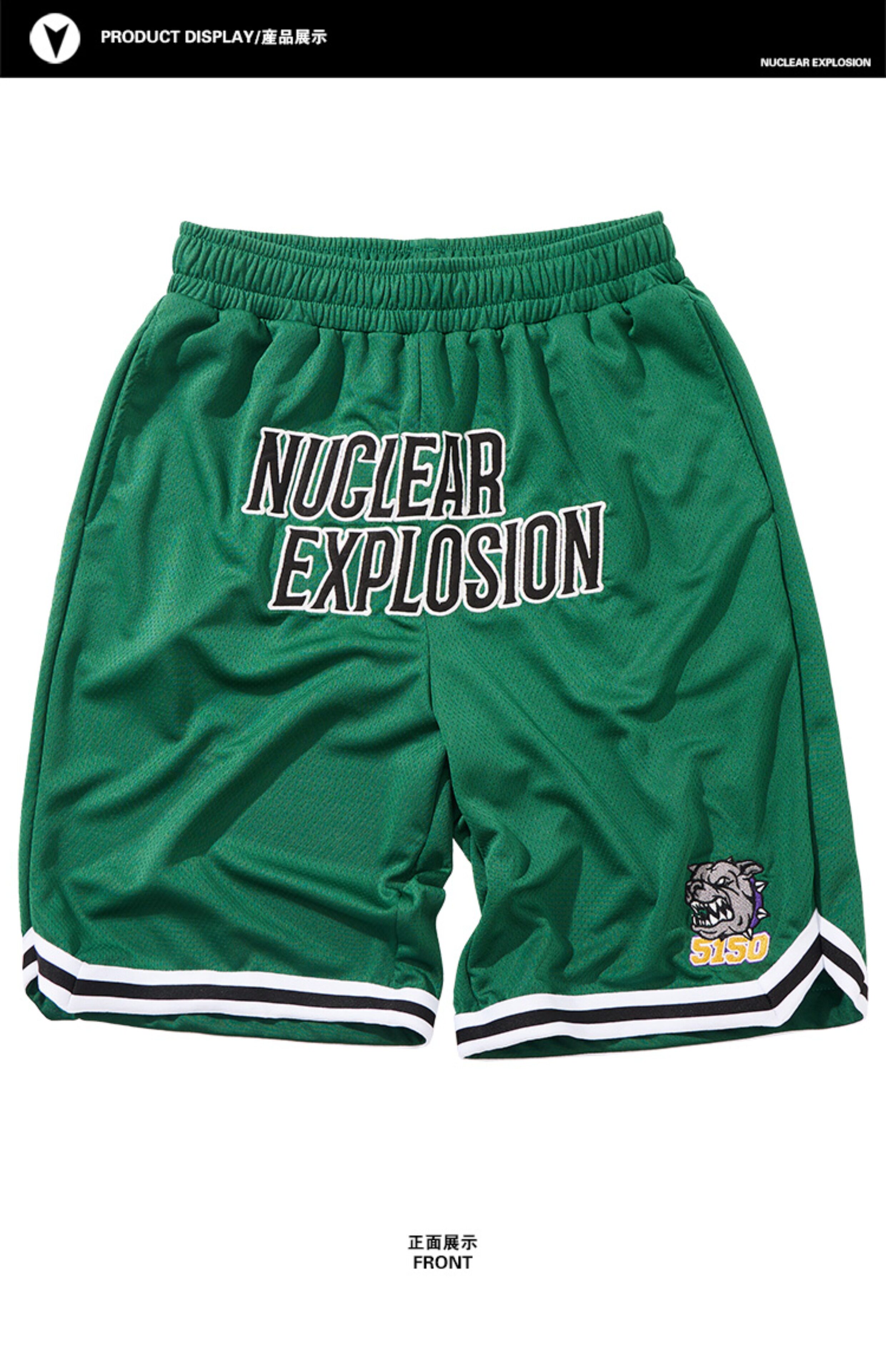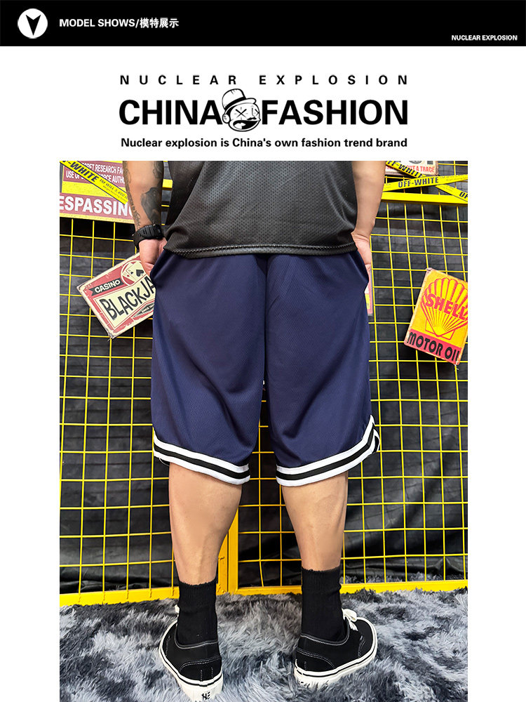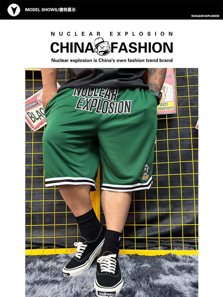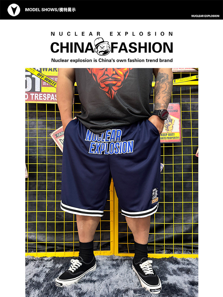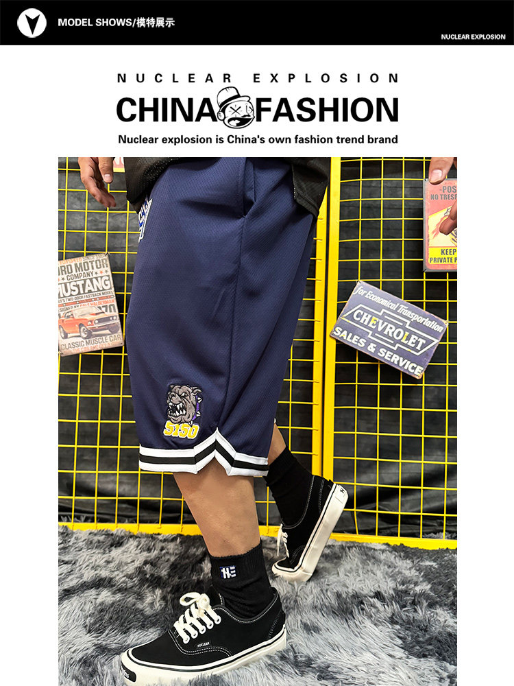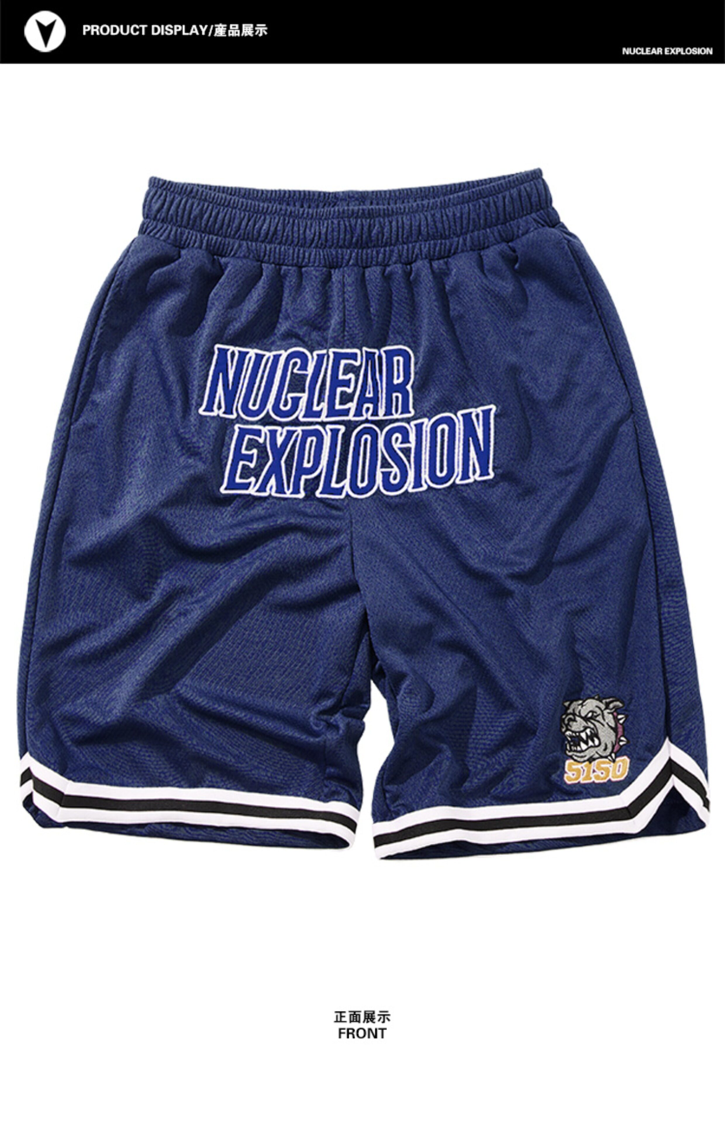 核爆炸美式籃球短褲潮流復古刺綉冰絲寬鬆大碼松緊腰六分運動褲男
