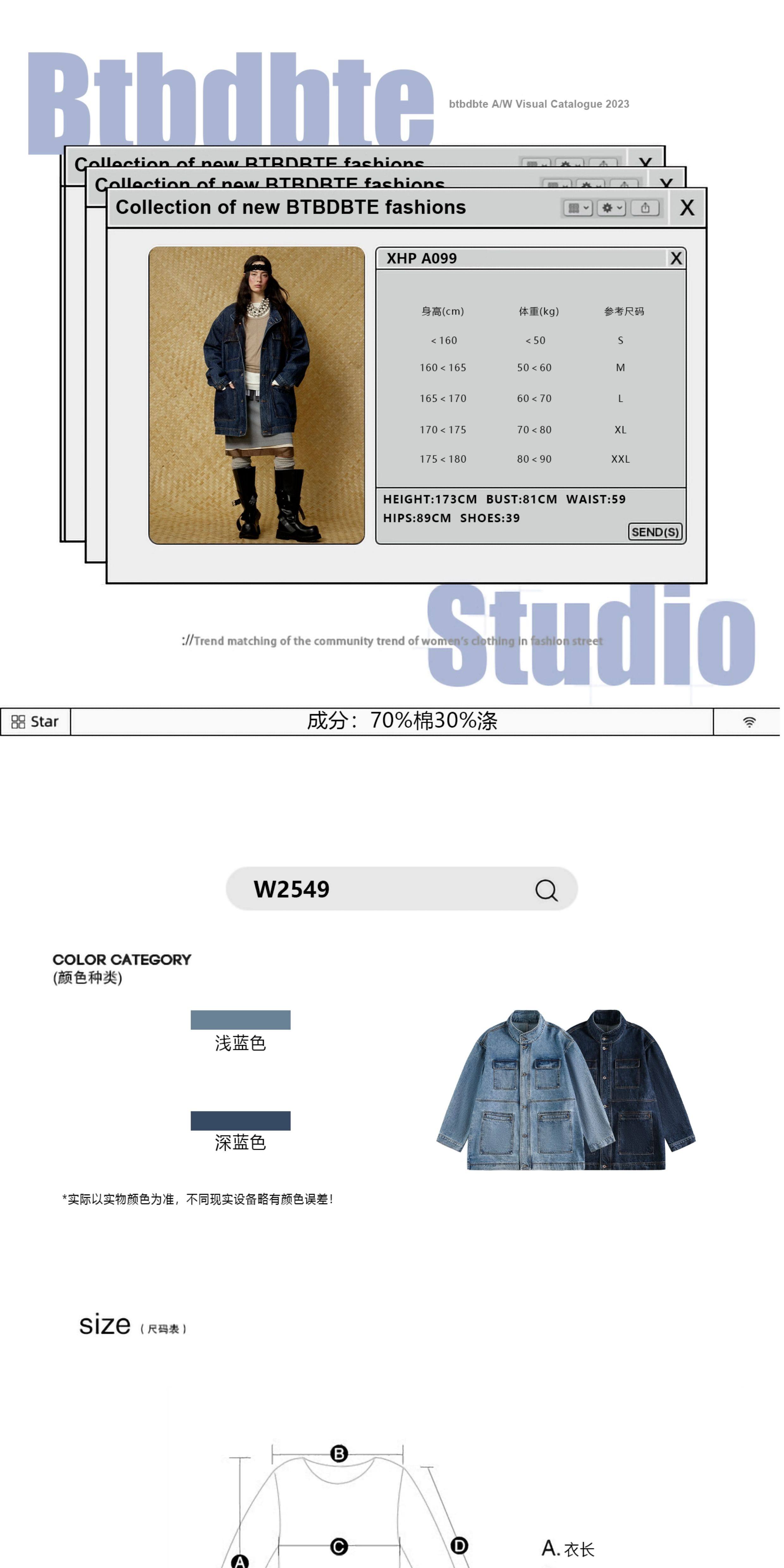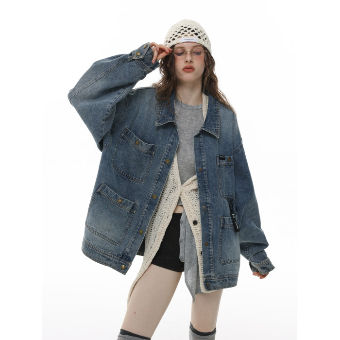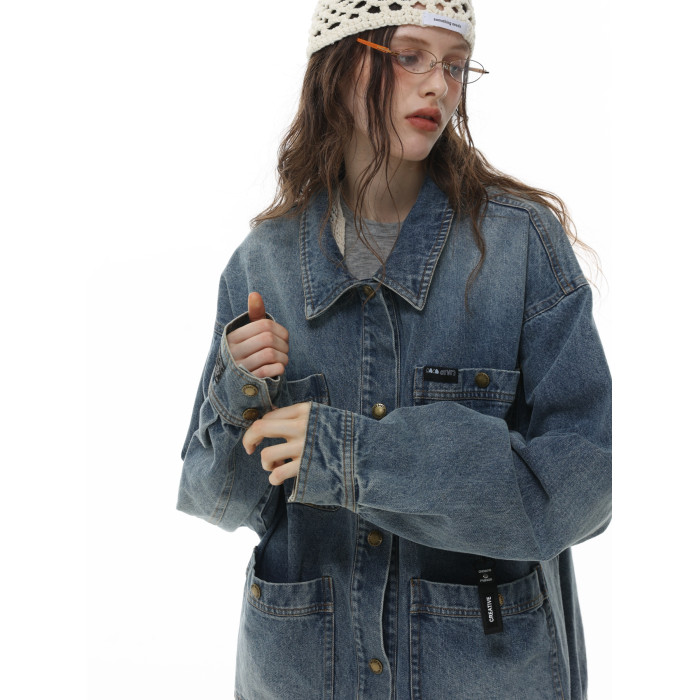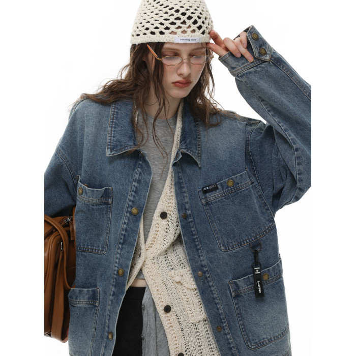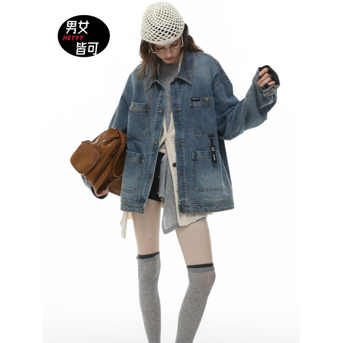 HETYY復古藍色牛仔外套男女同款2025秋季新款多口袋設計減齡上衣