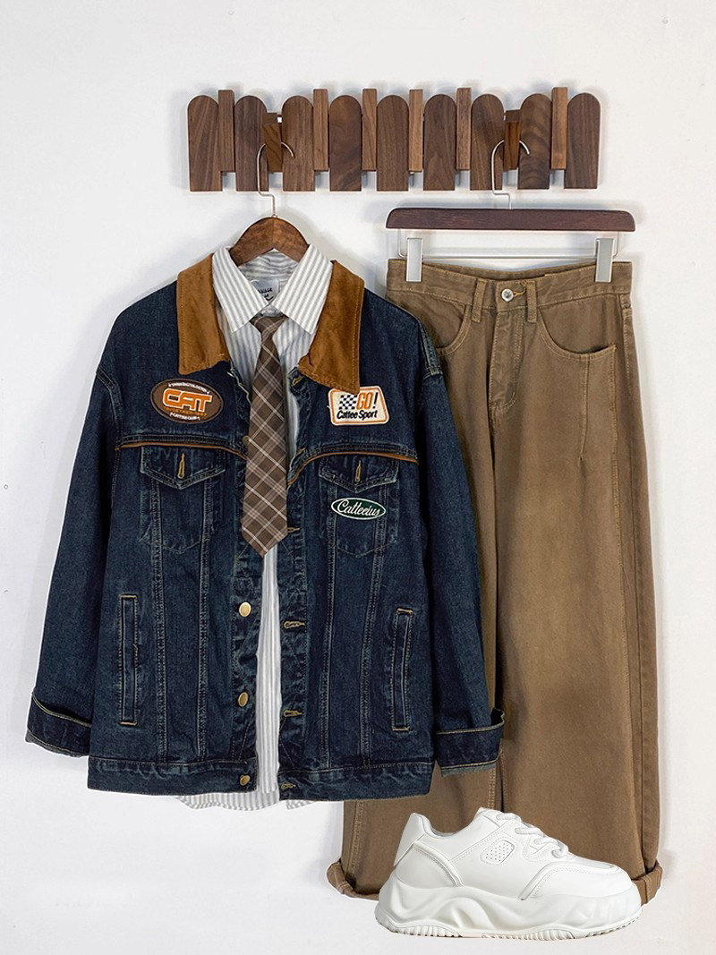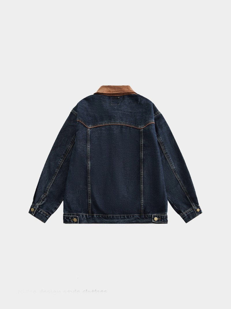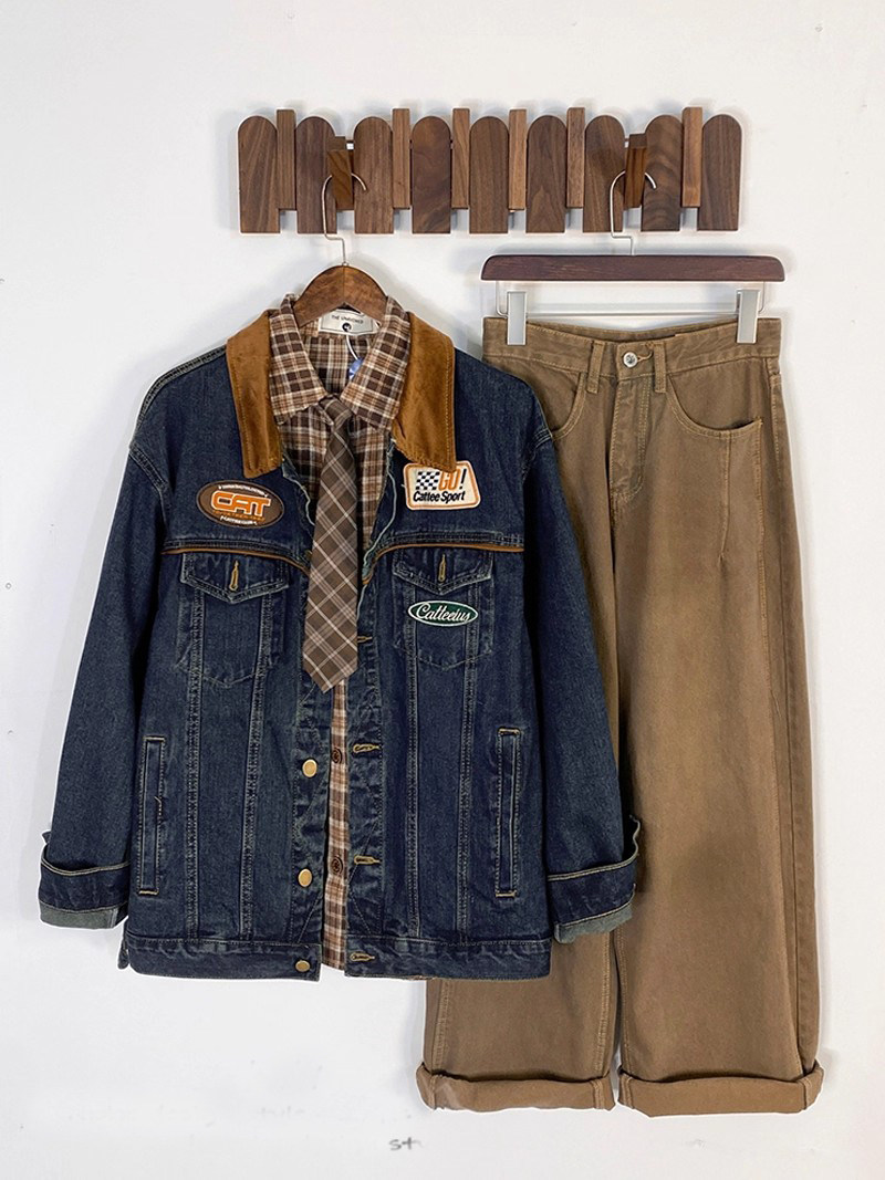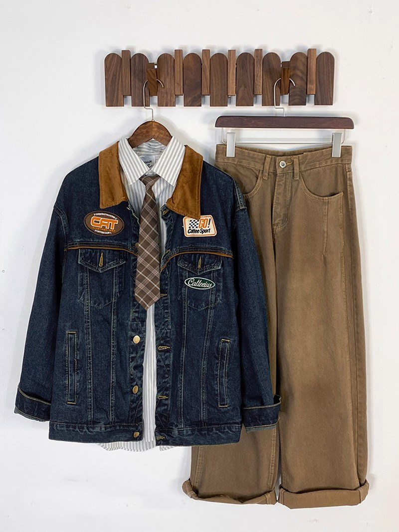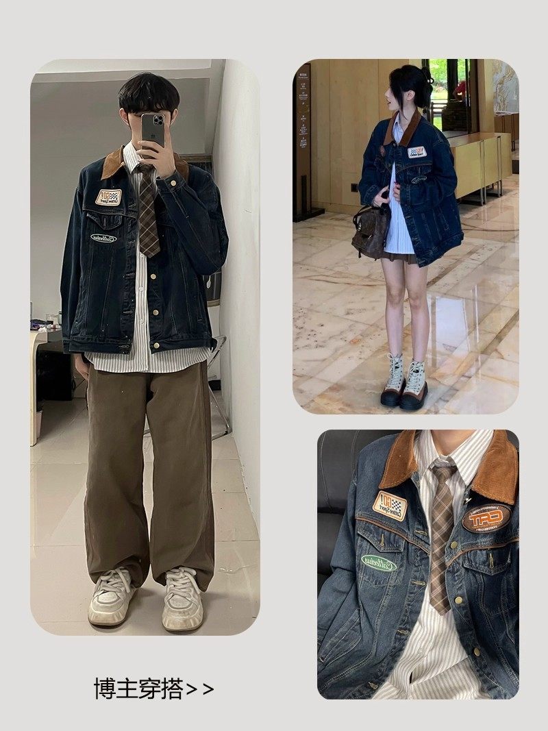 潮牌日系復古刺綉繙領牛仔外套男女潮牌vintage古著帥氣夾克上衣
