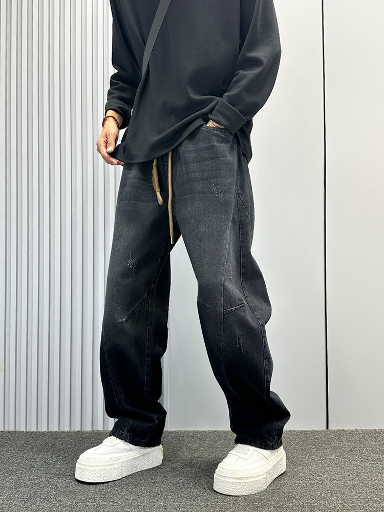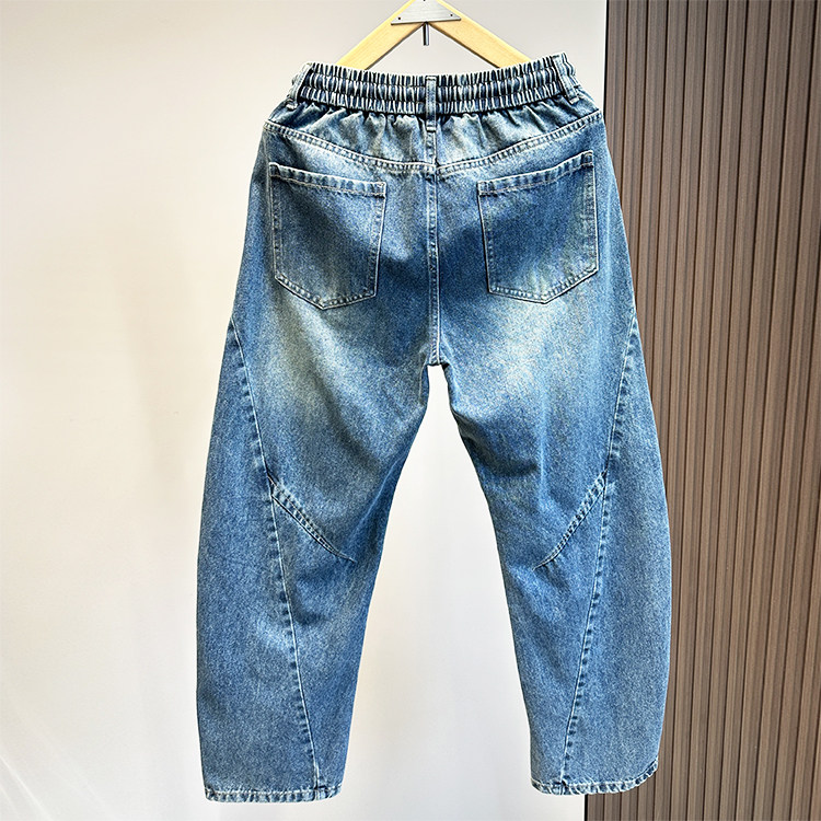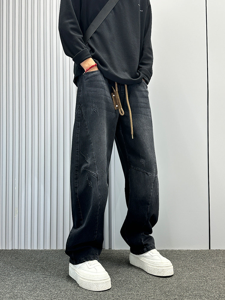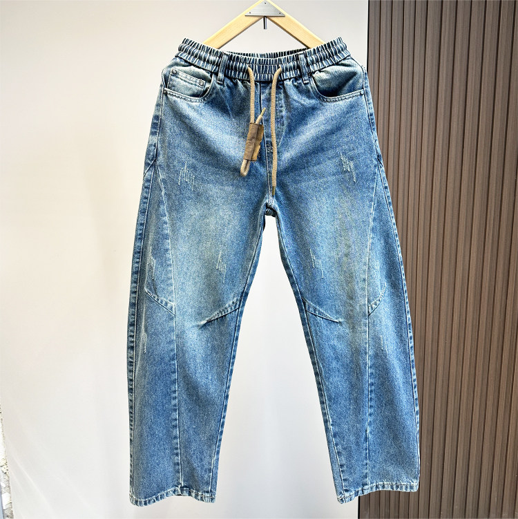 男褲秋季新款藍色松緊彎刀牛仔褲男款美式潮牌立體拼接寬鬆直筒褲