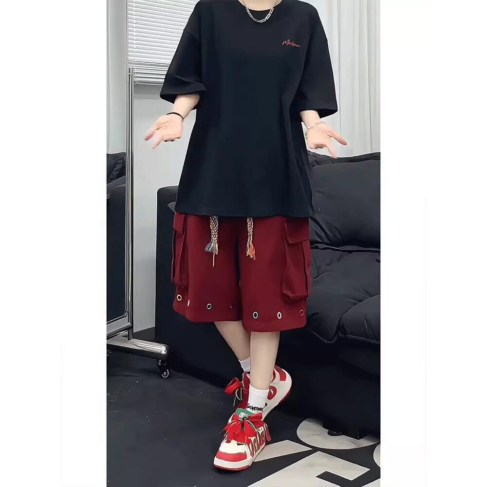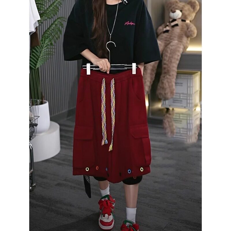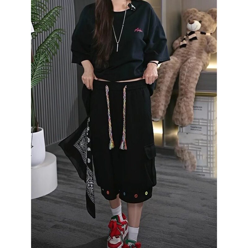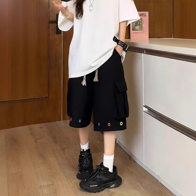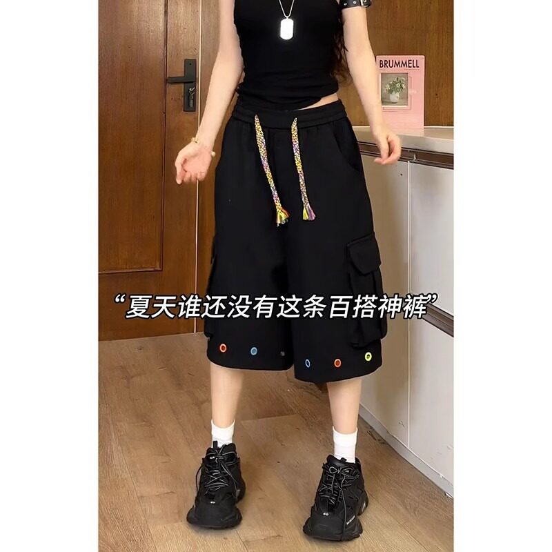 彩色編織抽繩工裝短褲男女款夏季薄款大口袋直筒休閒六分七分褲子