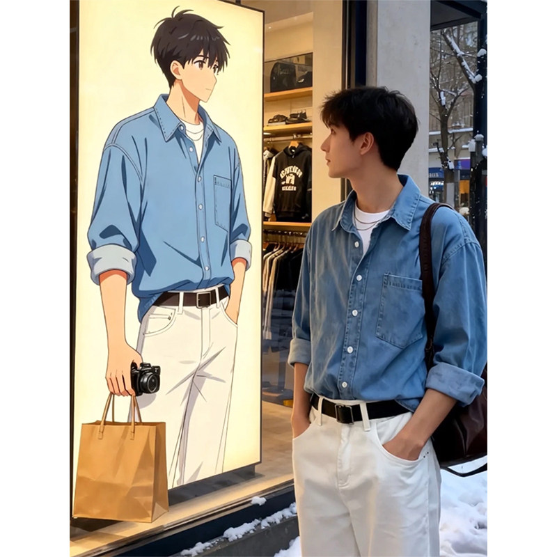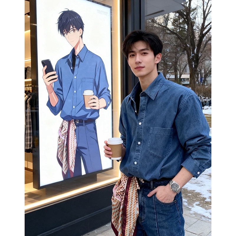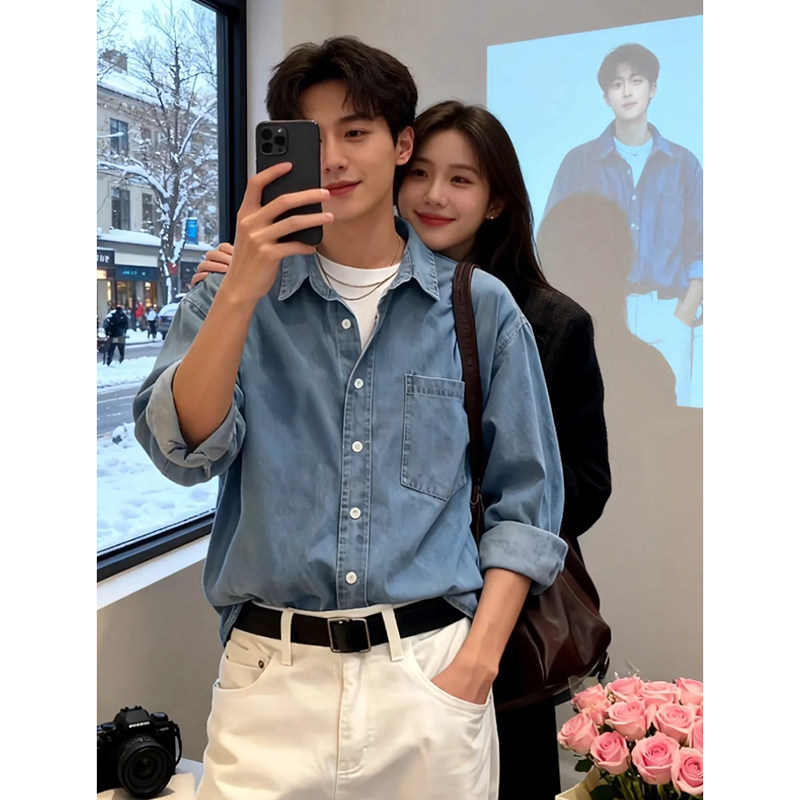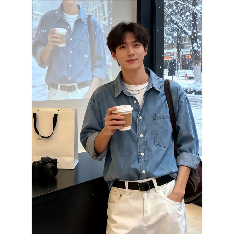cleanfit藍色韓系牛仔襯衫男款秋冬季高級感長袖襯衣繙領工裝外套