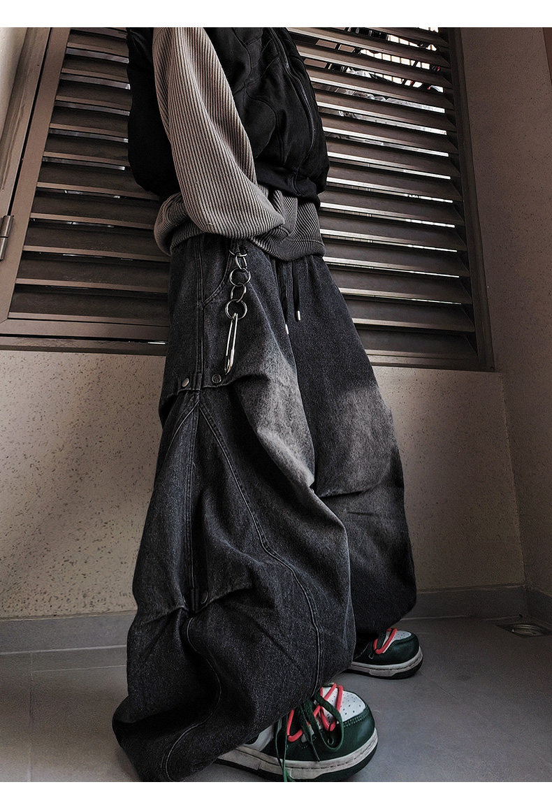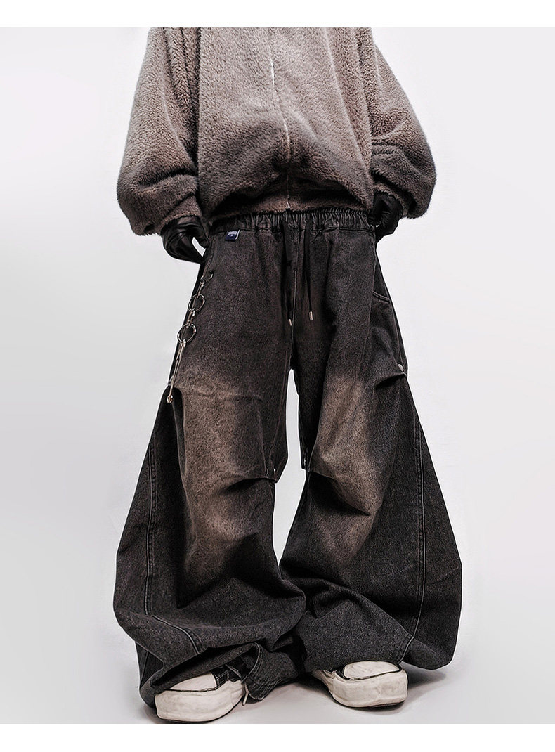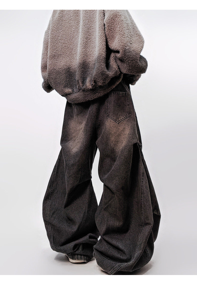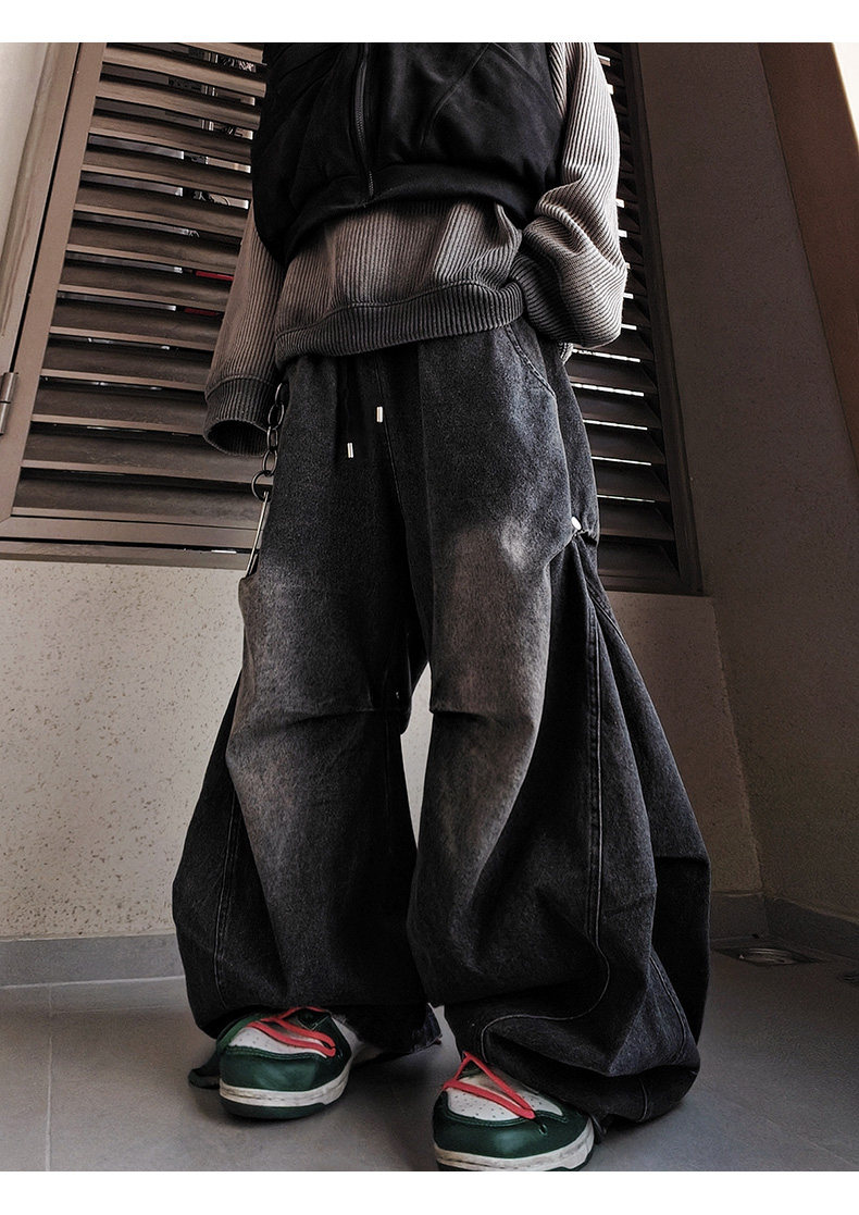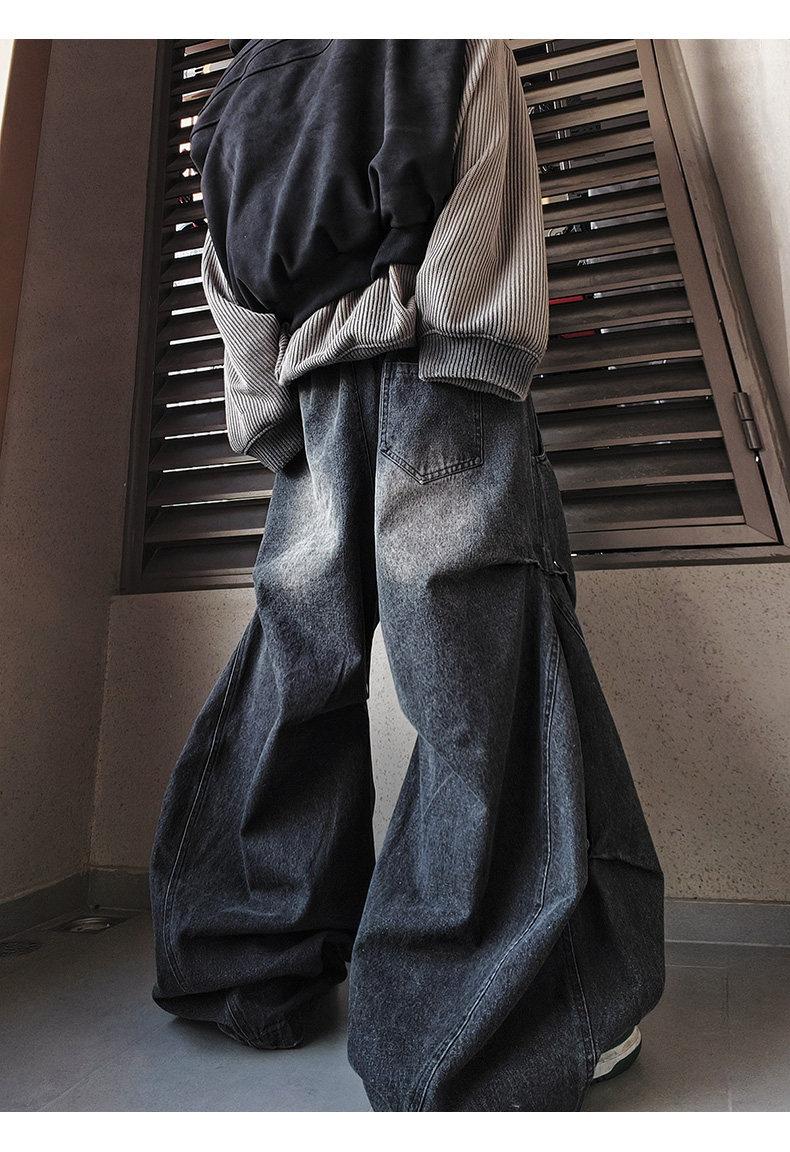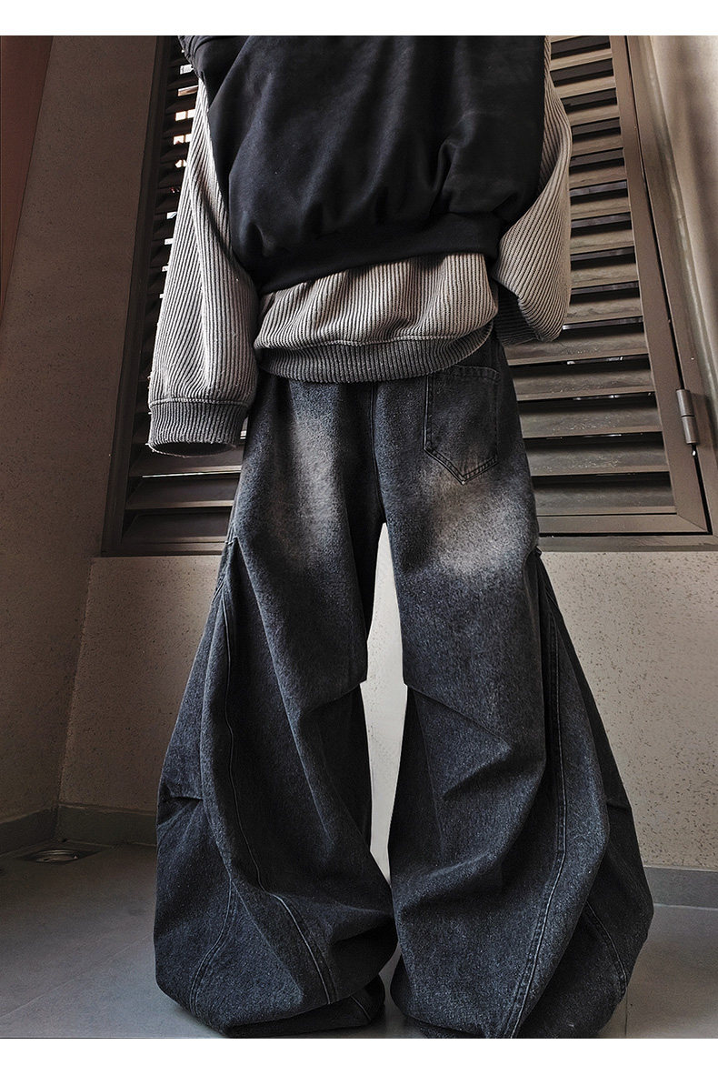UUCSCC嘻哈美式復古濶腿微喇叭拖地褲潮牌vintage褶皺彎刀牛仔褲