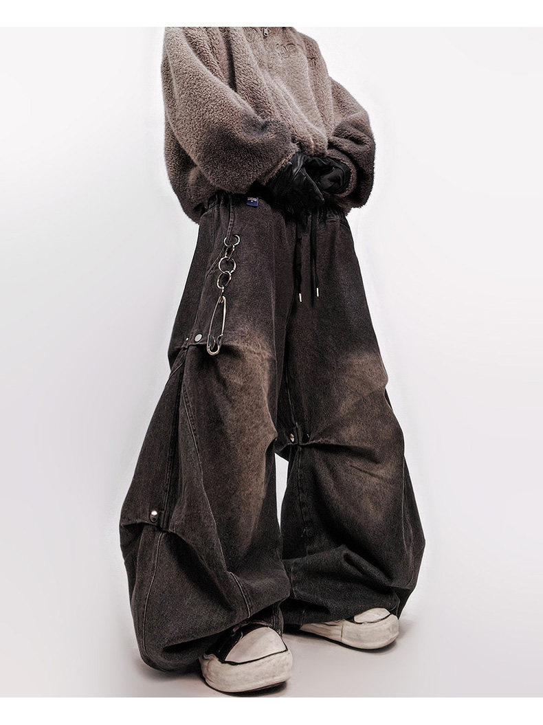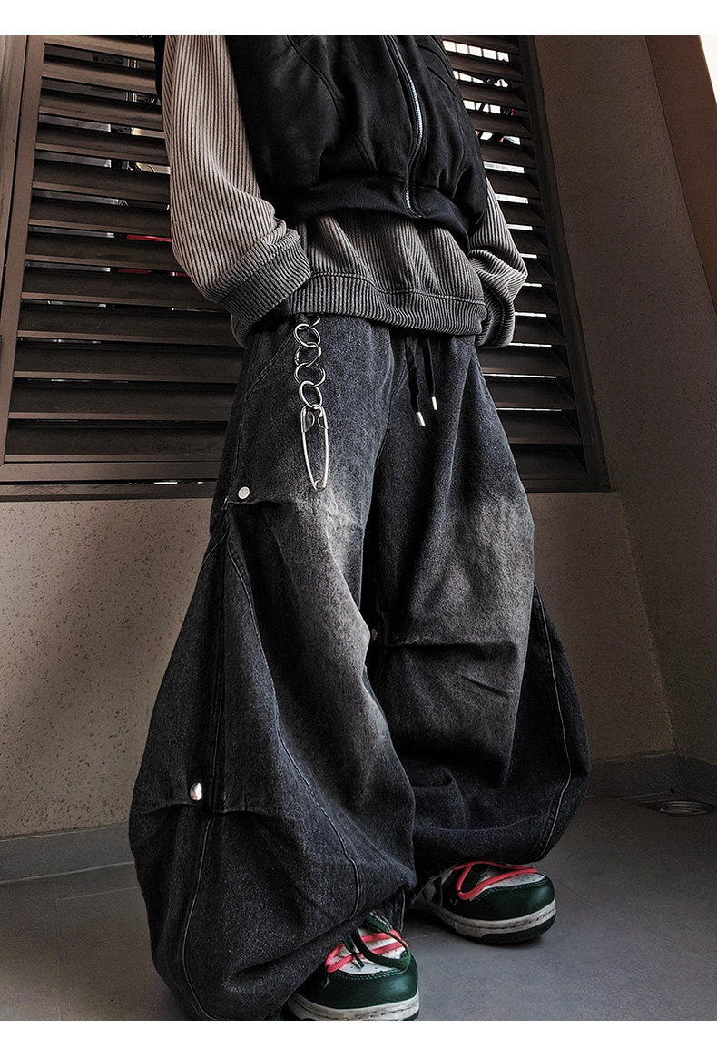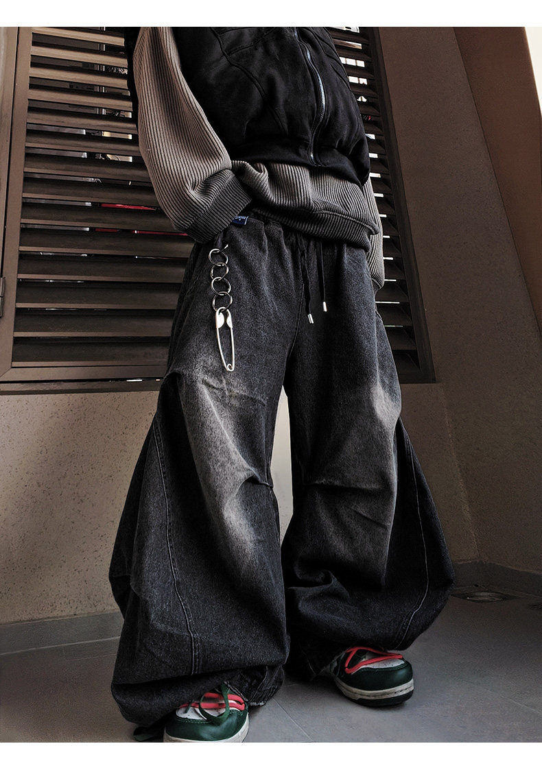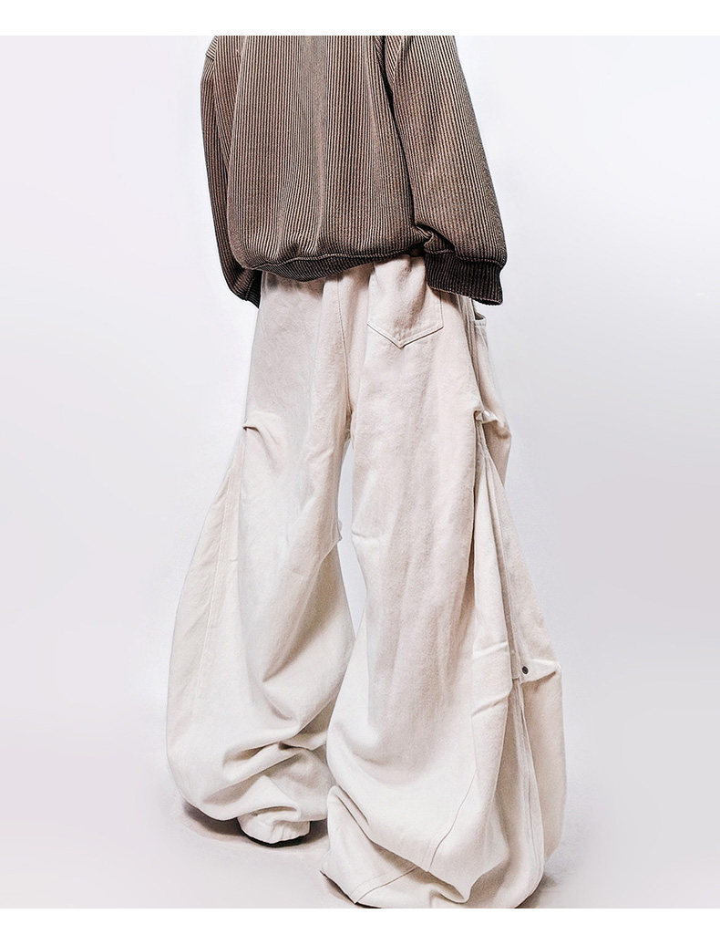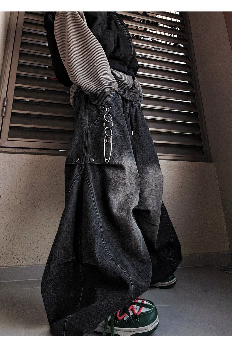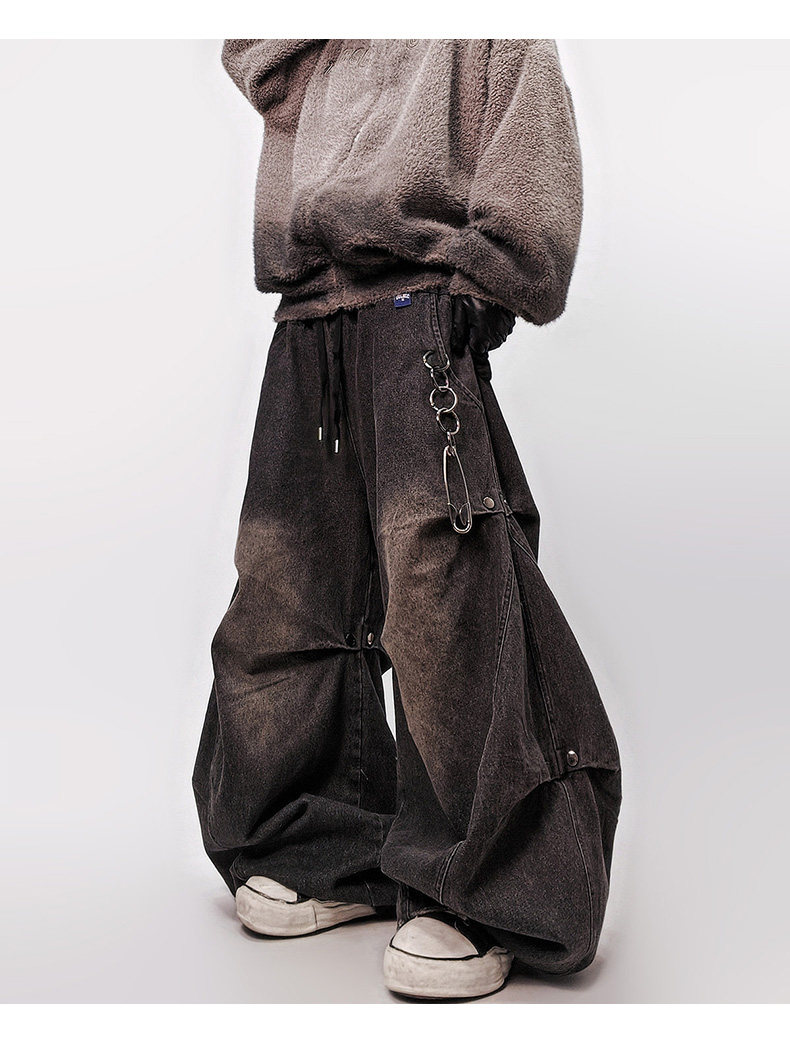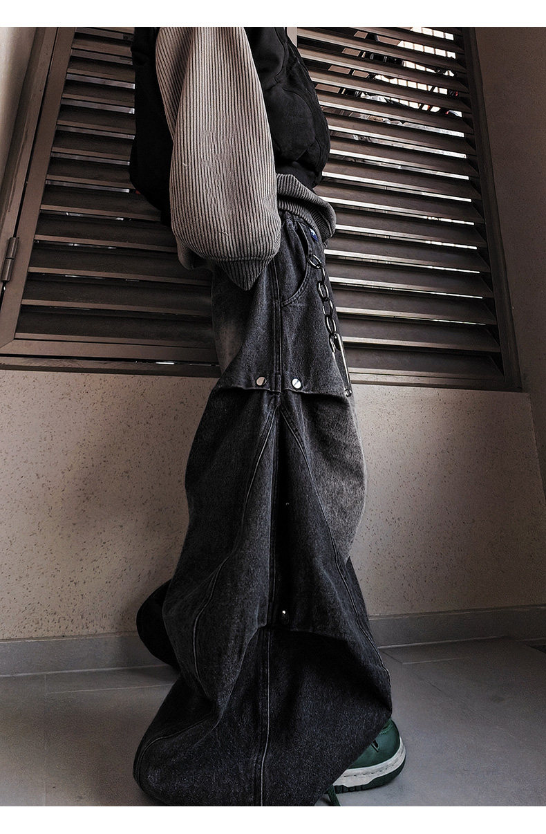 UUCSCC嘻哈美式復古濶腿微喇叭拖地褲潮牌vintage褶皺彎刀牛仔褲