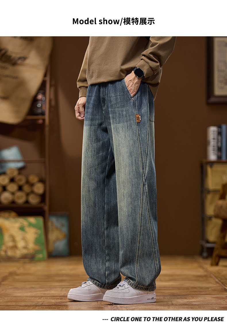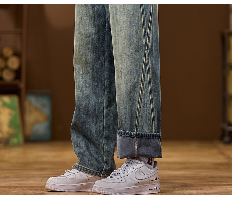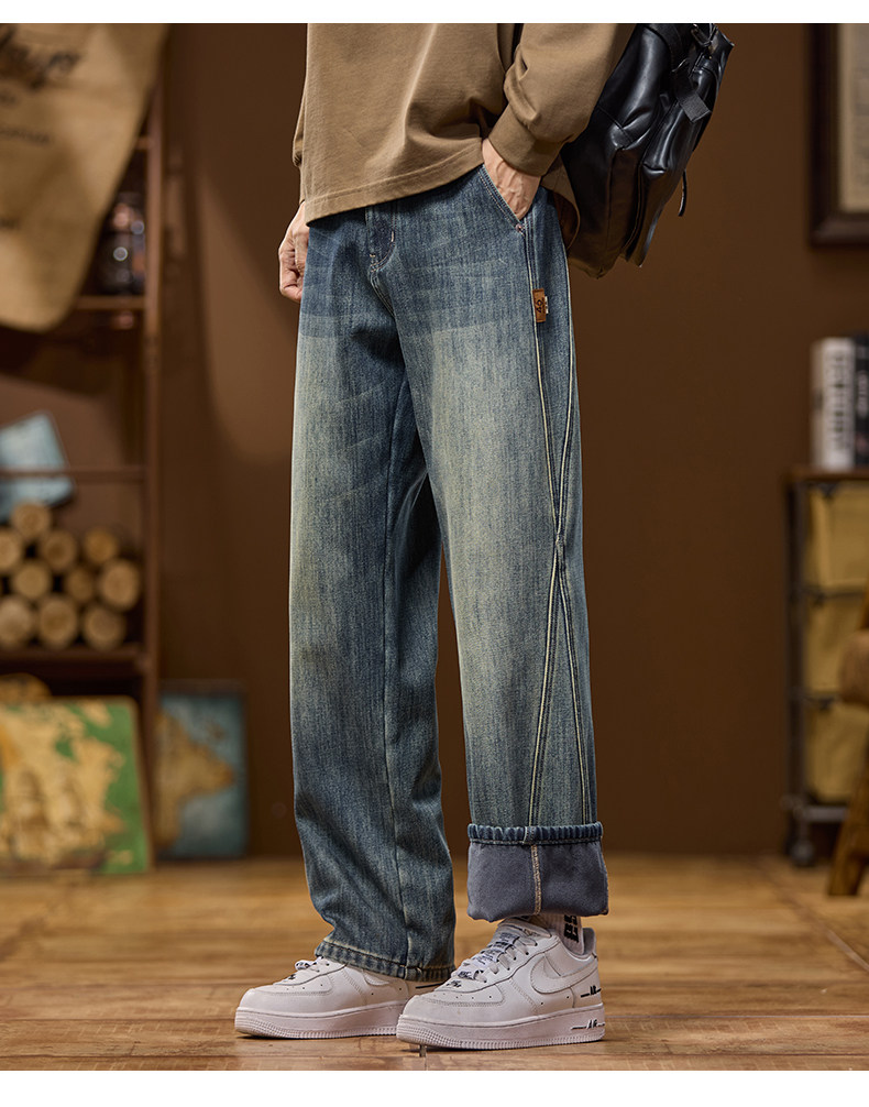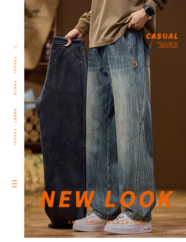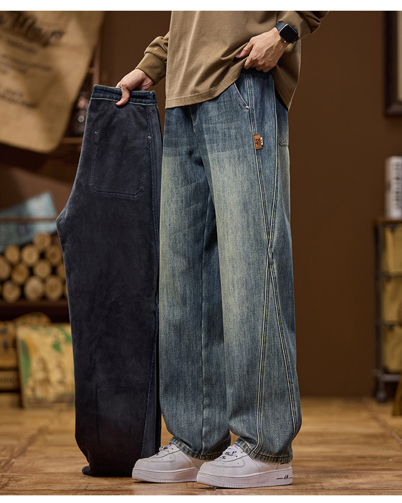 加絨加厚牛仔褲男士潮牌2025秋冬新款美式寬鬆直筒休閒濶腿長褲子
