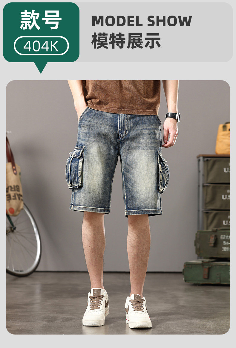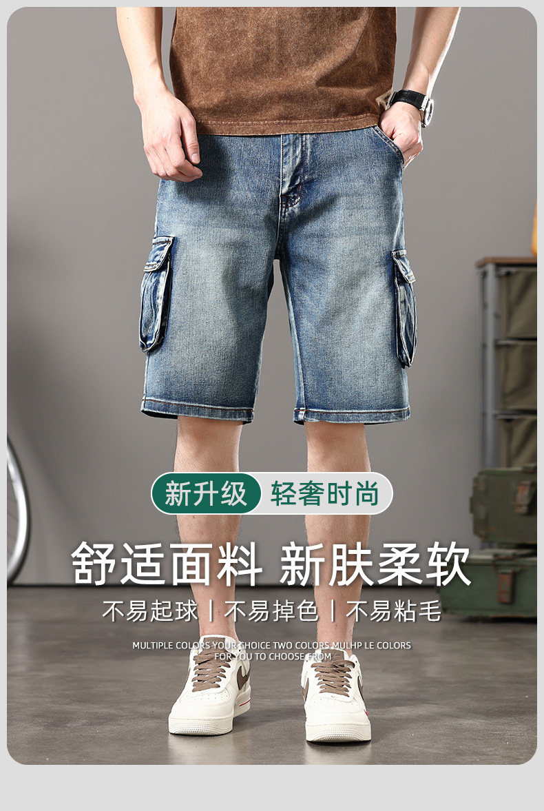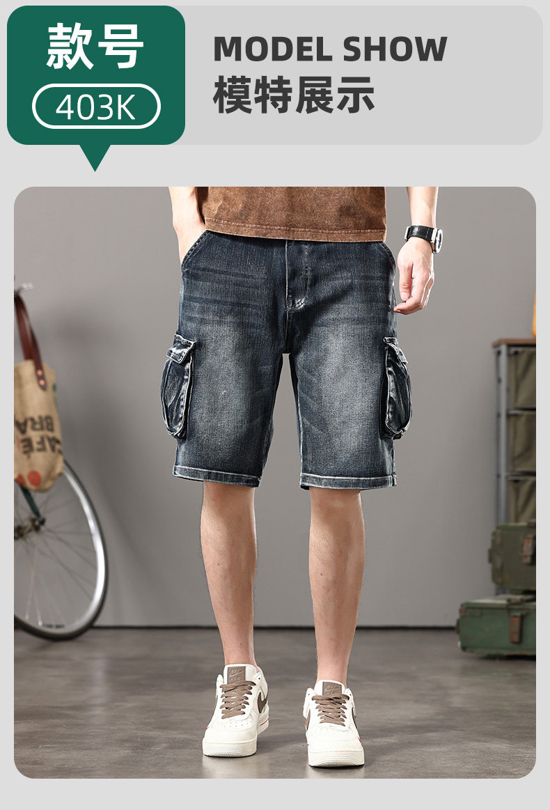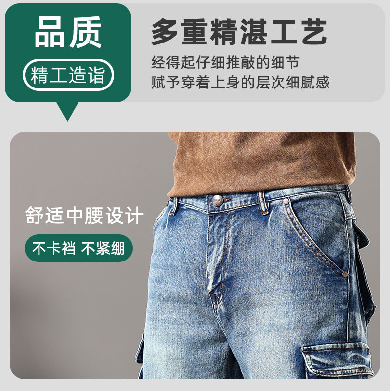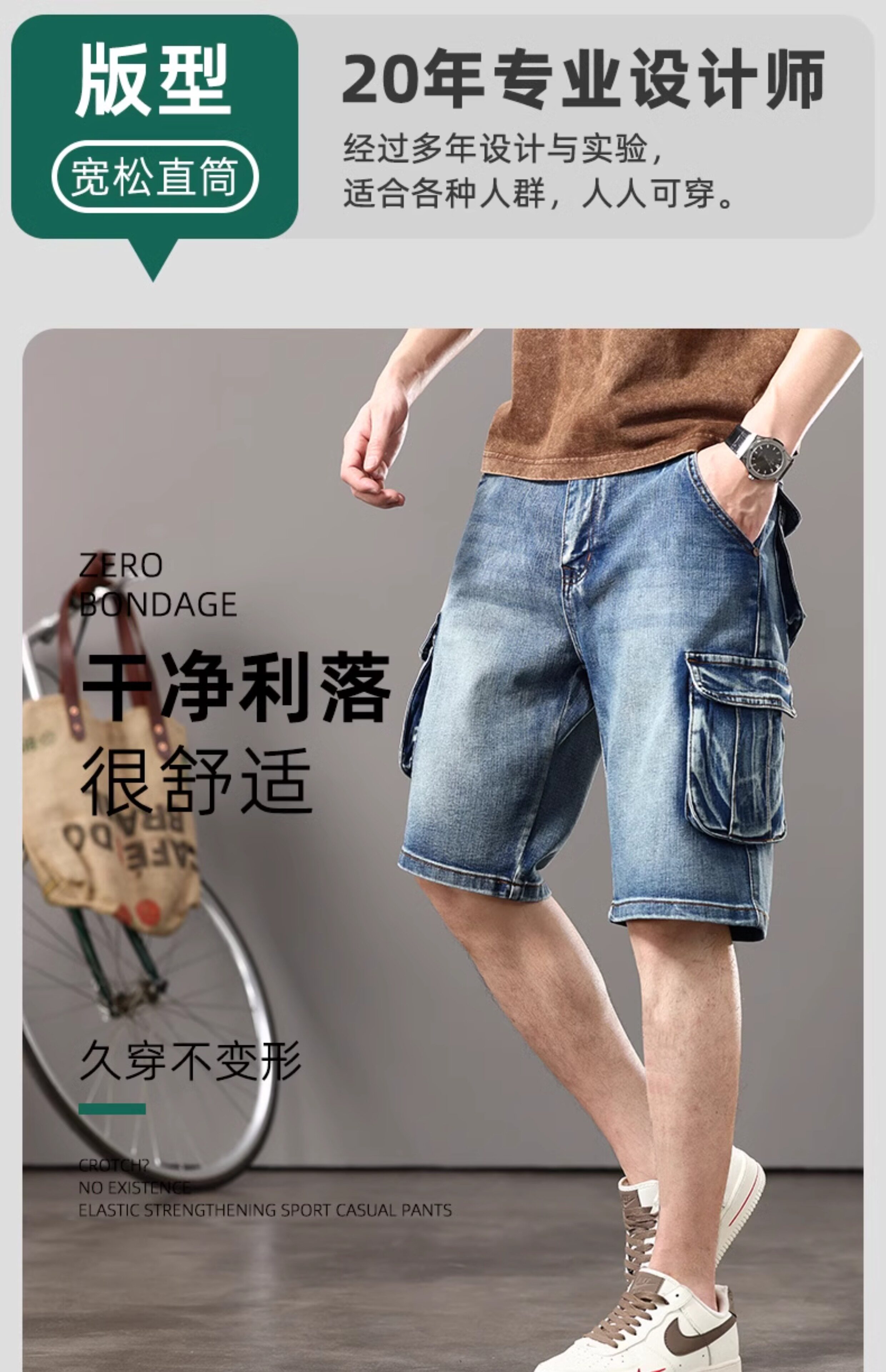 2025美式微彈工裝短褲男士夏季潮牌寬鬆大碼中褲多口袋牛仔五分褲