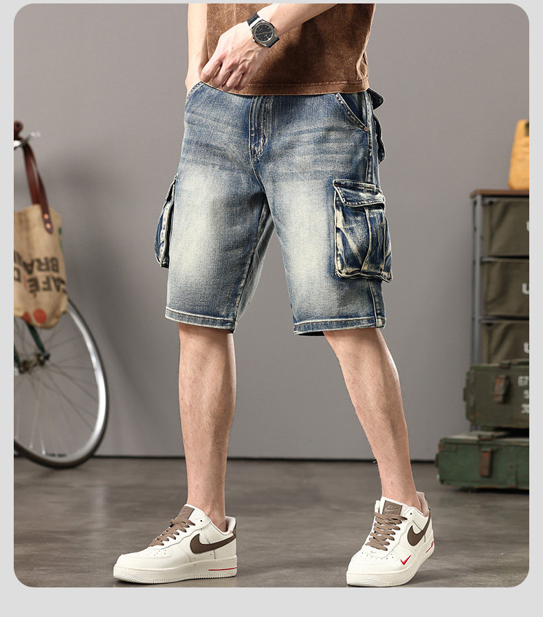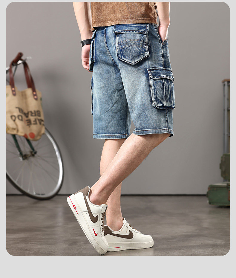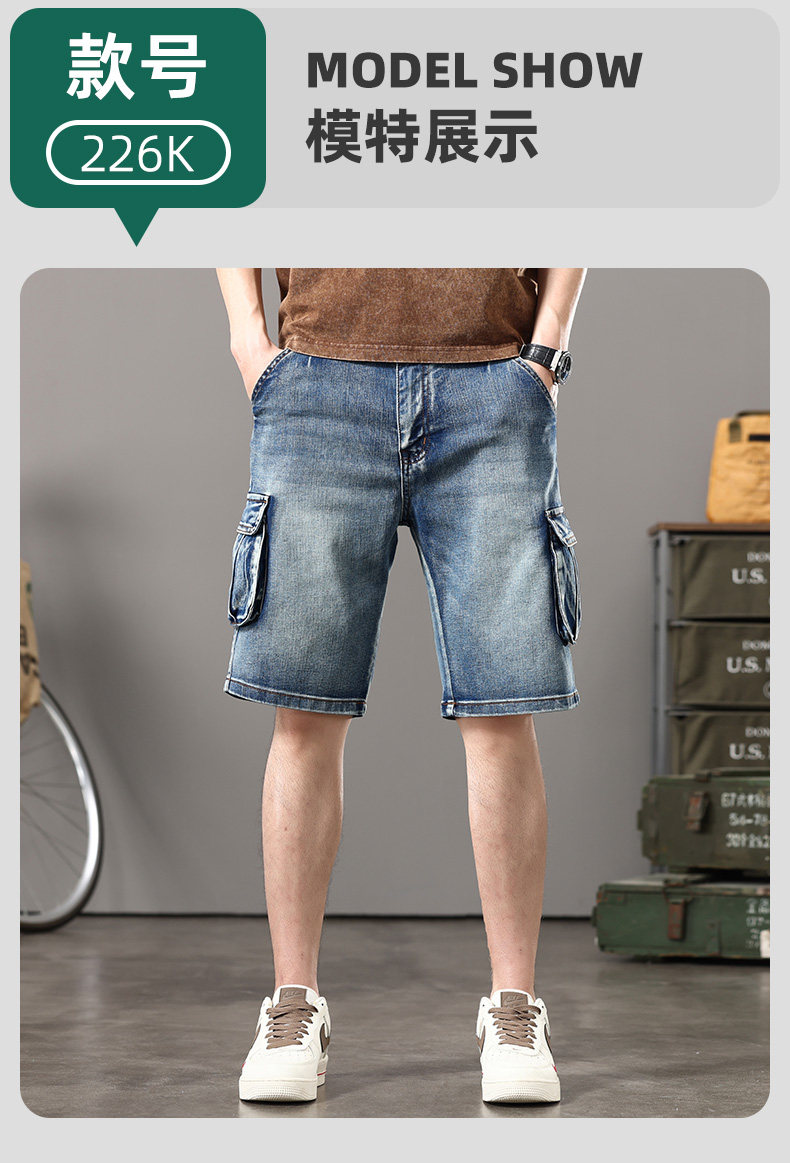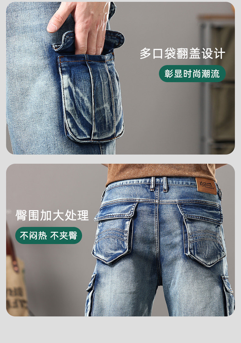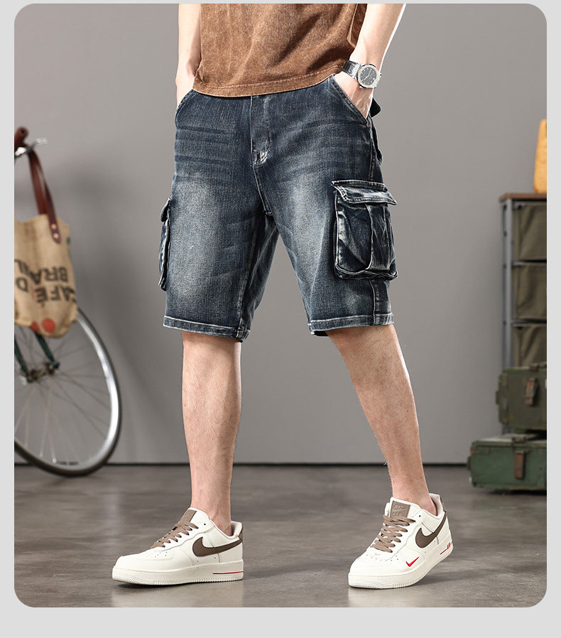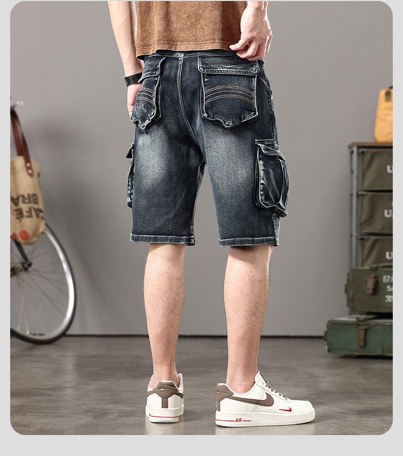 2025美式微彈工裝短褲男士夏季潮牌寬鬆大碼中褲多口袋牛仔五分褲
