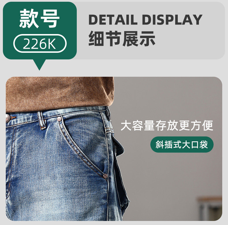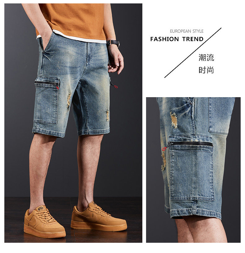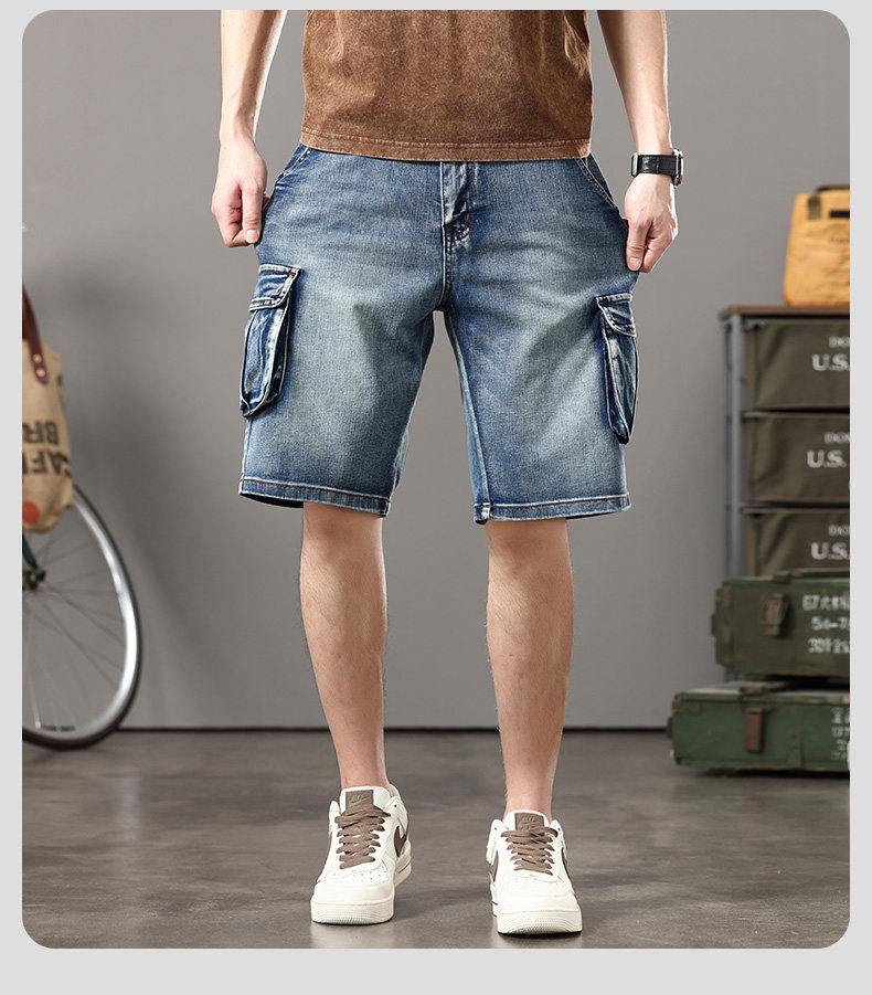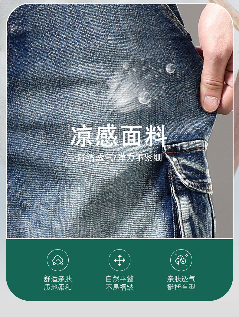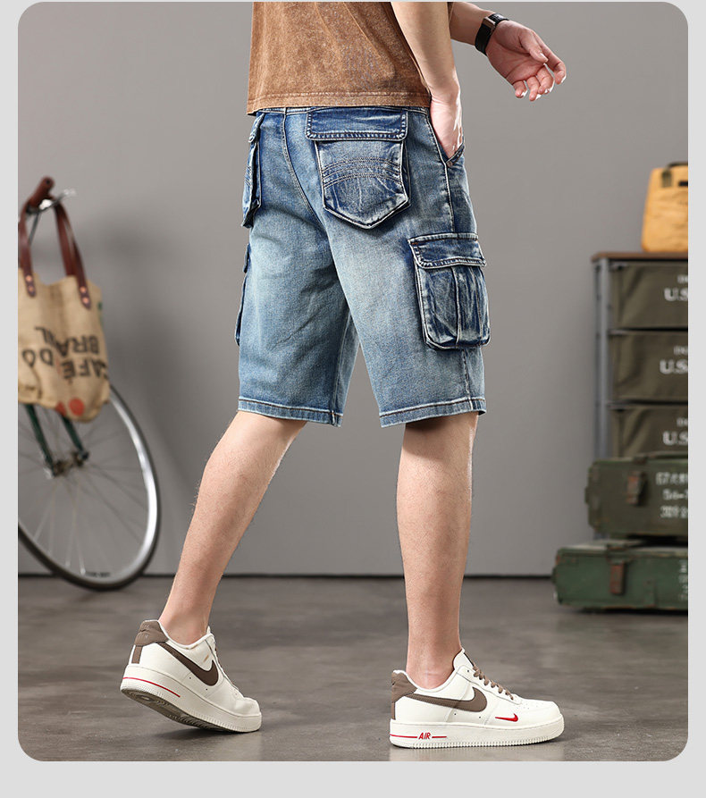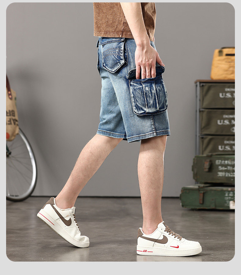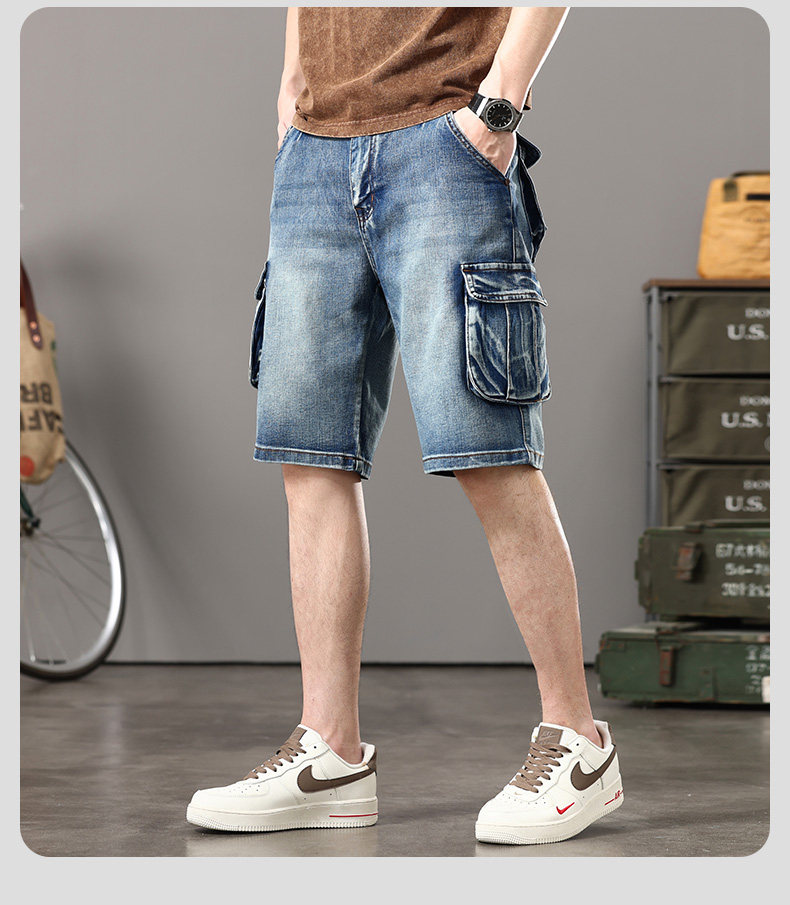 2025美式微彈工裝短褲男士夏季潮牌寬鬆大碼中褲多口袋牛仔五分褲