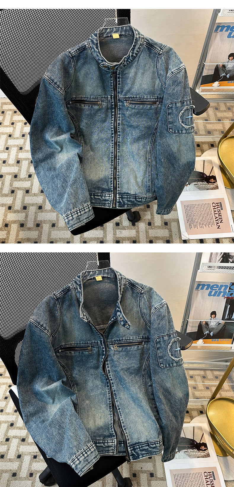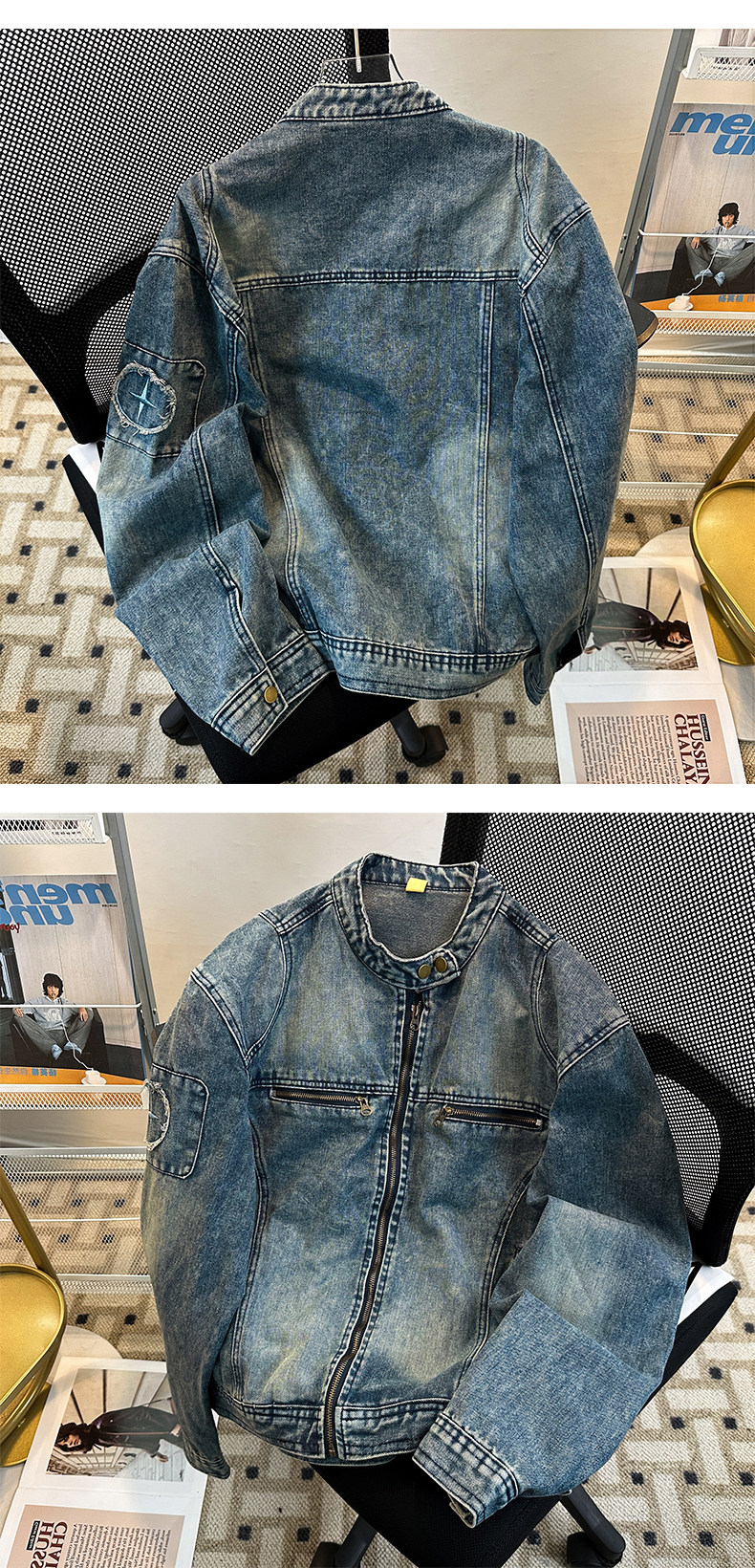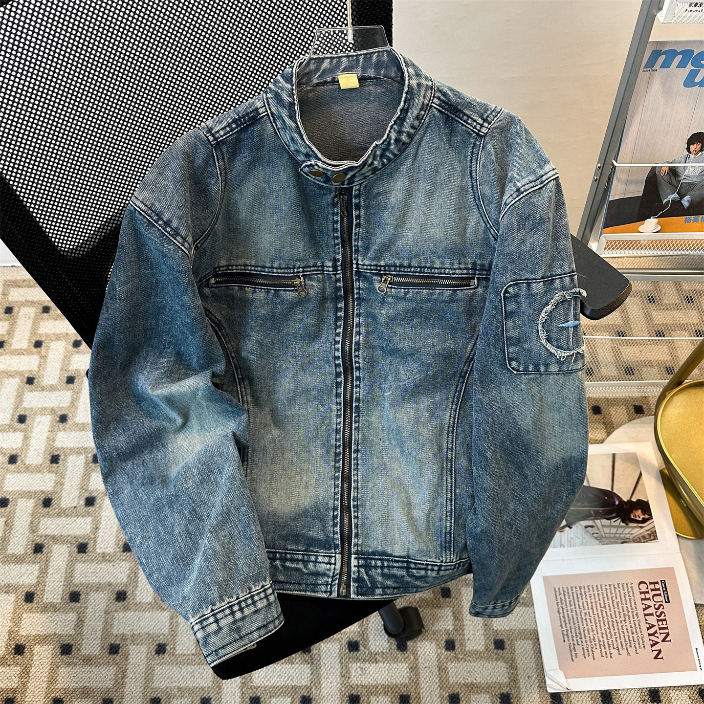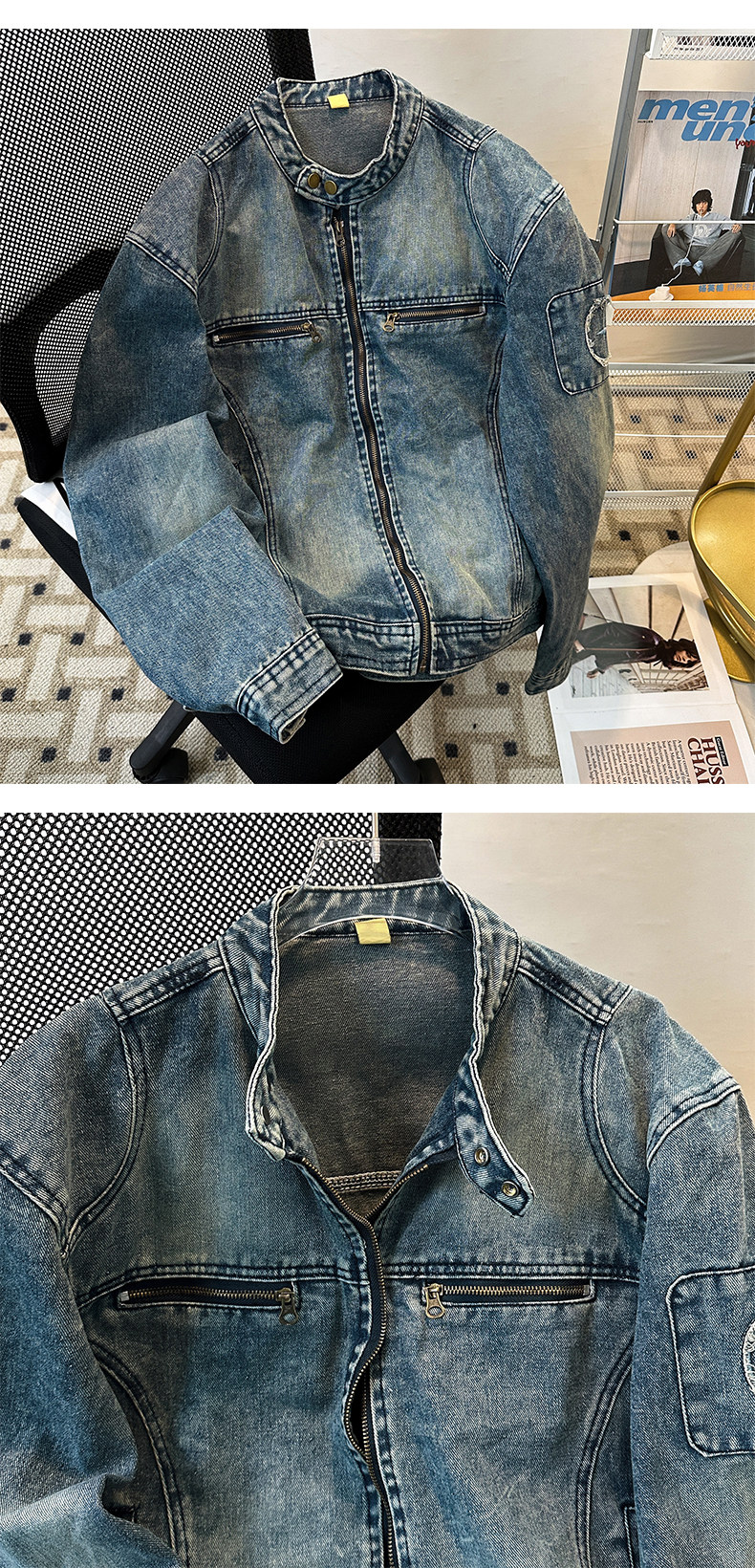 美式高街機車風立領牛仔外套男春秋季潮牌廓形水洗寬鬆設計感夾克