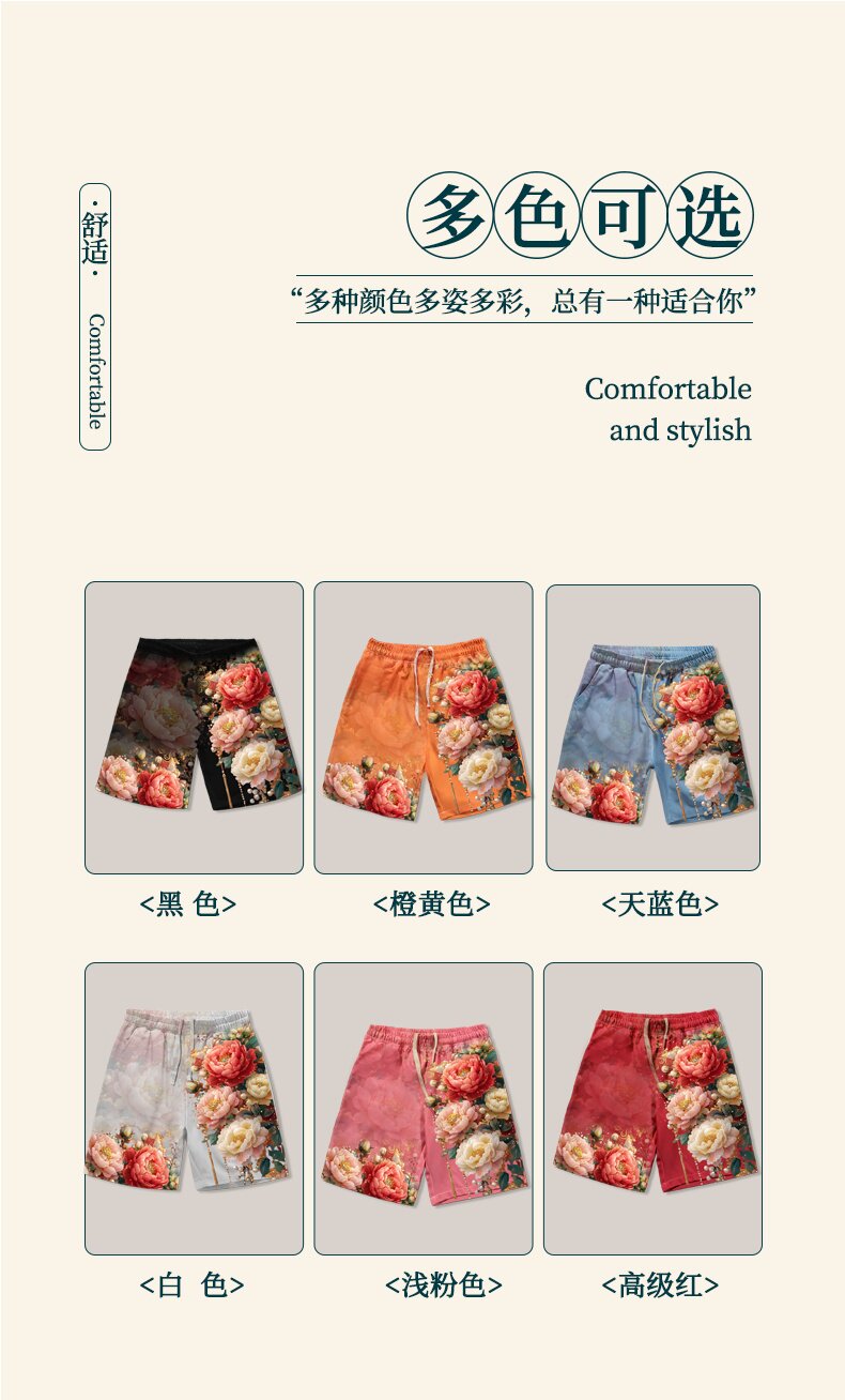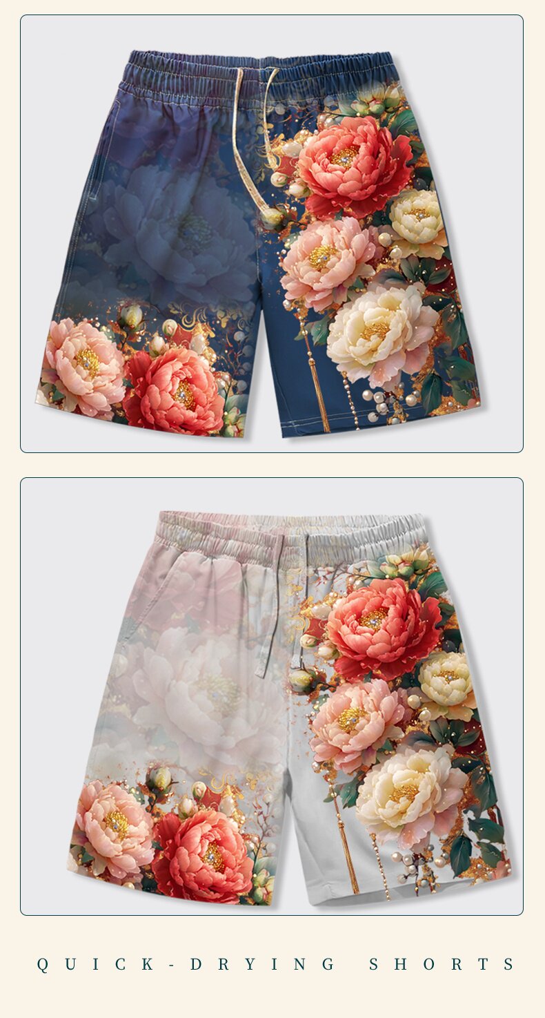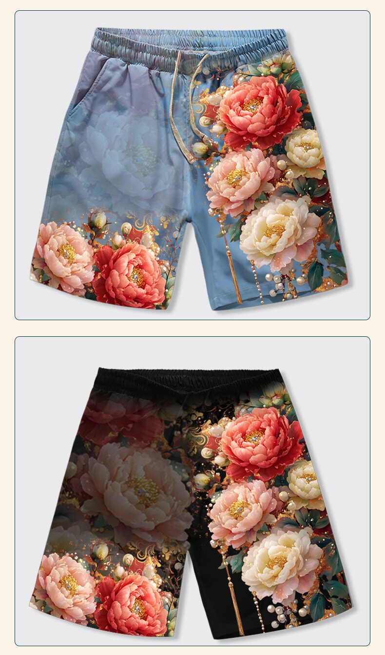 牡丹花國花短褲男夏季富貴牡丹寬鬆直筒五分褲男女沙灘褲有大碼