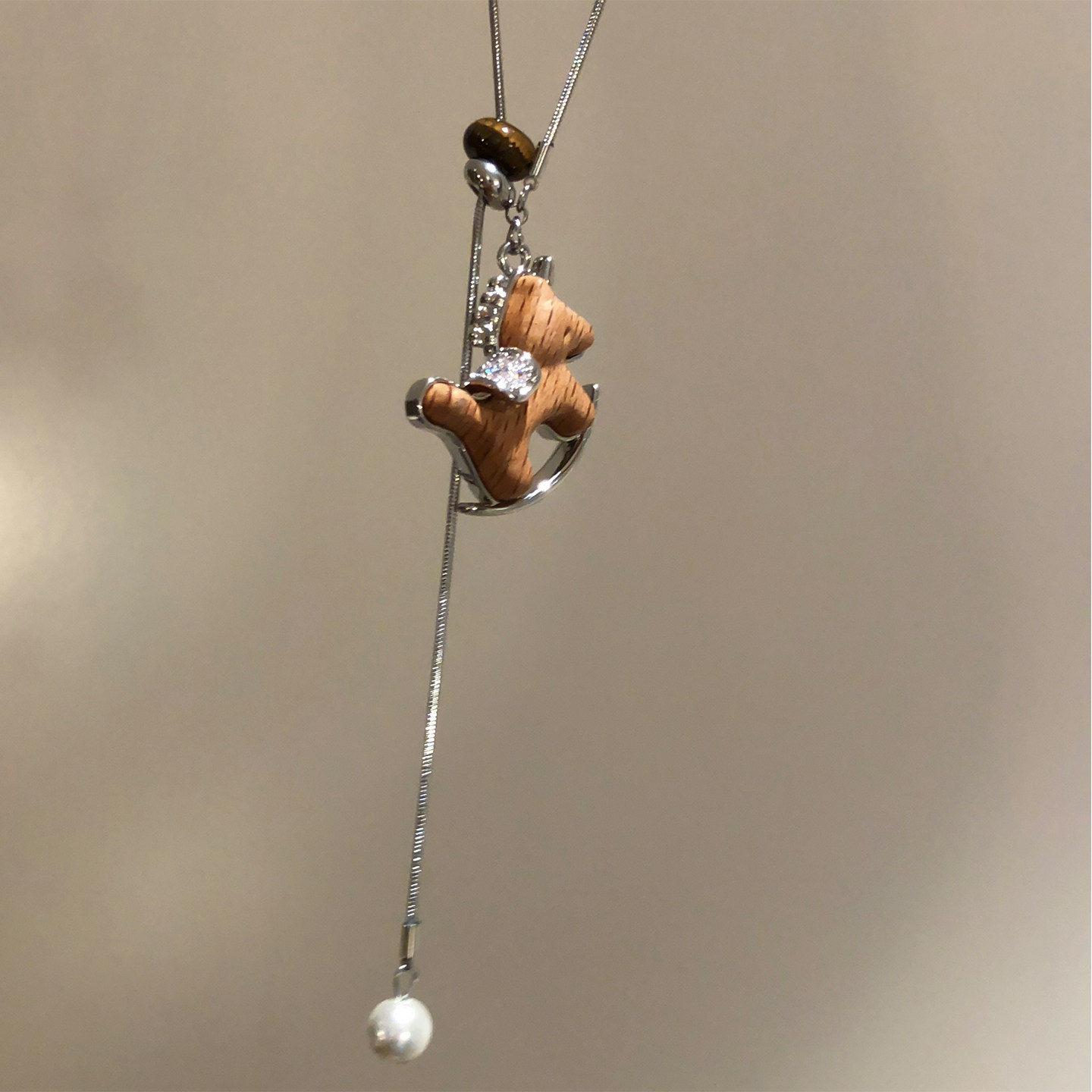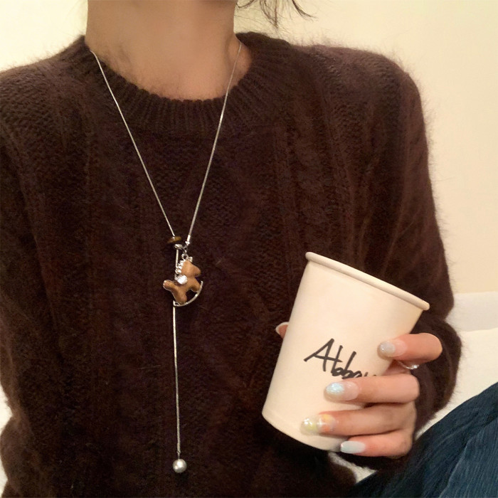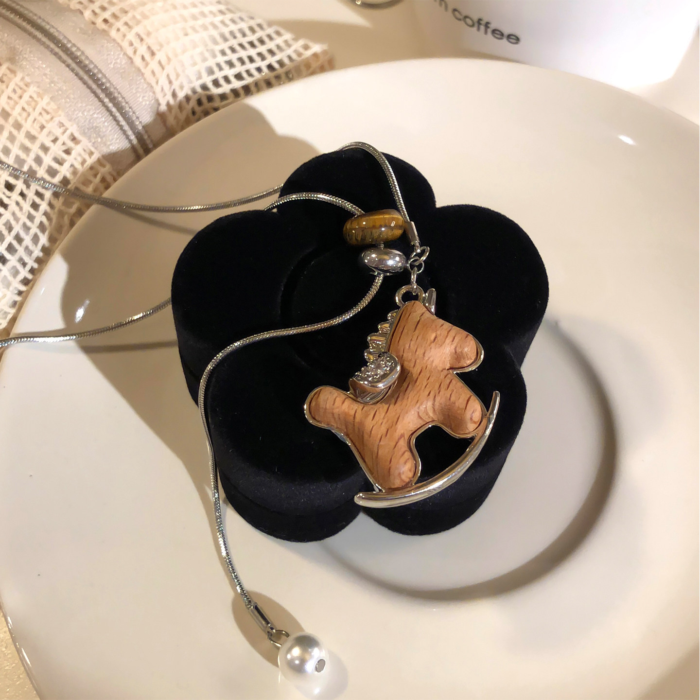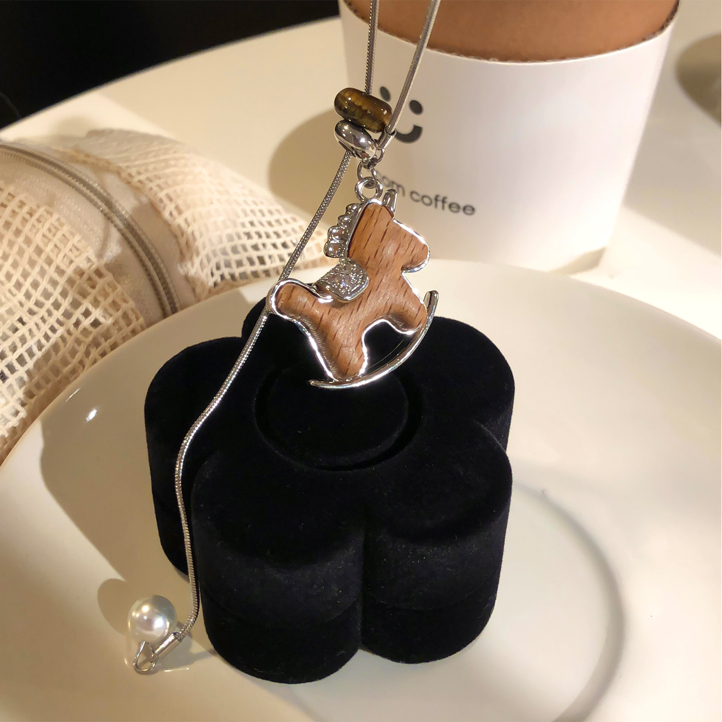 閃鋯咖色木馬吊墜可抽拉項鍊女小衆設計長款頸鏈高級感毛衣鏈配飾
