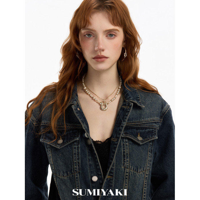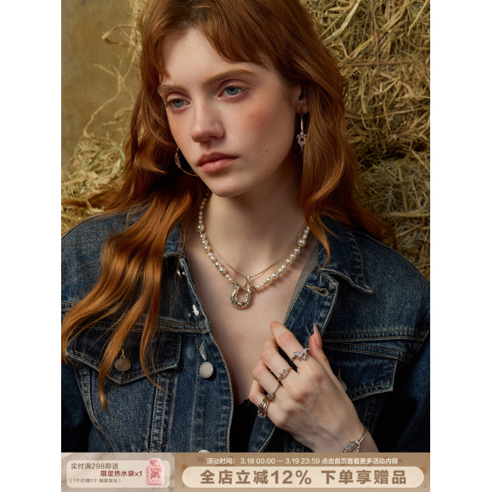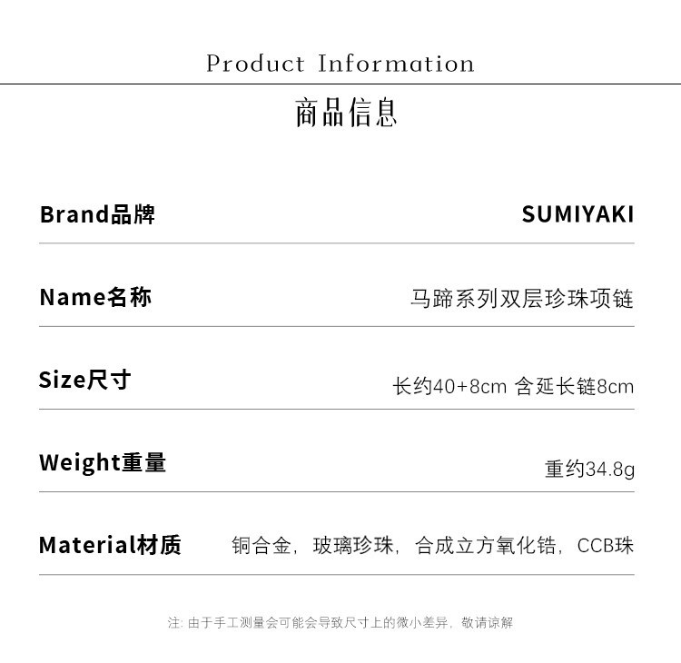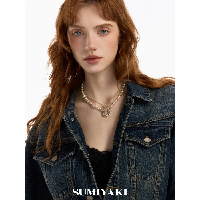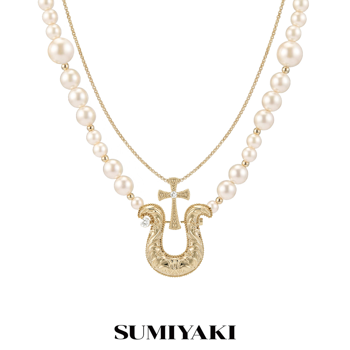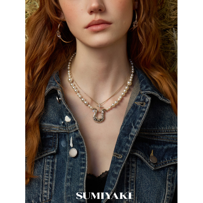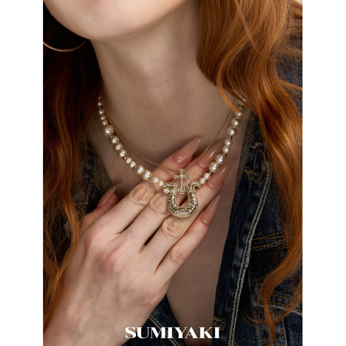 SUMIYAKI 馬年系列浮雕花紋馬蹄釦雙層珍珠項鍊十字架曡戴鎖骨鍊