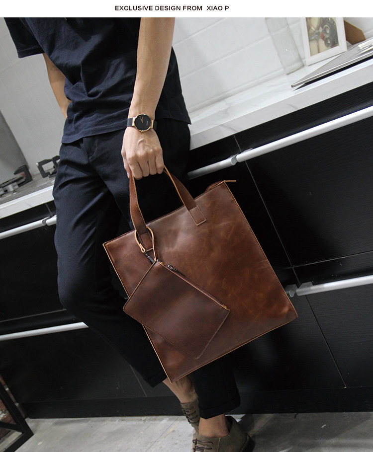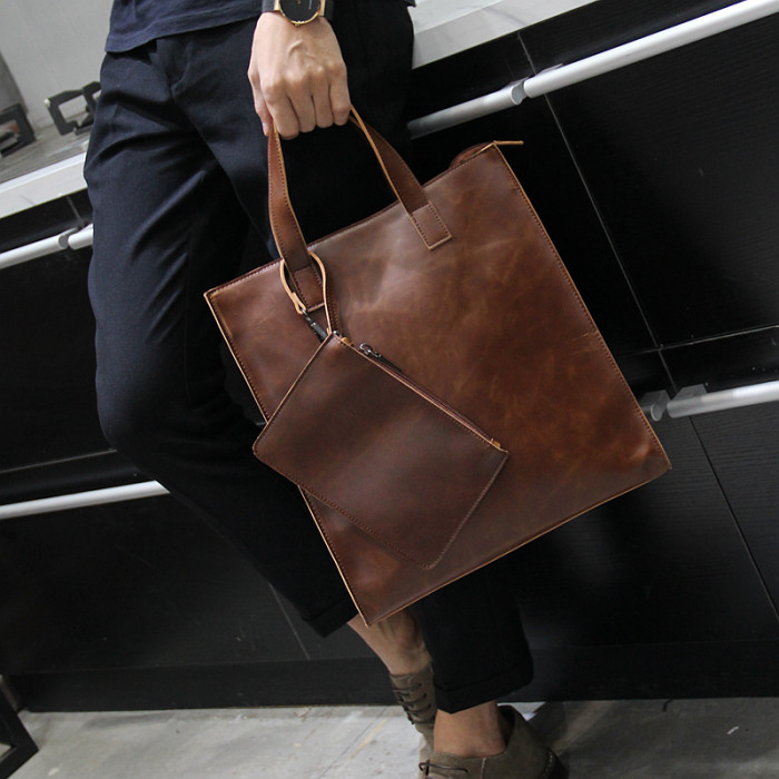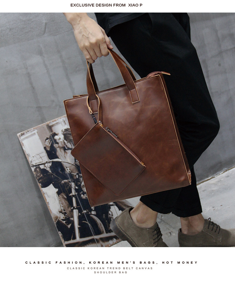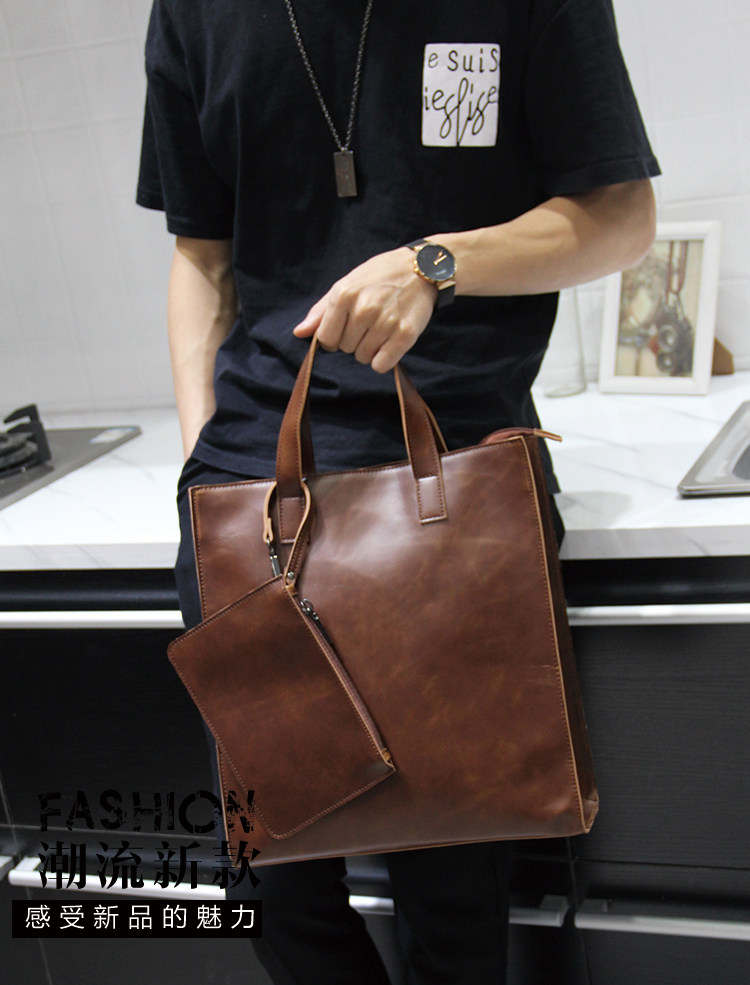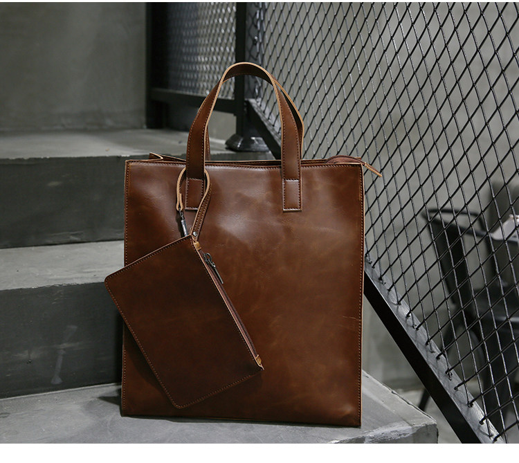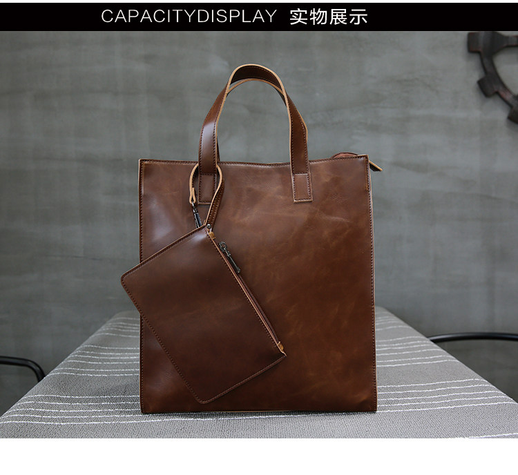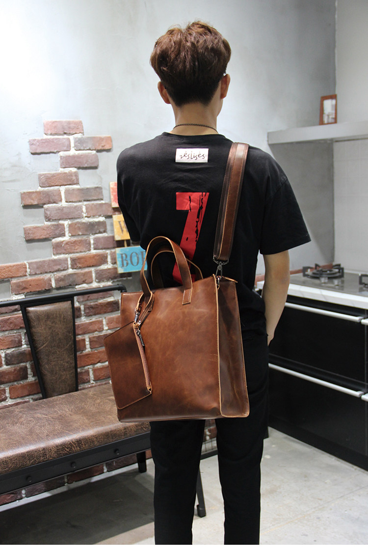 英倫復古商務手提包休閒時尚瘋馬皮郵差單肩斜背托特包男tote包
