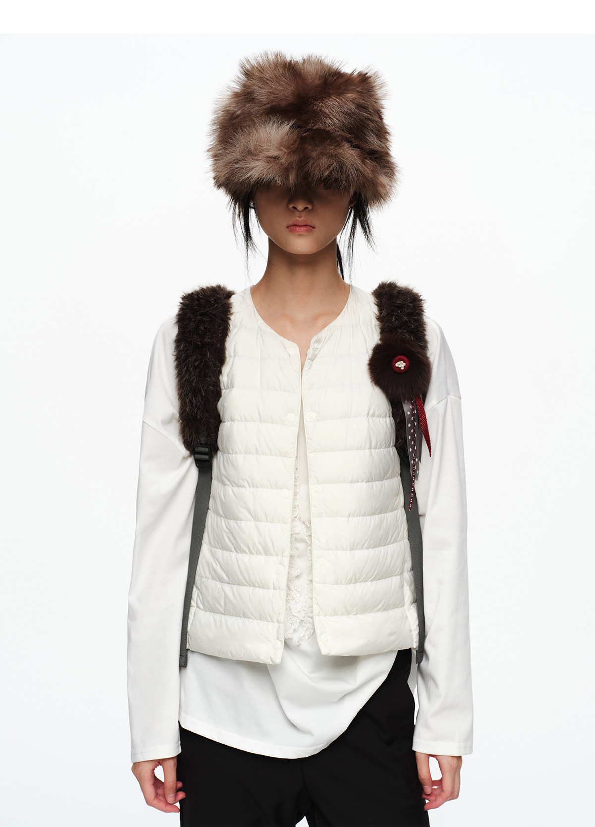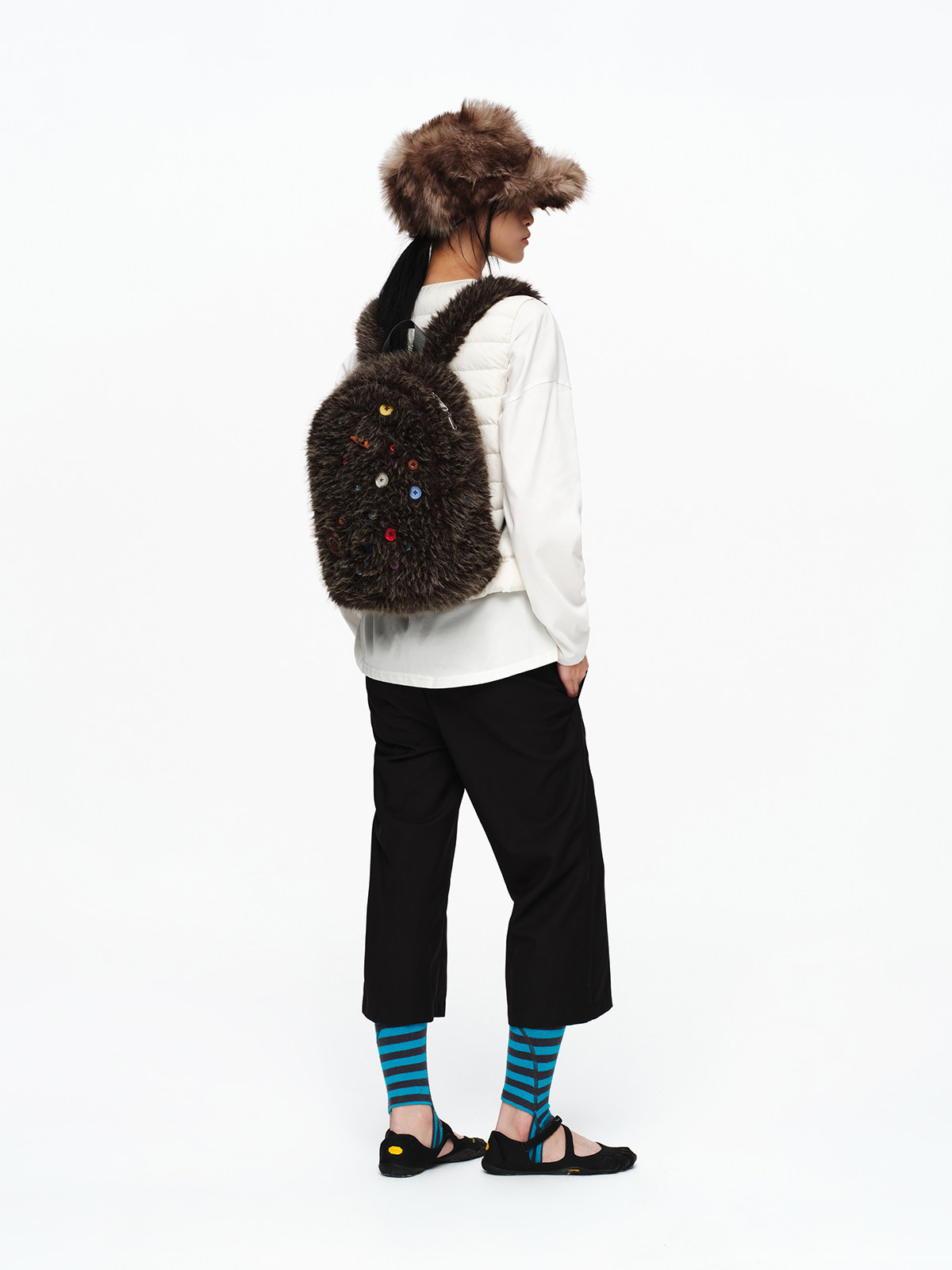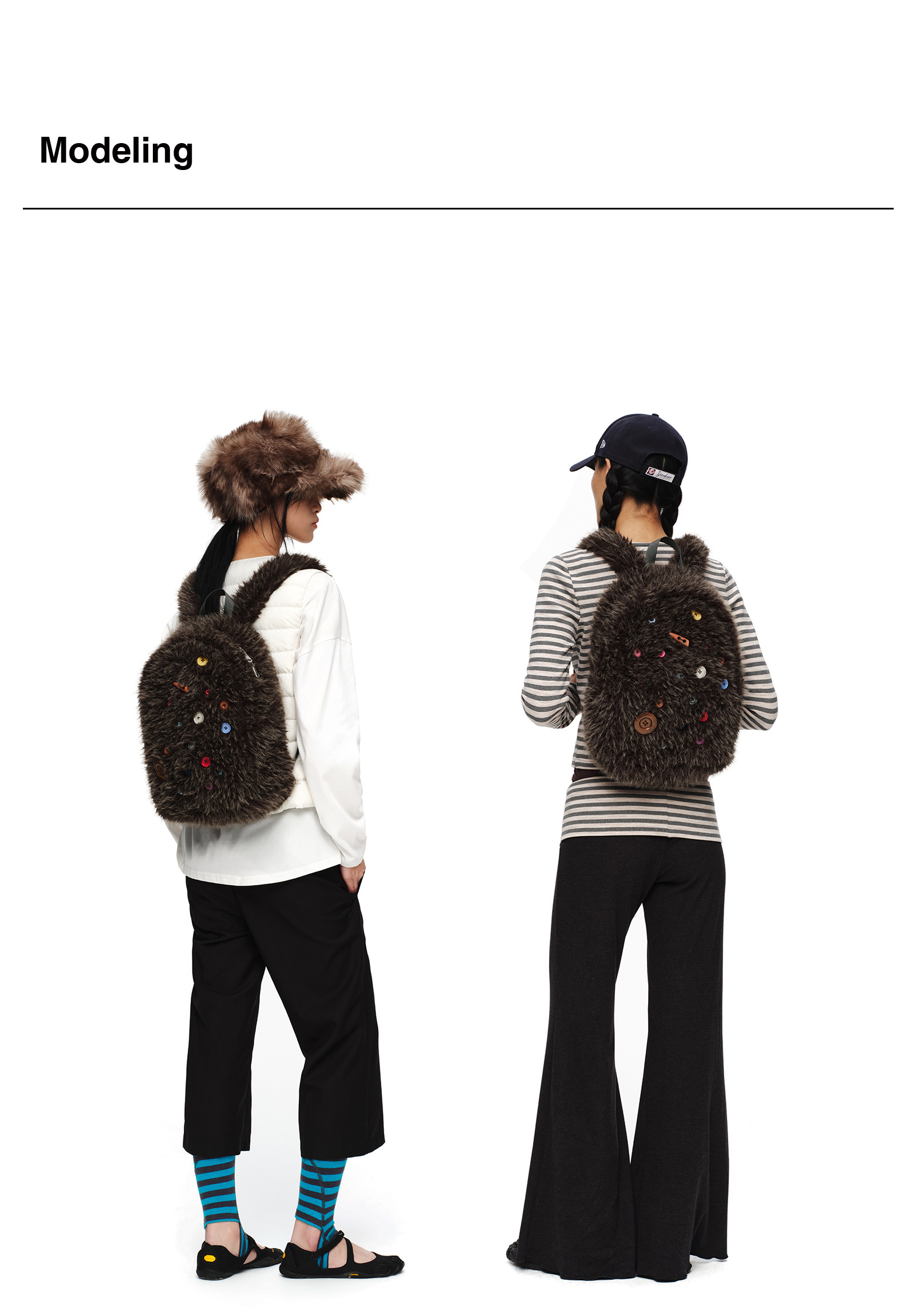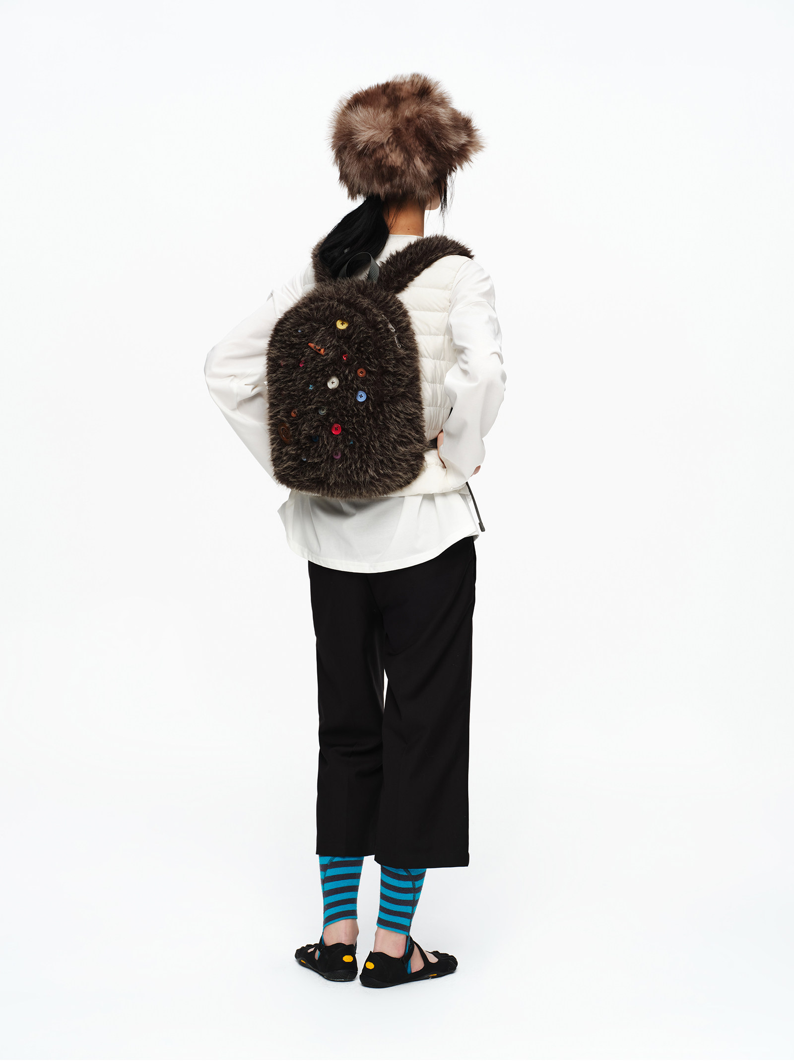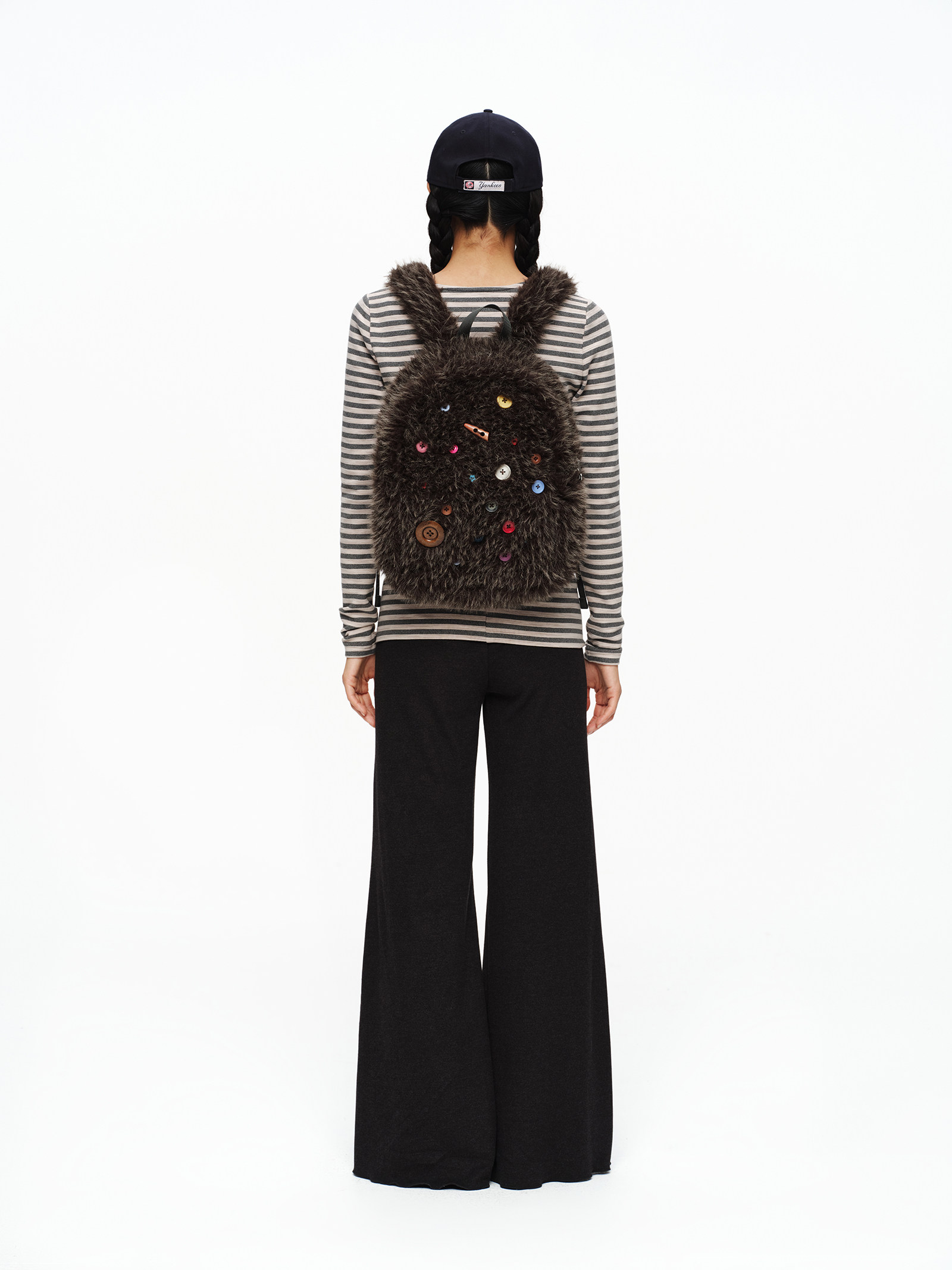 oinimi 趣味彩虹紐釦棕熊毛絨絨雙肩包 萌系造型感
