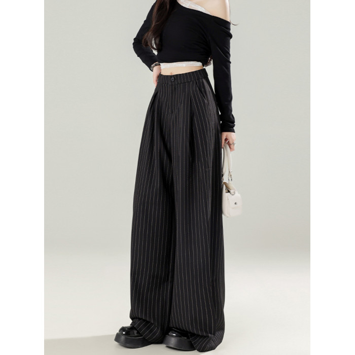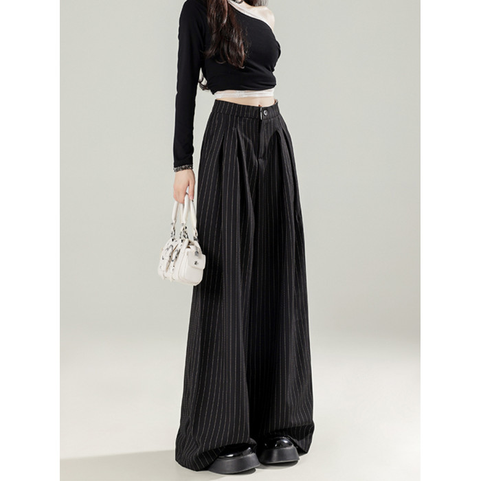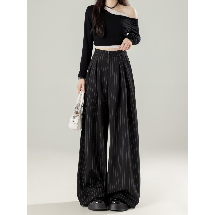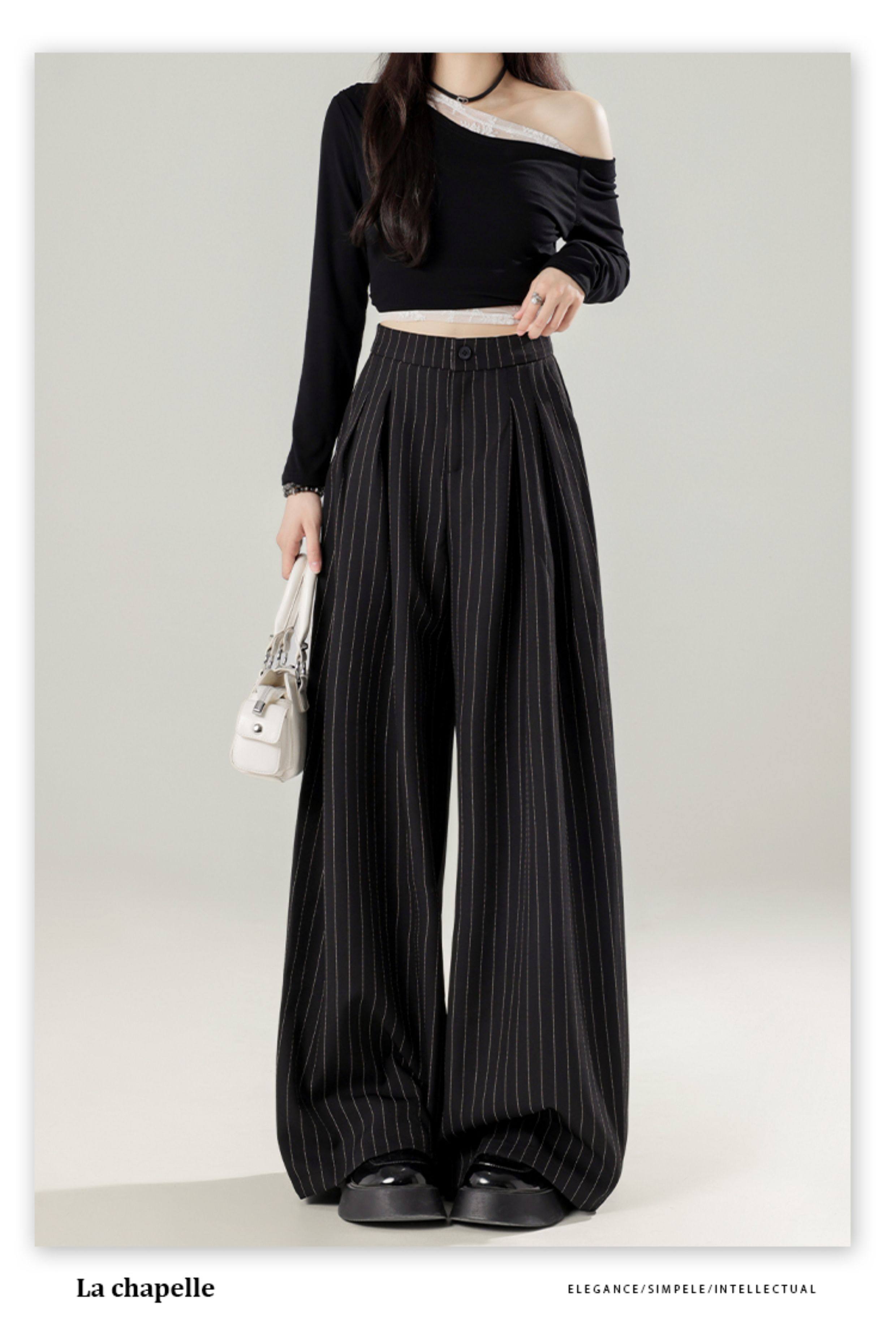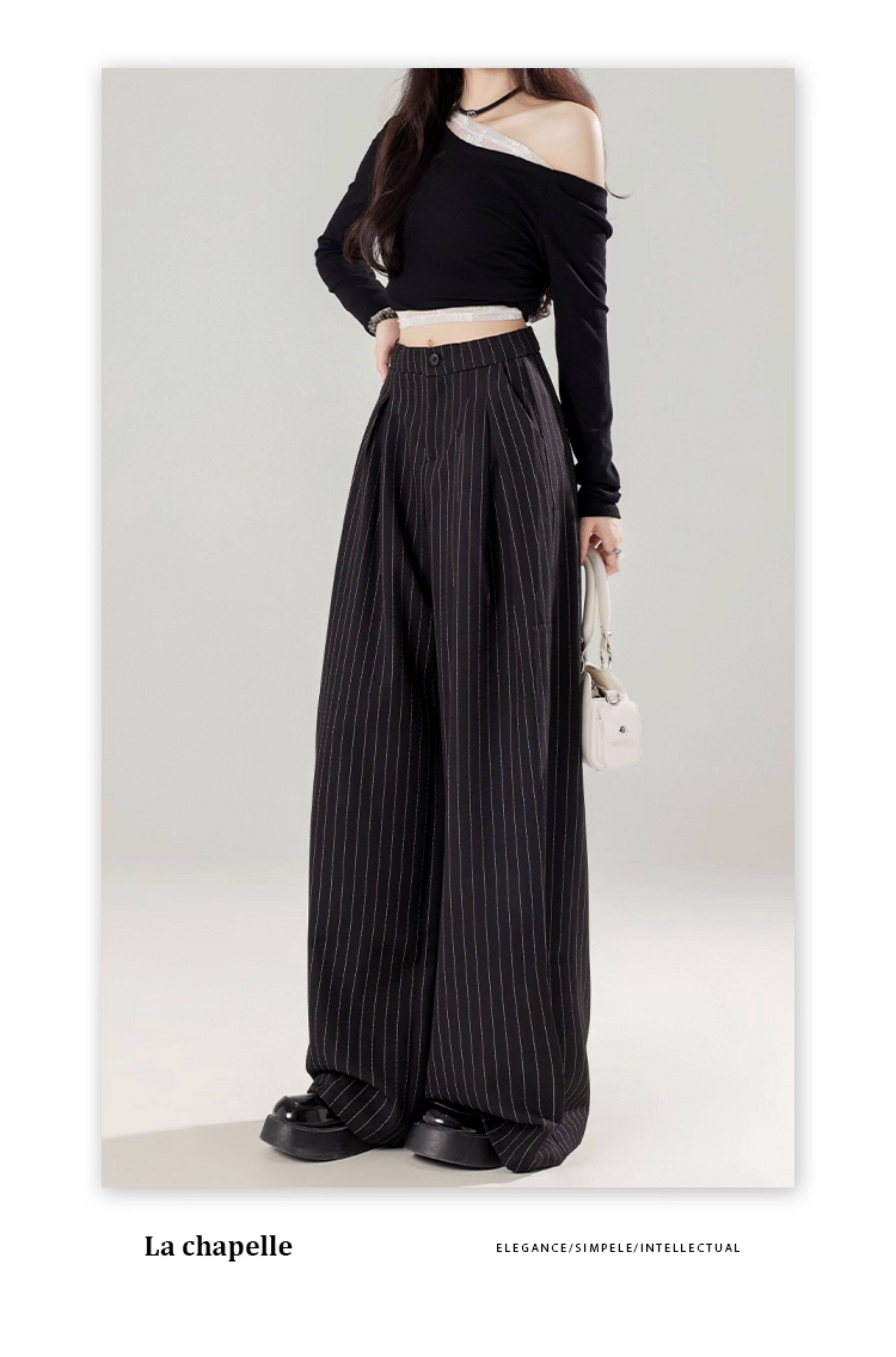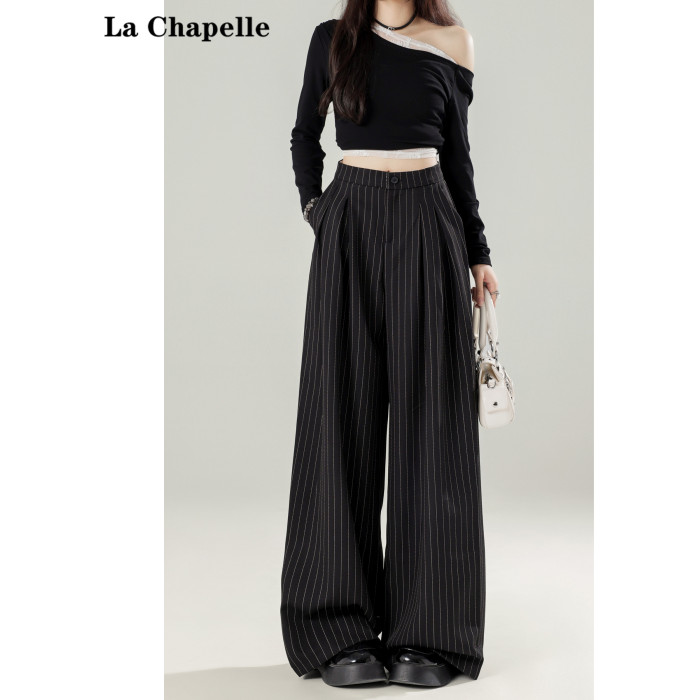 拉夏貝爾黑色條紋西裝濶腿褲女2025新款春秋高腰直筒垂感休閒褲子