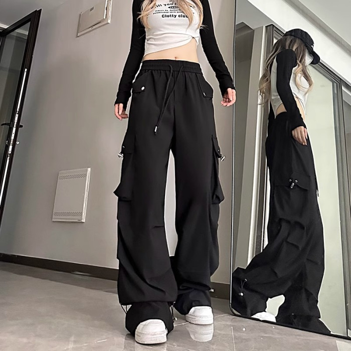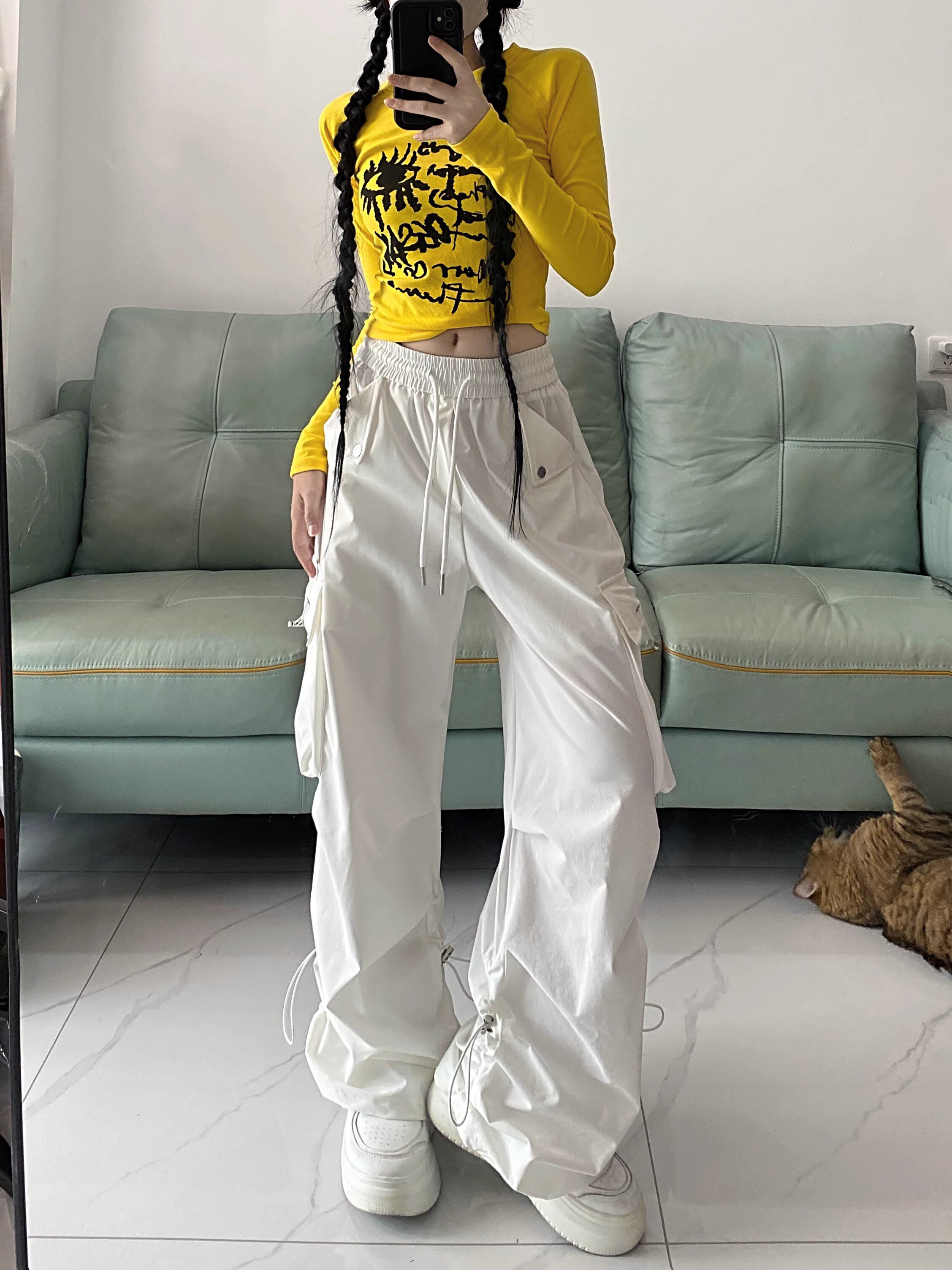 褶皺白色工裝褲女美式hiphop潮牌高街嘻哈爵士舞寬鬆休閒運動褲子