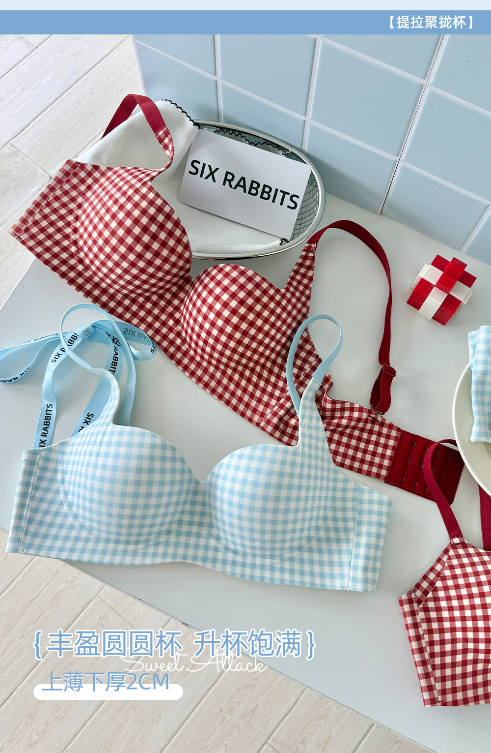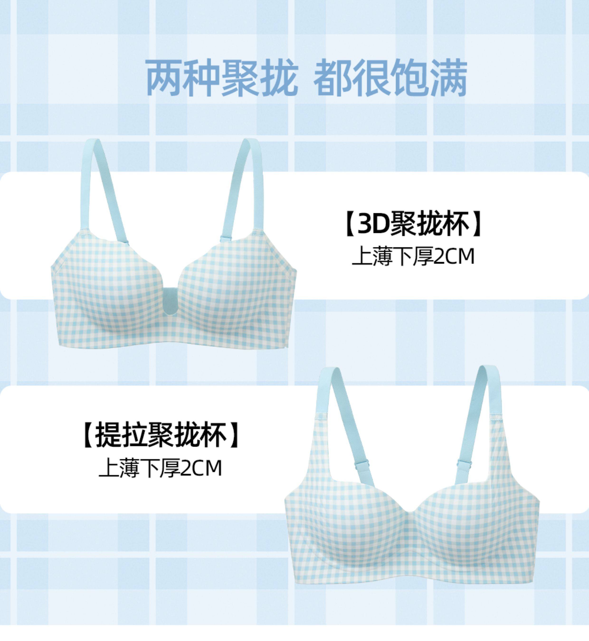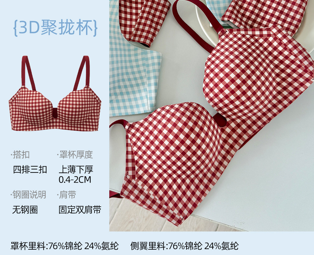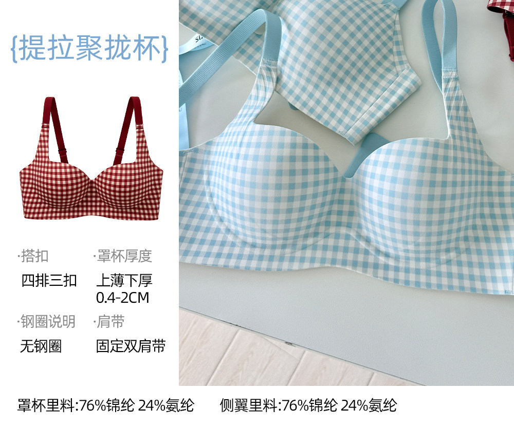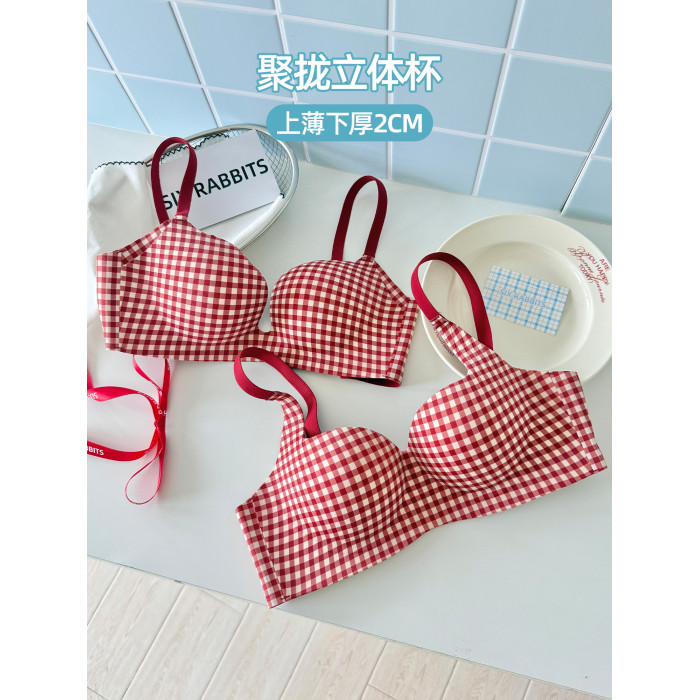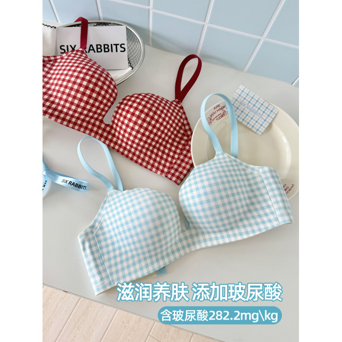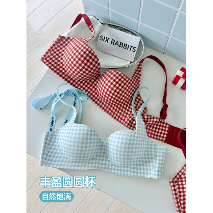 六隻兔子抑菌內衣女小胸聚攏升杯文胸無鋼圈收副乳防下垂格子胸罩