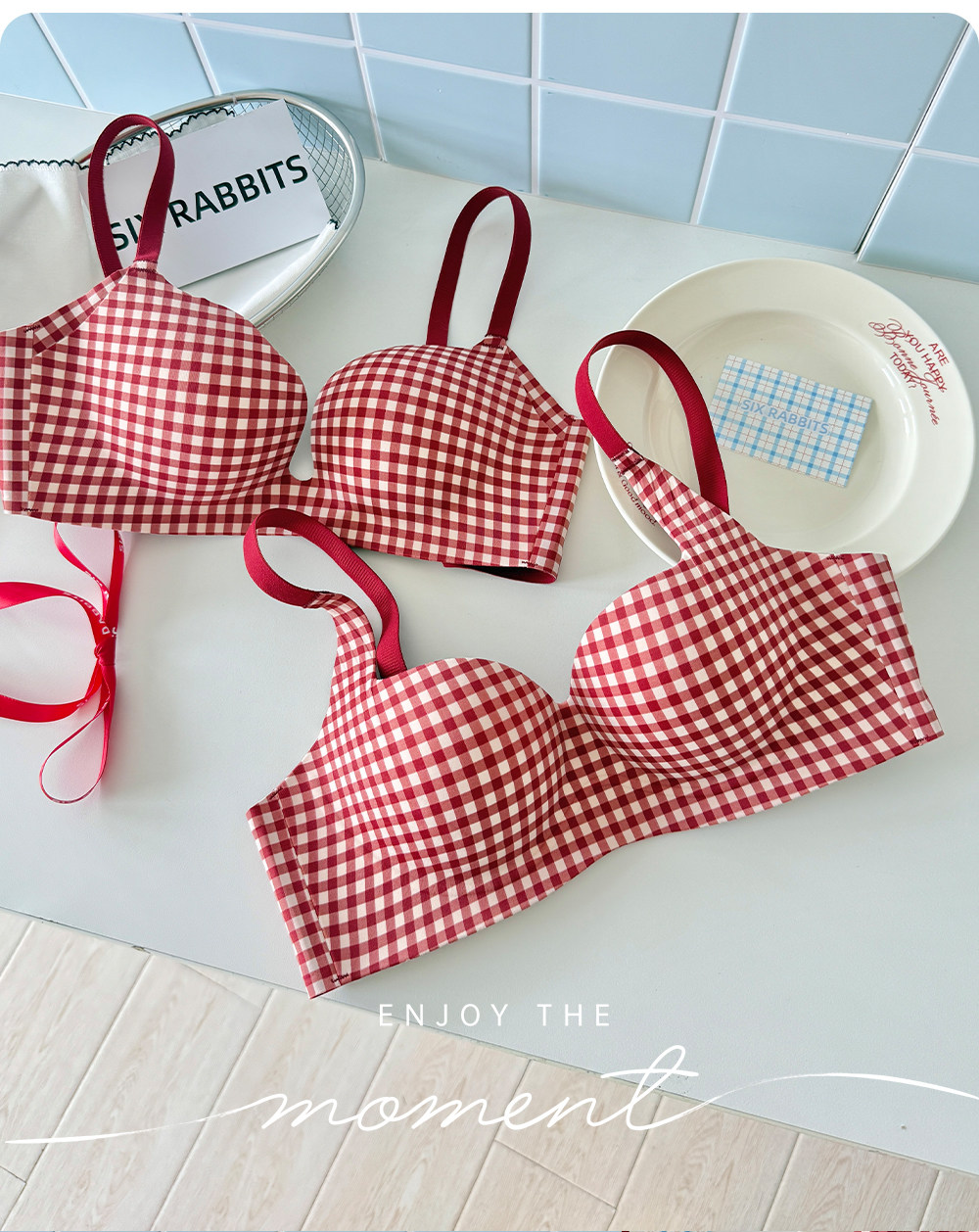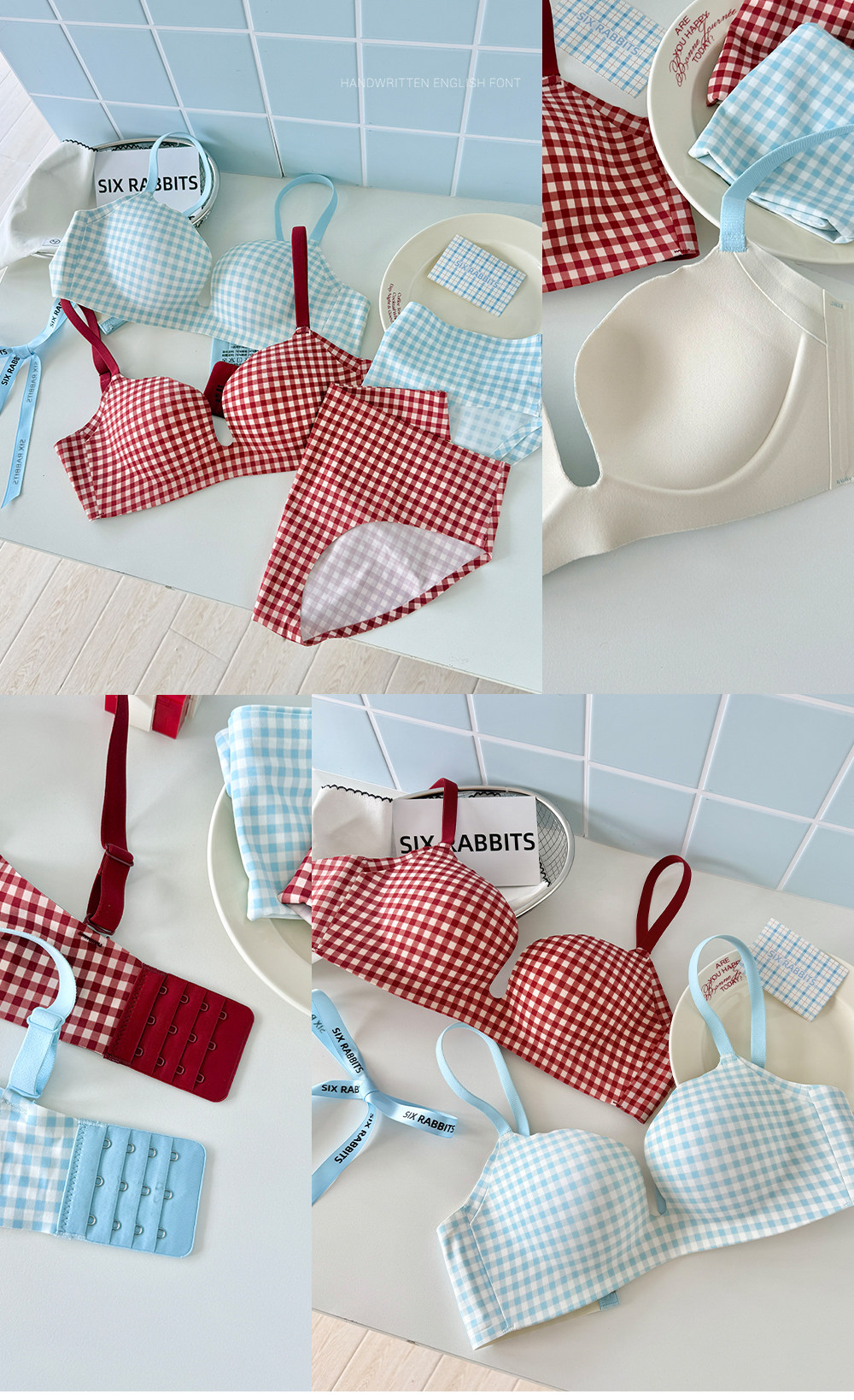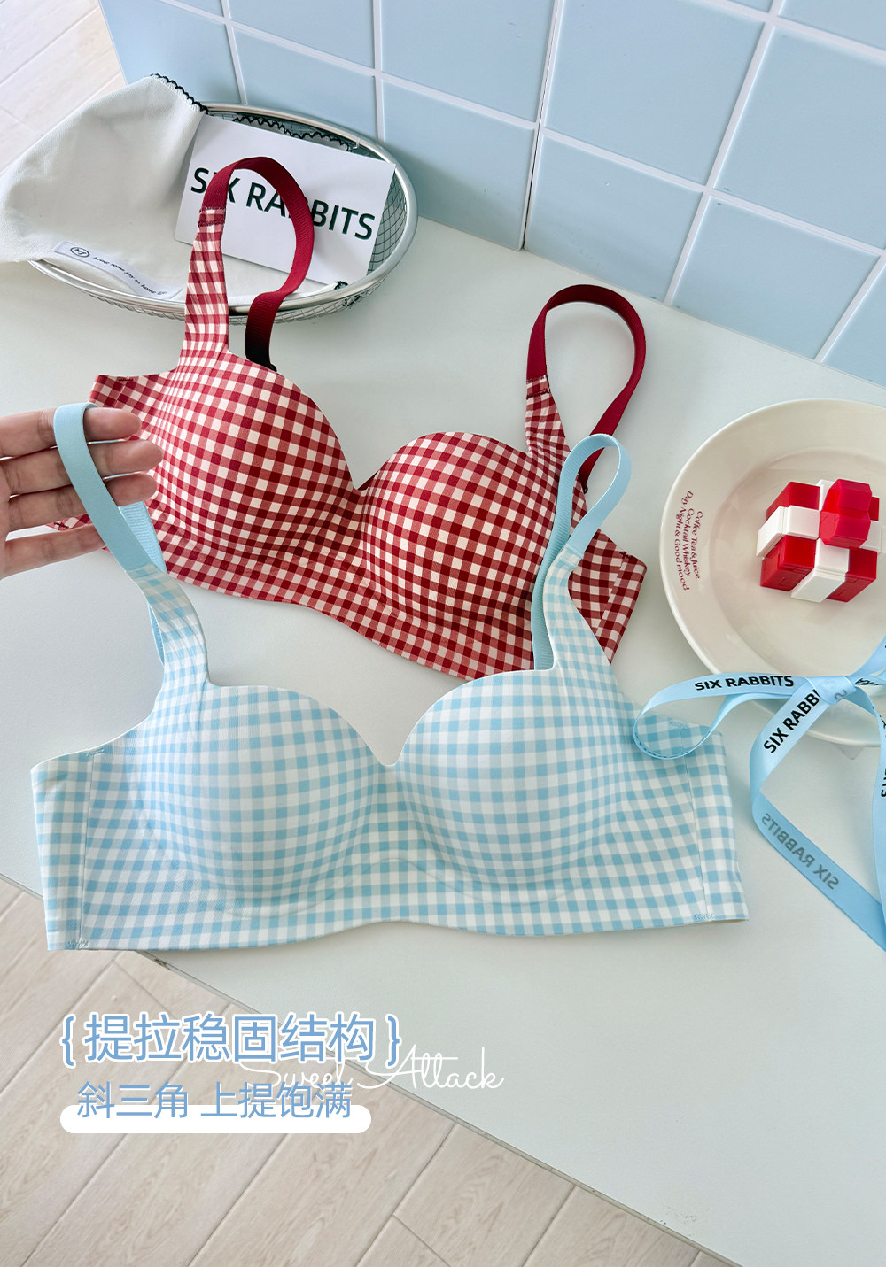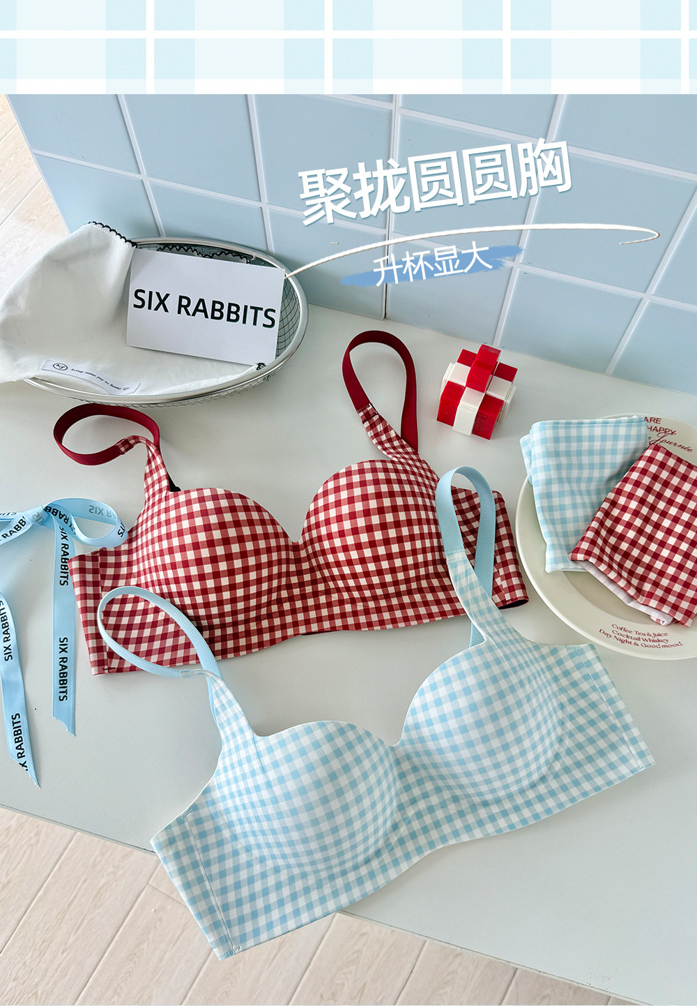 六隻兔子抑菌內衣女小胸聚攏升杯文胸無鋼圈收副乳防下垂格子胸罩