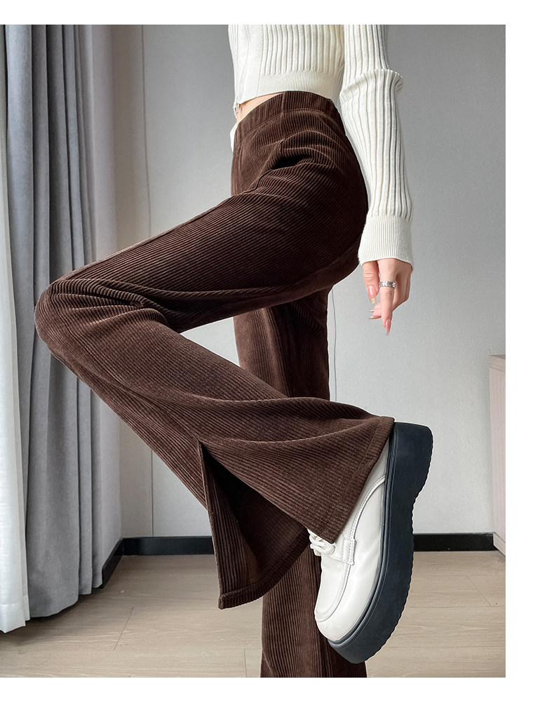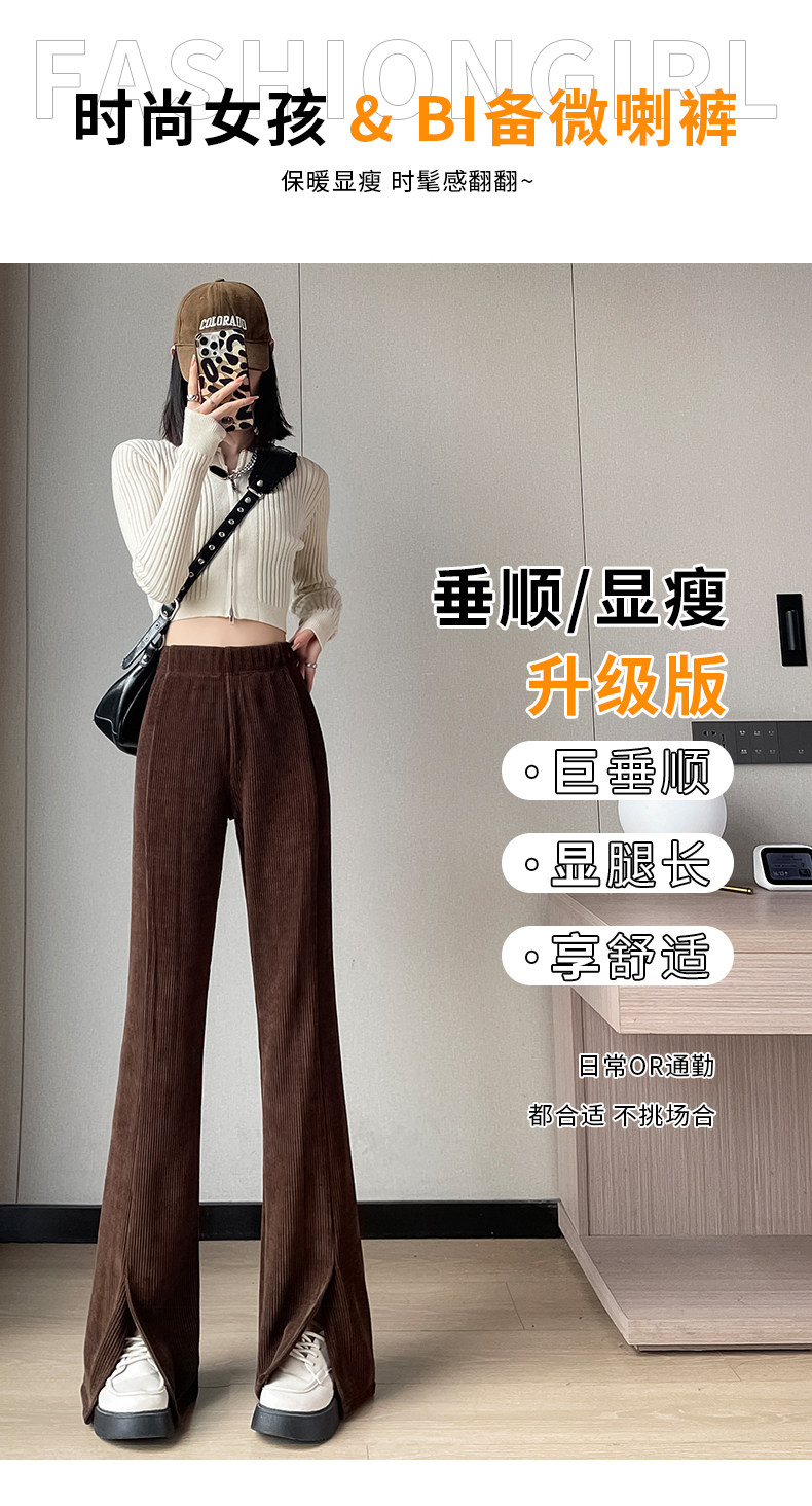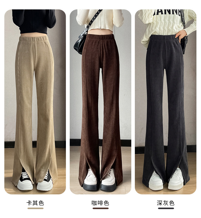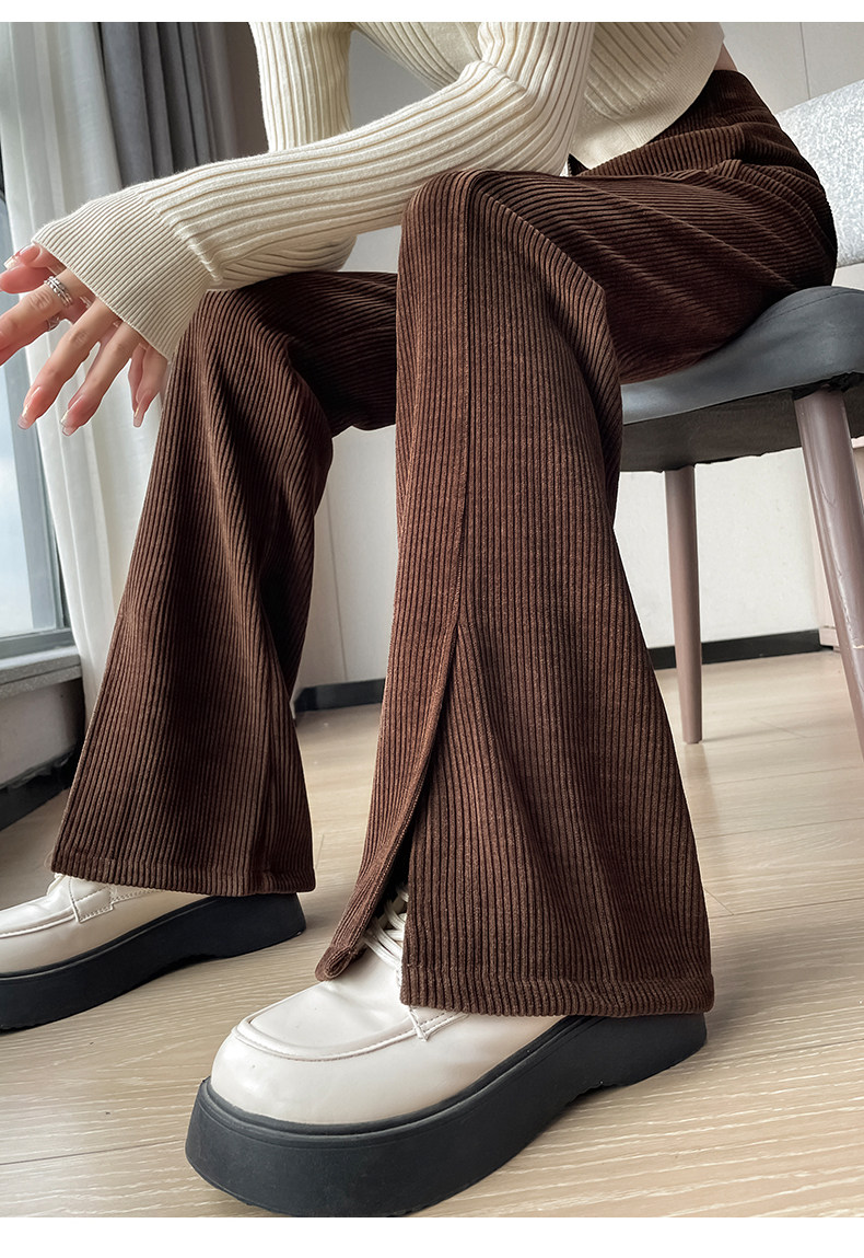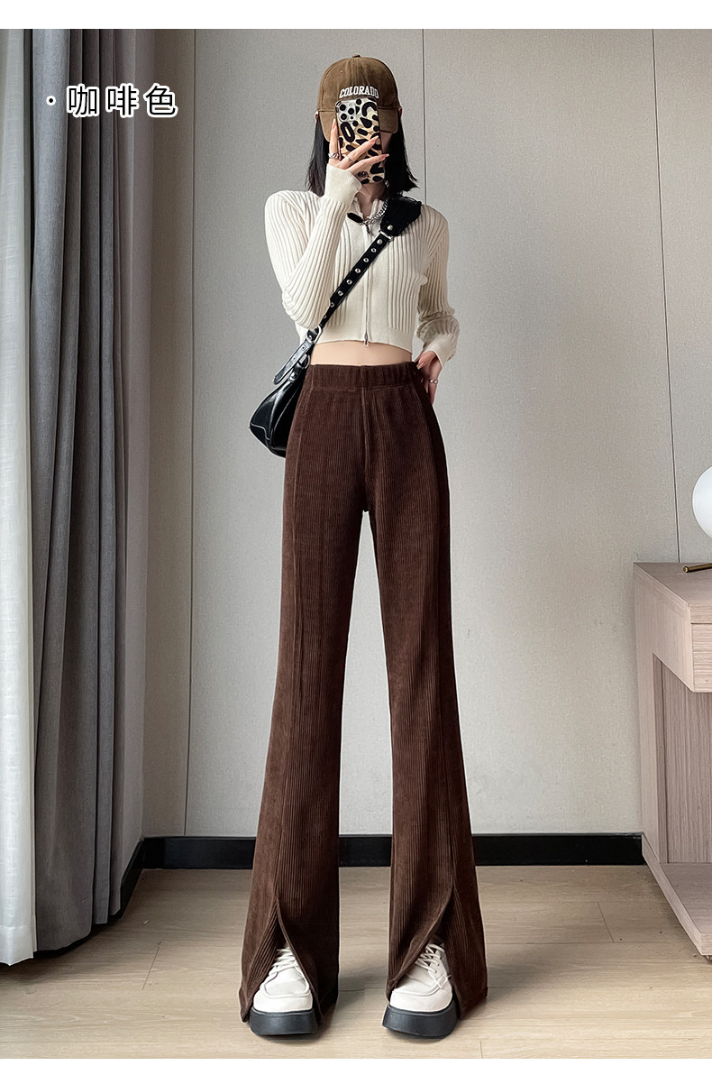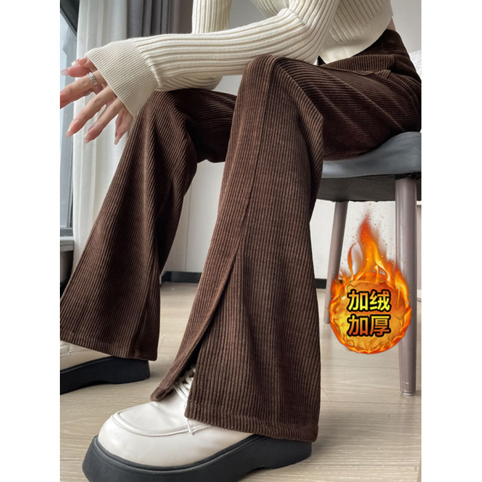 美拉德燈芯絨開叉微喇褲咖色歐棉絨拖地褲秋冬加絨雪尼爾喇叭褲女