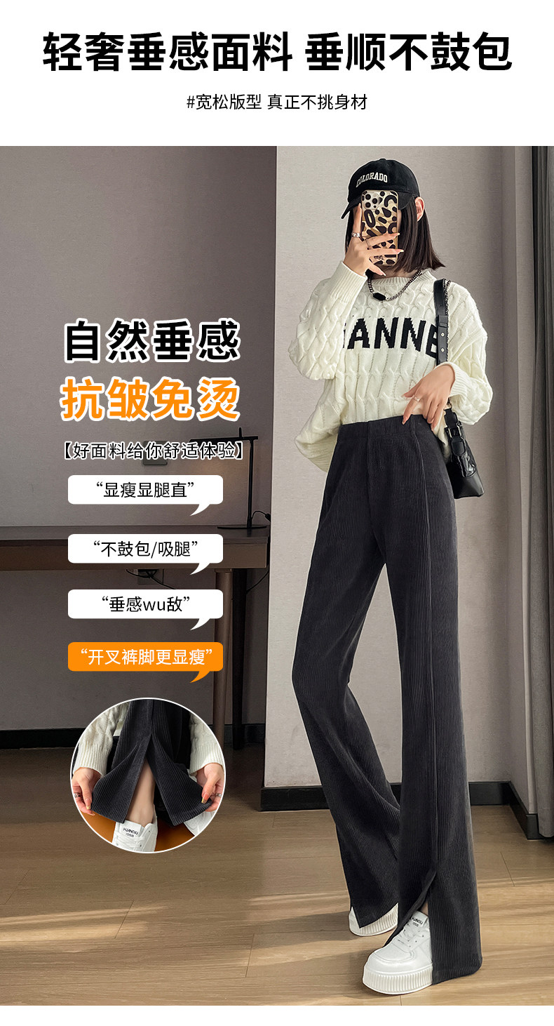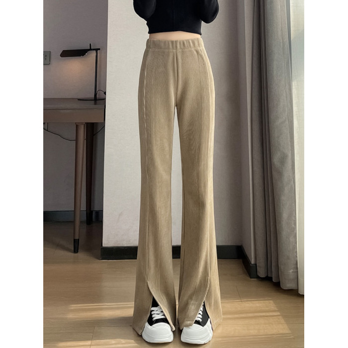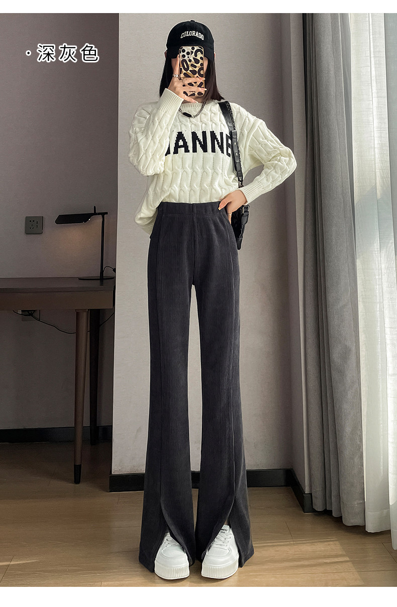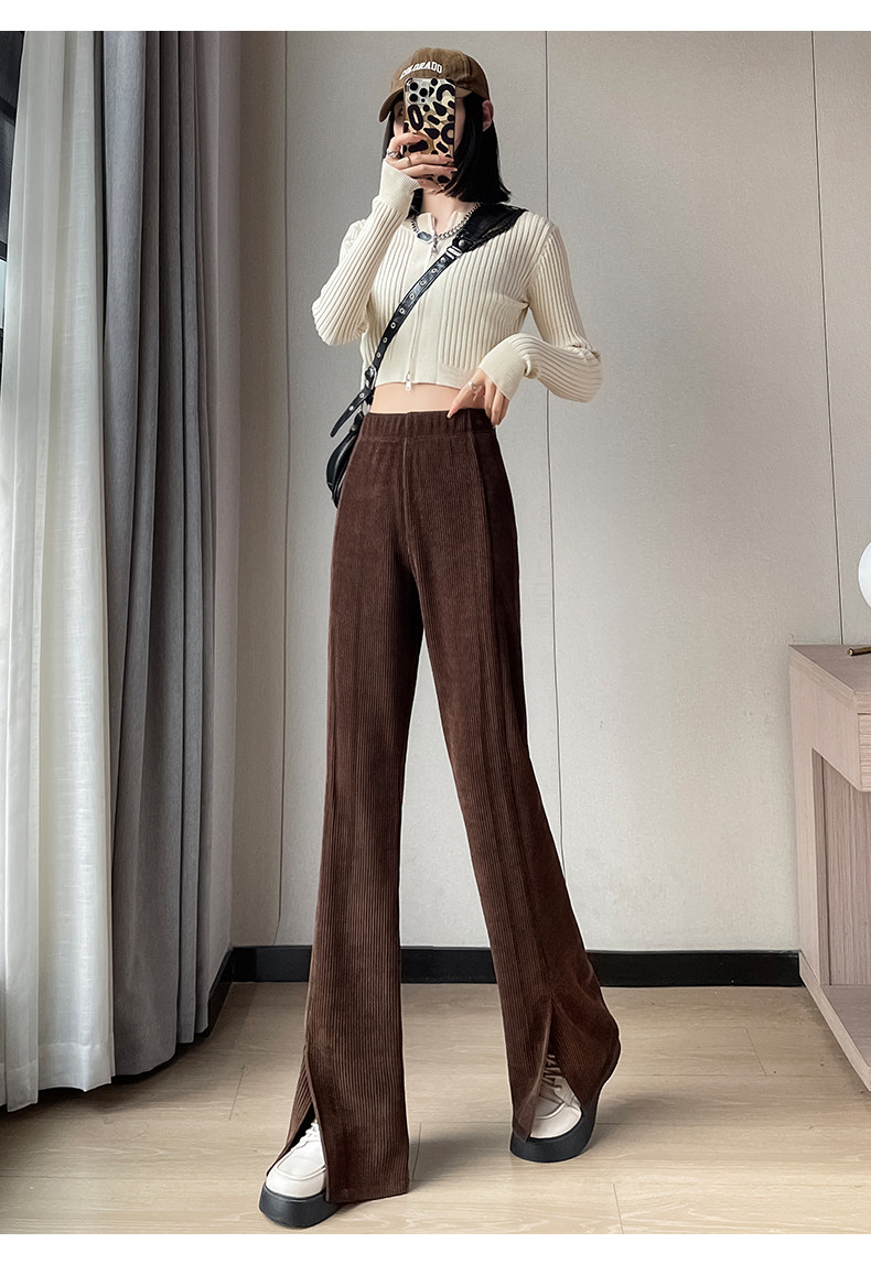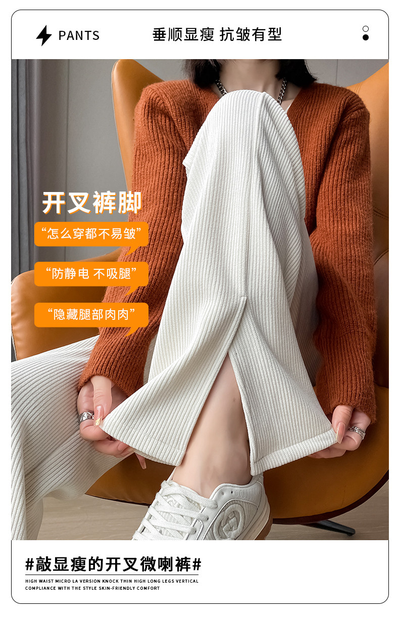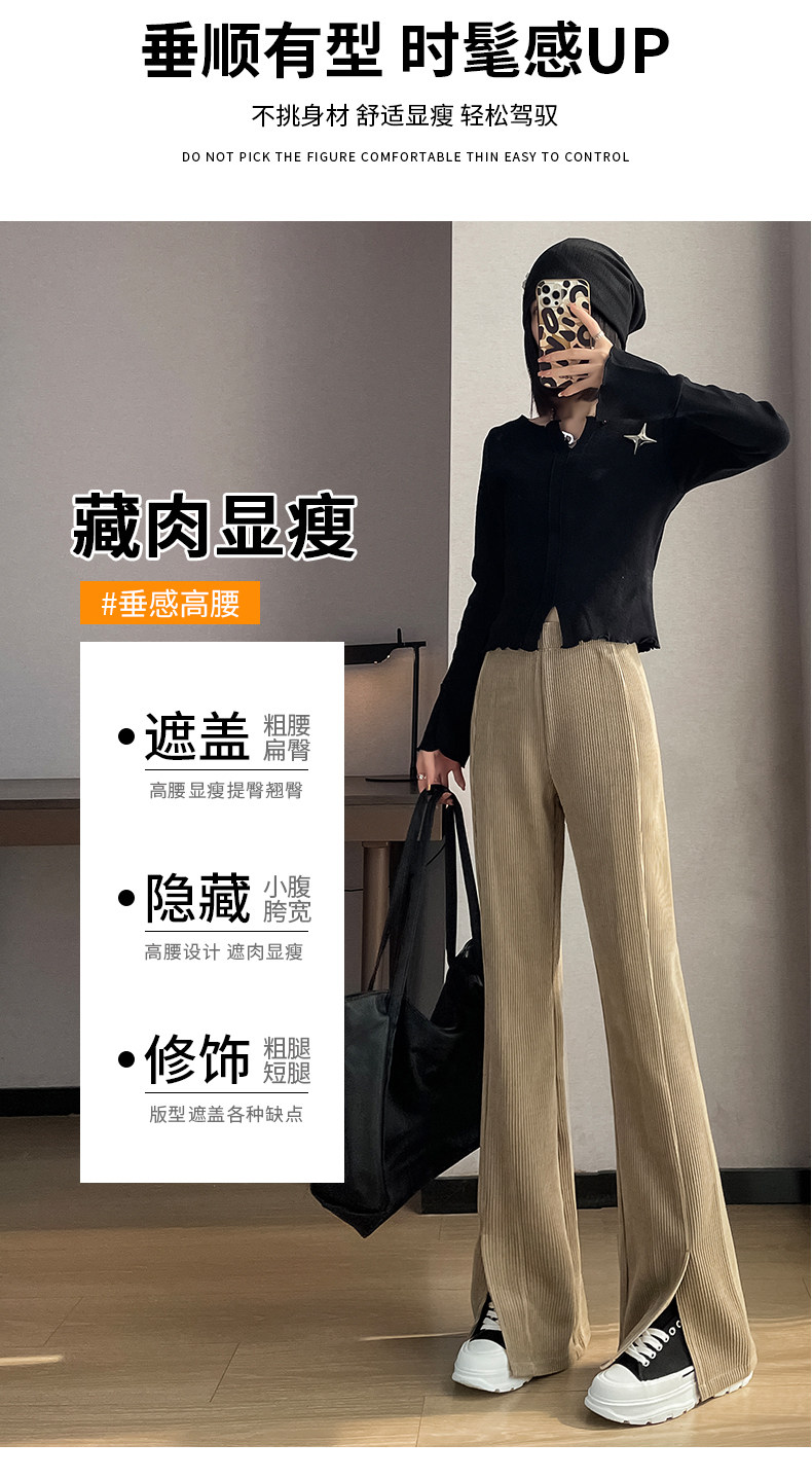 美拉德燈芯絨開叉微喇褲咖色歐棉絨拖地褲秋冬加絨雪尼爾喇叭褲女