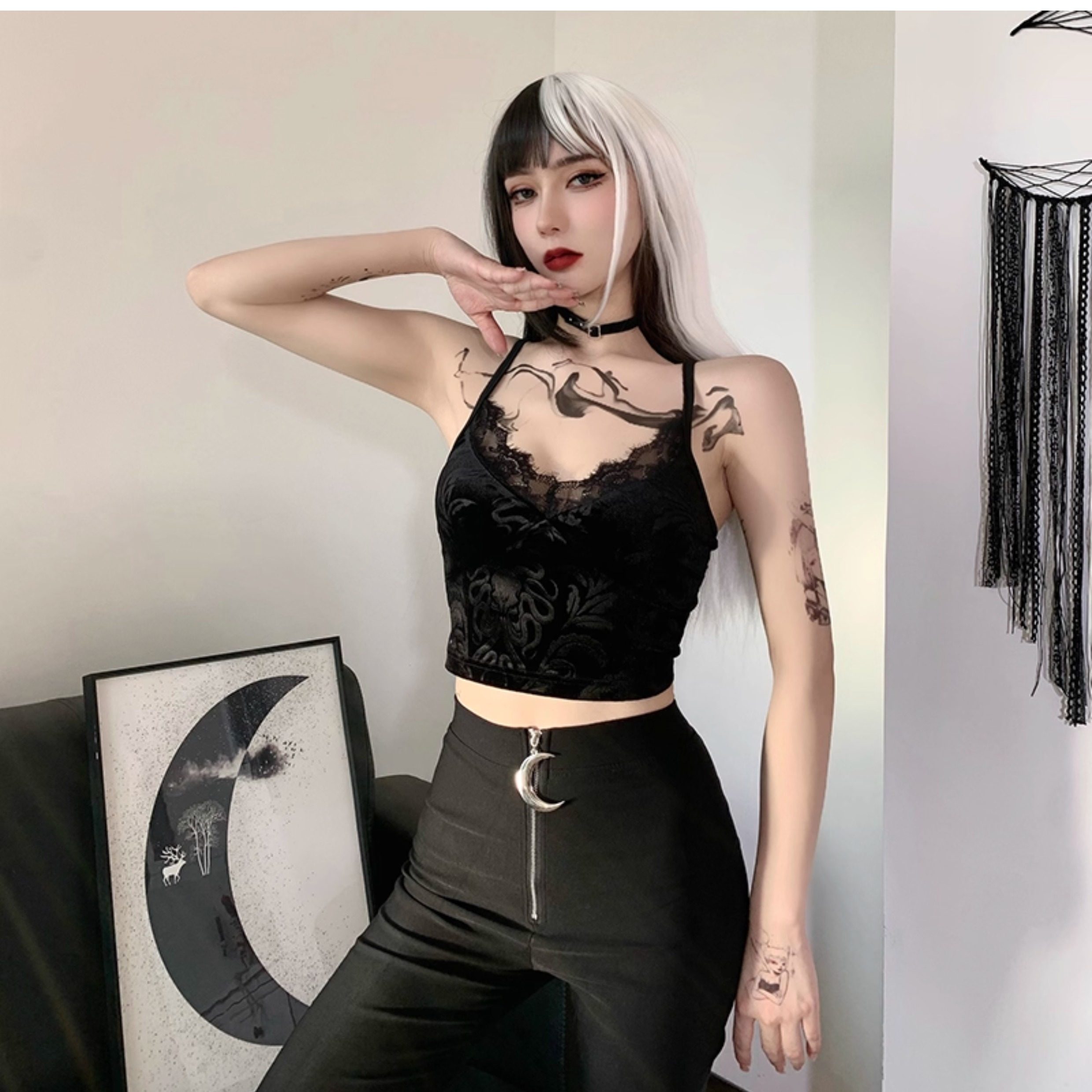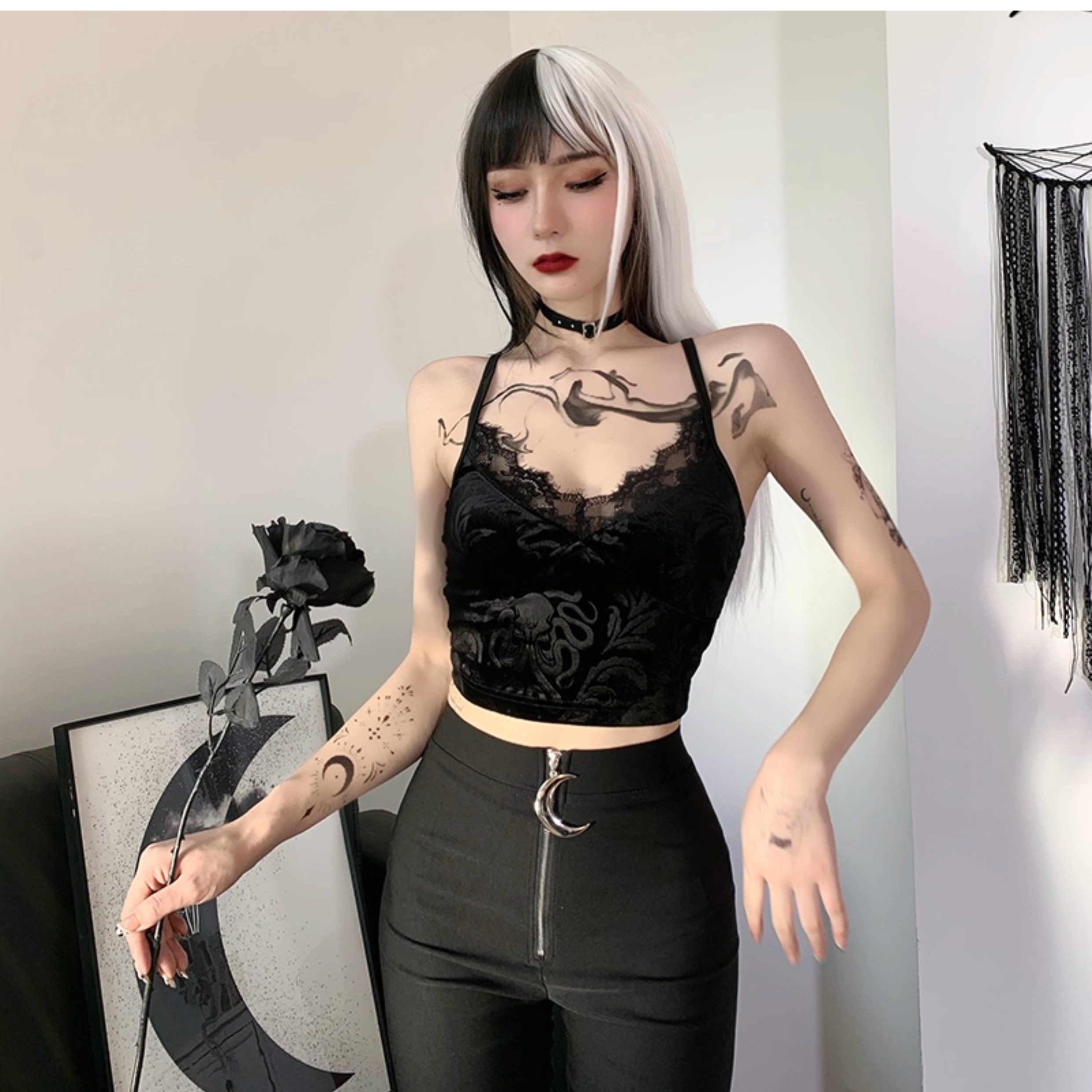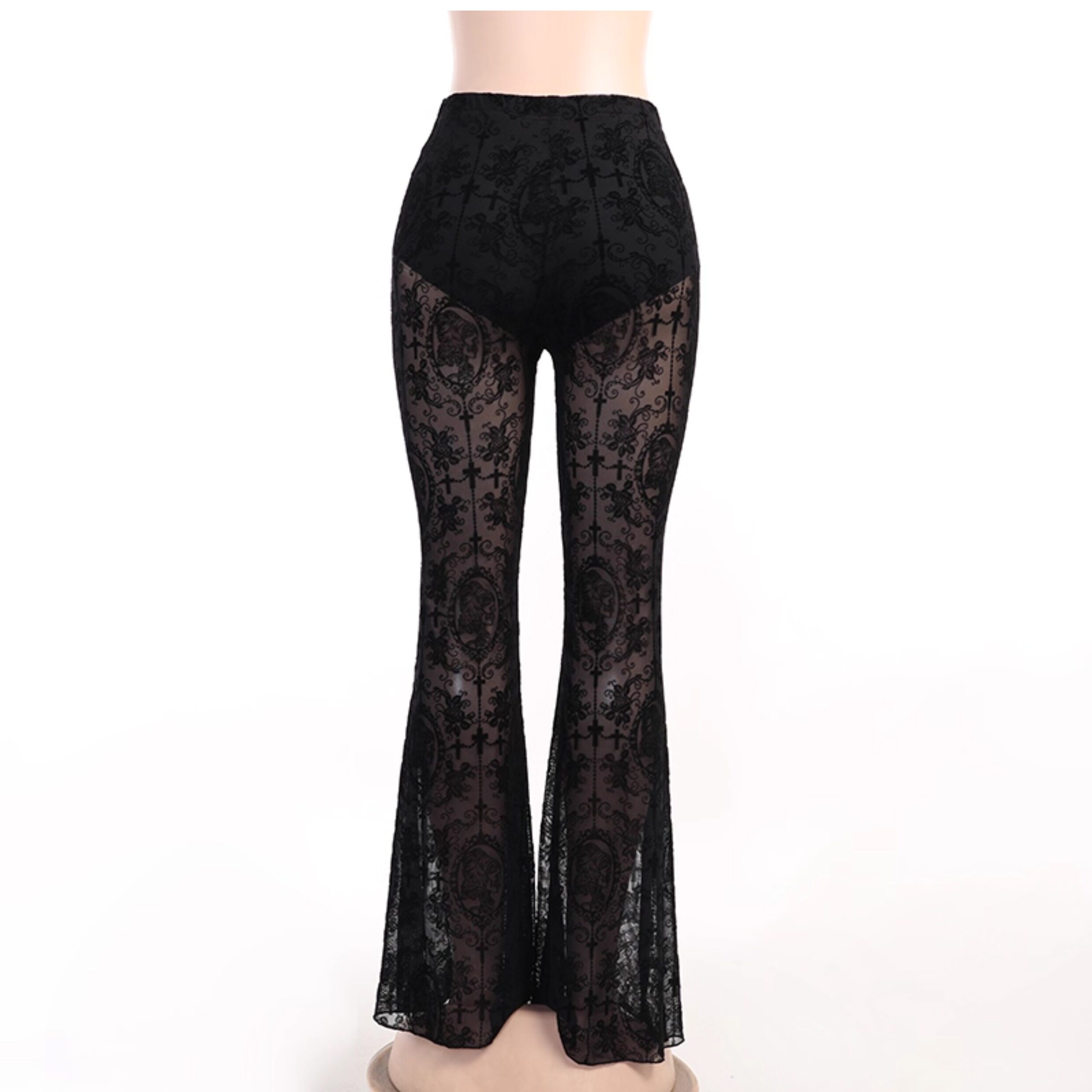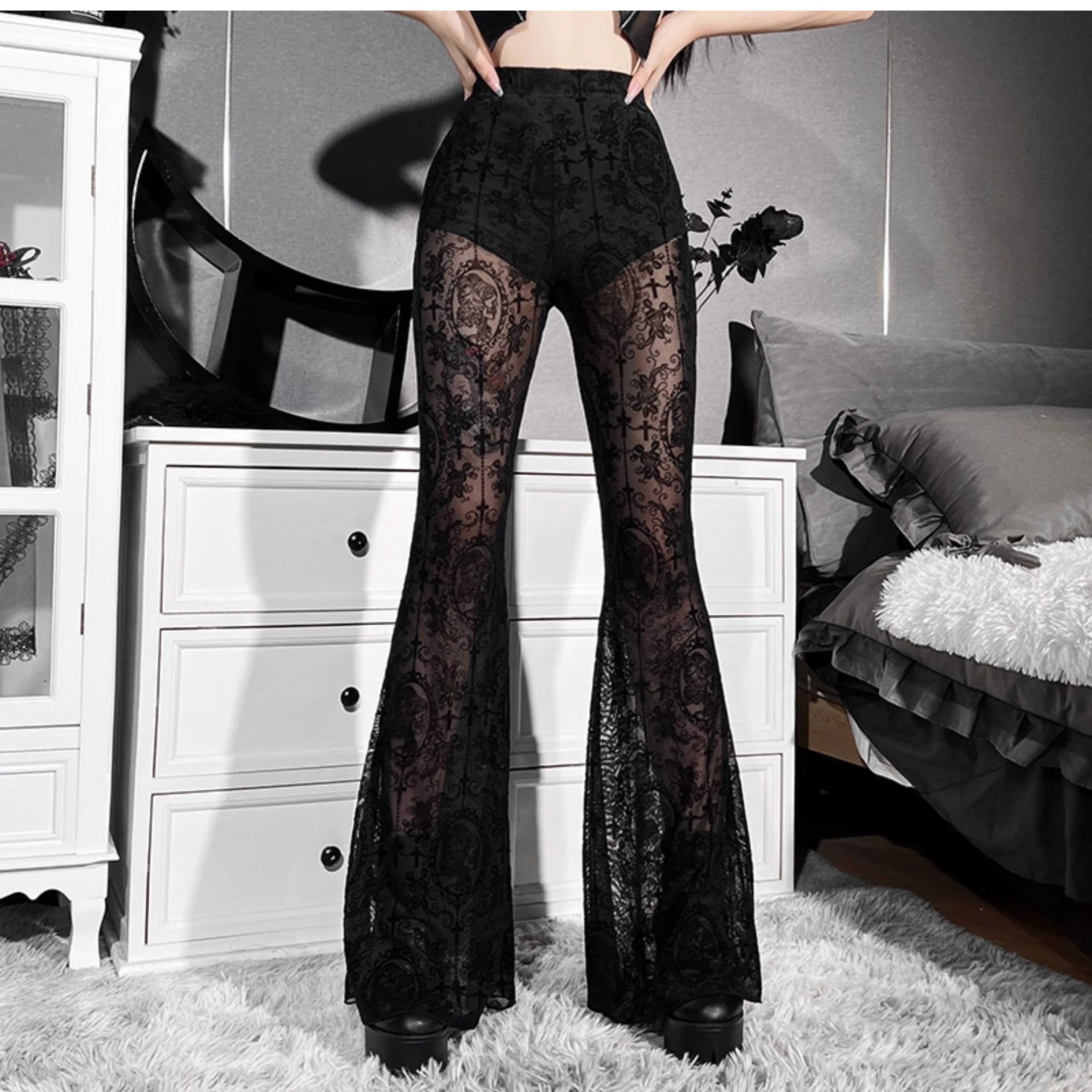 Wannathis亞文化heels舞服黑色蕾絲性感喇叭褲網紗辣妹舞蹈長褲子