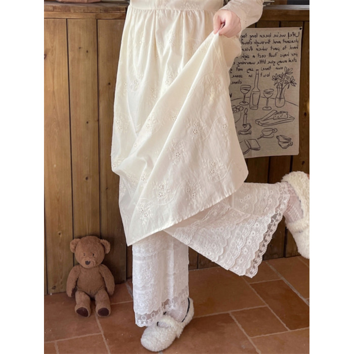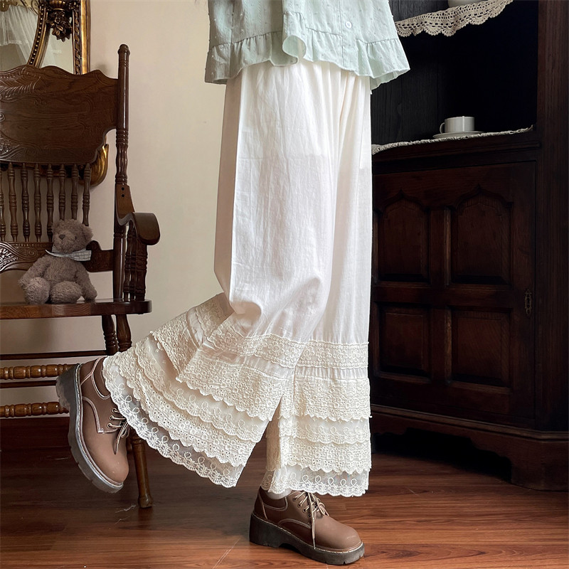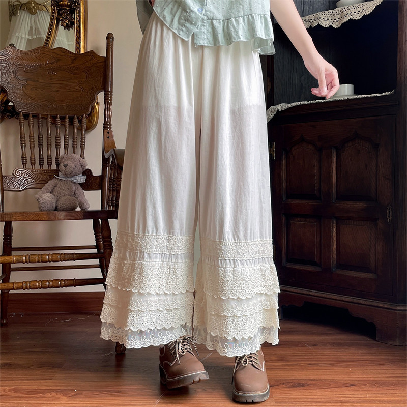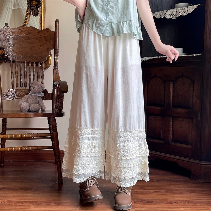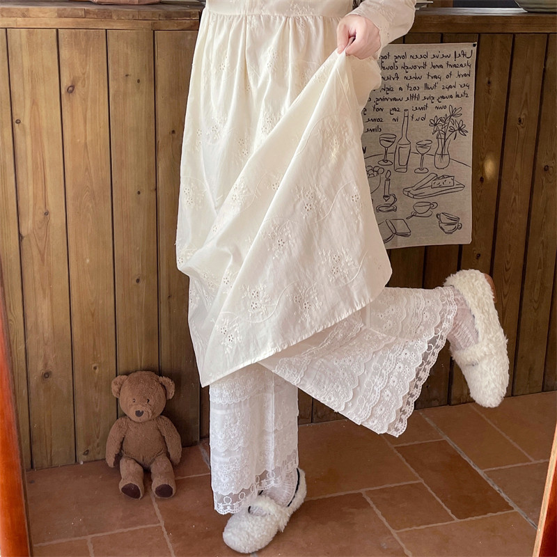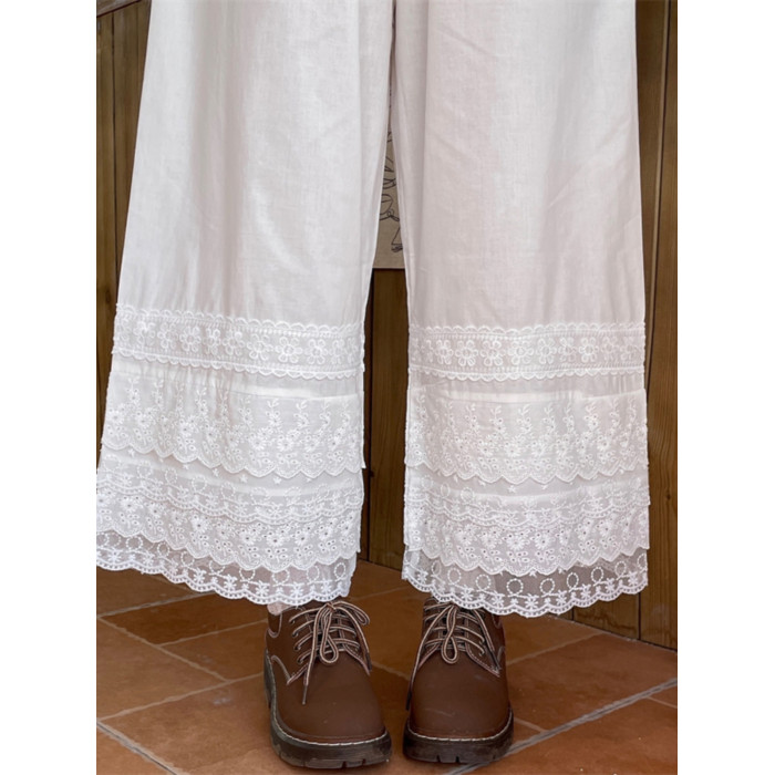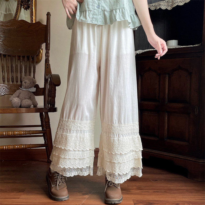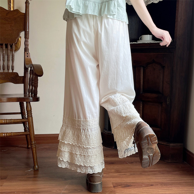 旗袍襯褲蕾絲花邊白色濶腿褲子女秋冬季漢服內搭打底休閒直筒長褲