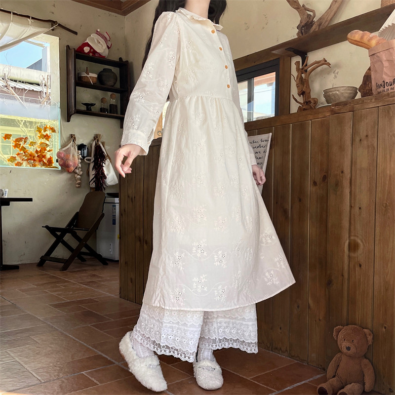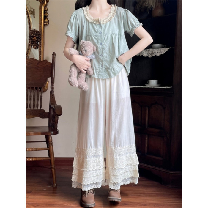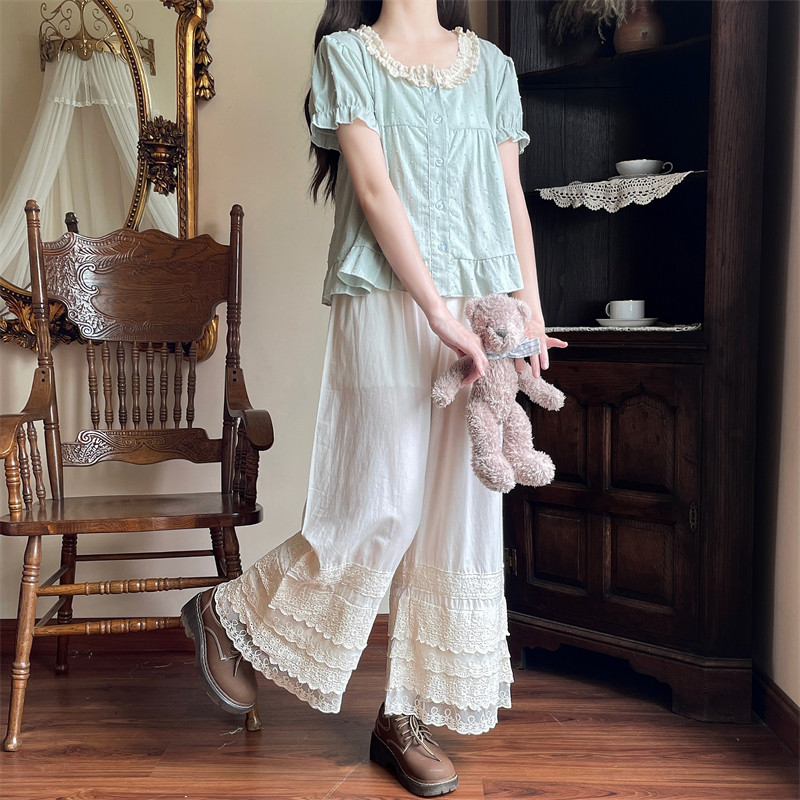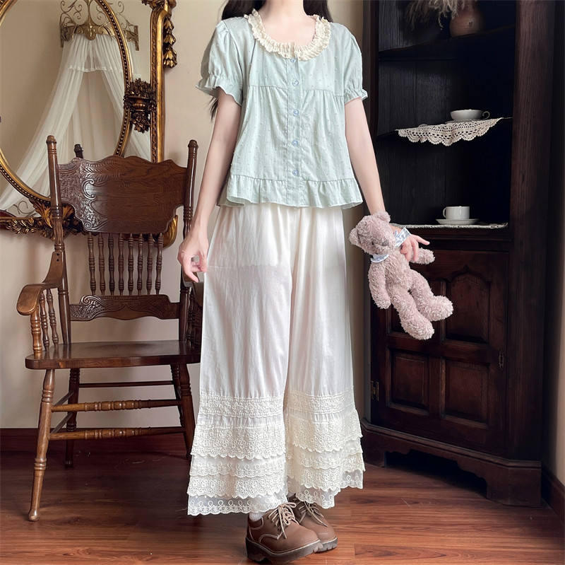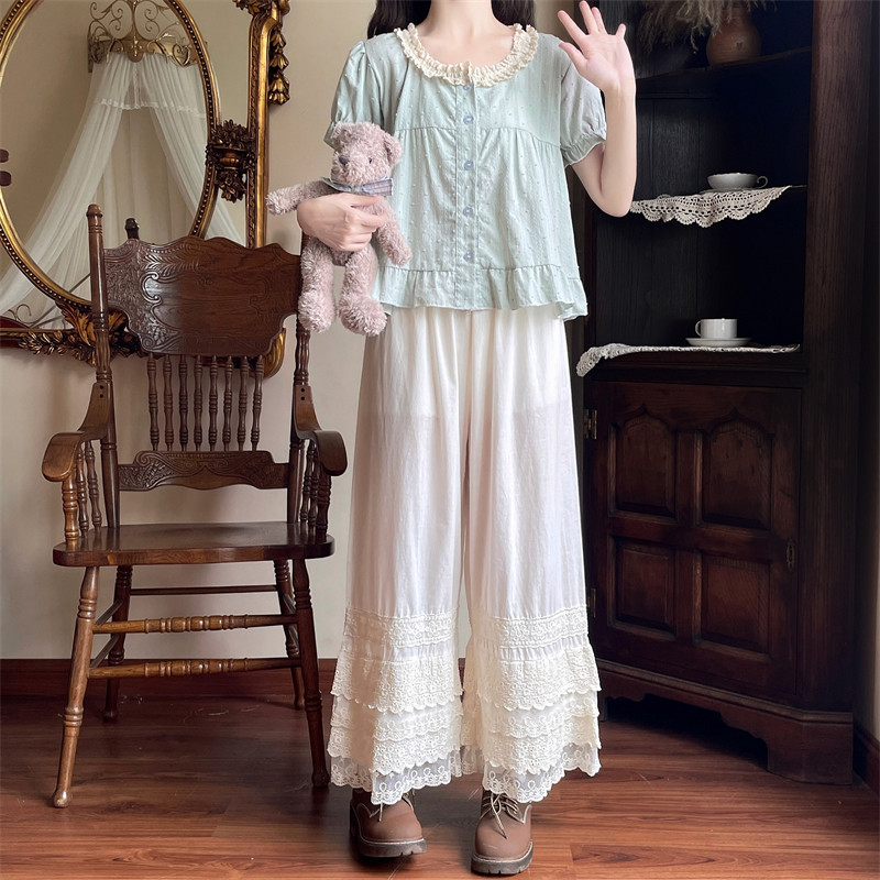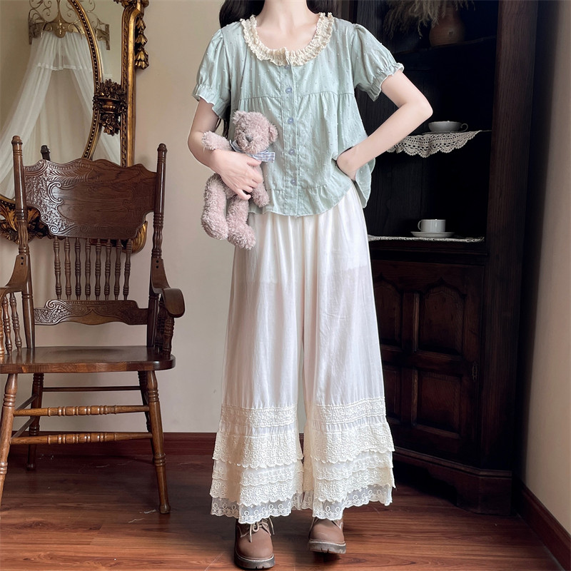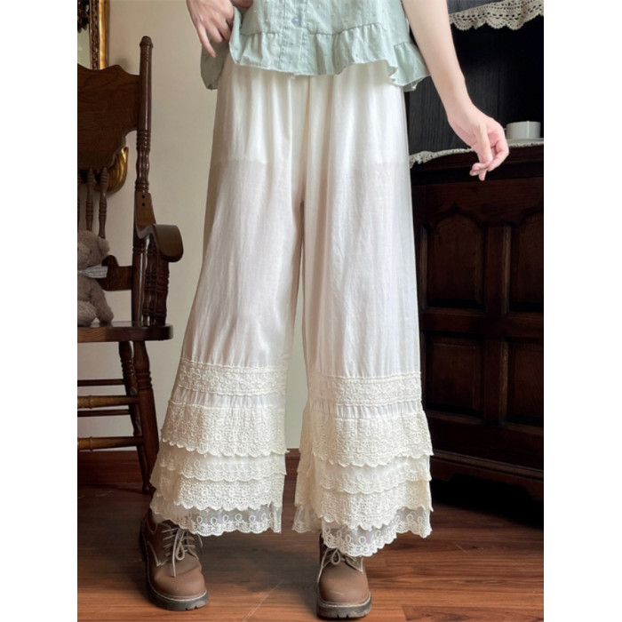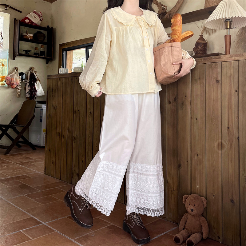 旗袍襯褲蕾絲花邊白色濶腿褲子女秋冬季漢服內搭打底休閒直筒長褲