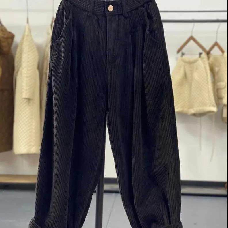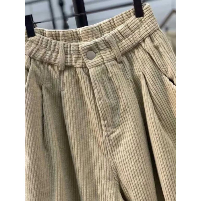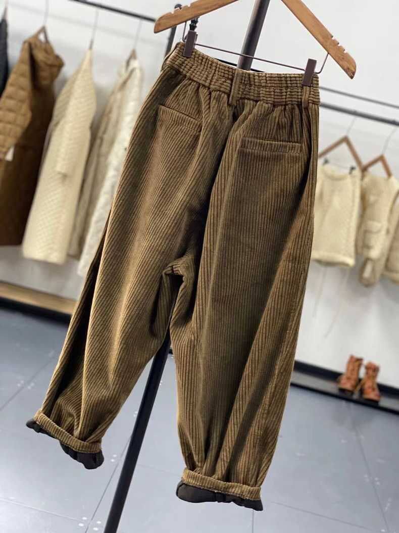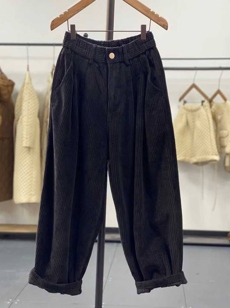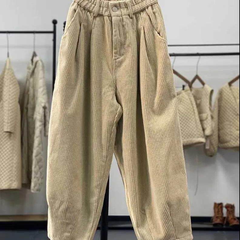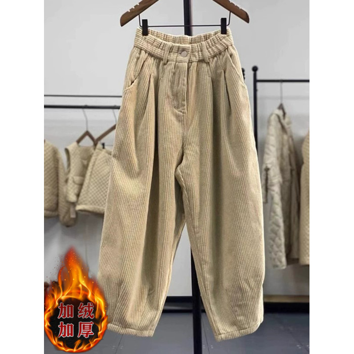 復古燈芯絨濶腿褲女冬季加絨加厚松緊腰大碼媽媽休閒保暖條絨長褲