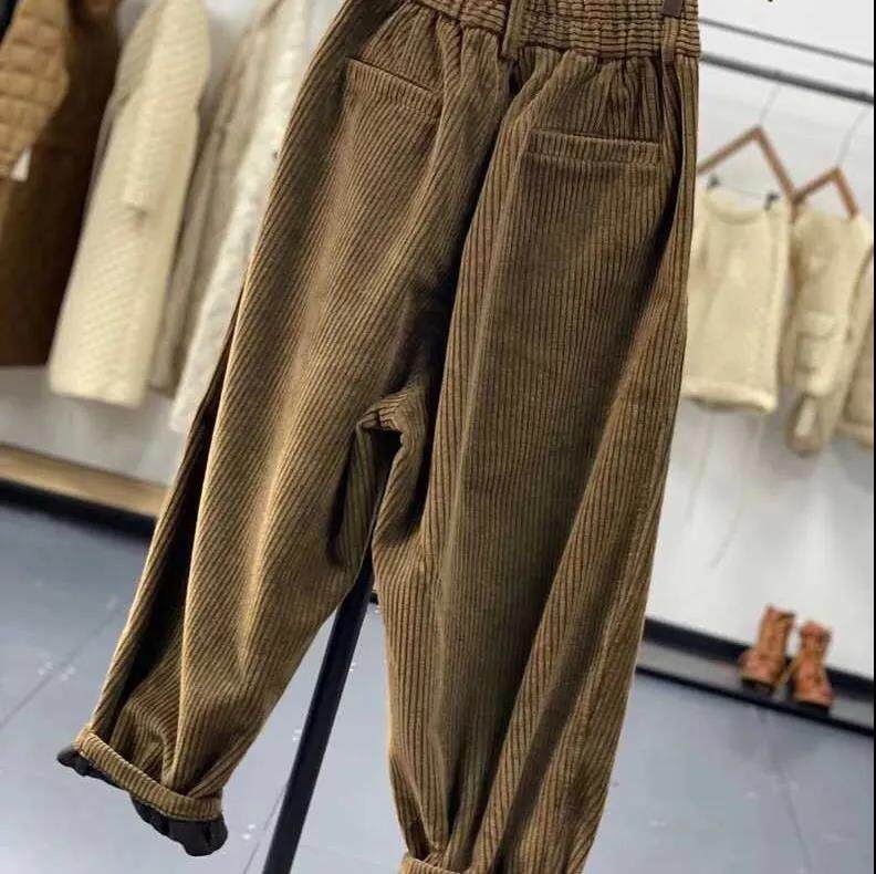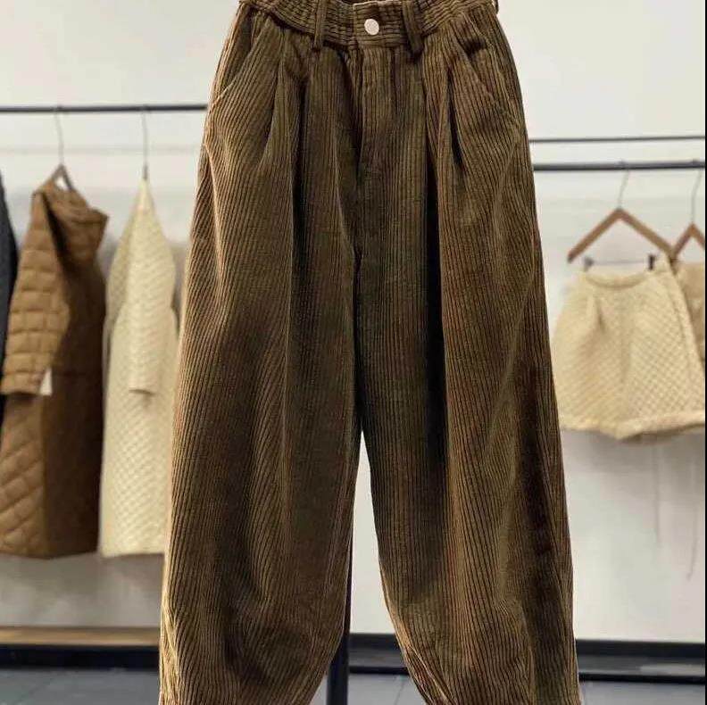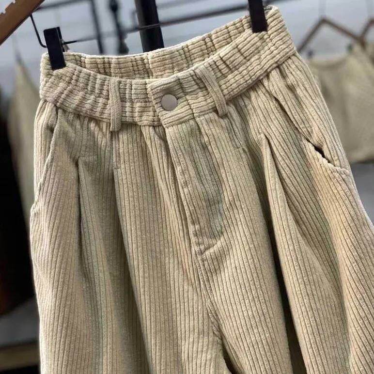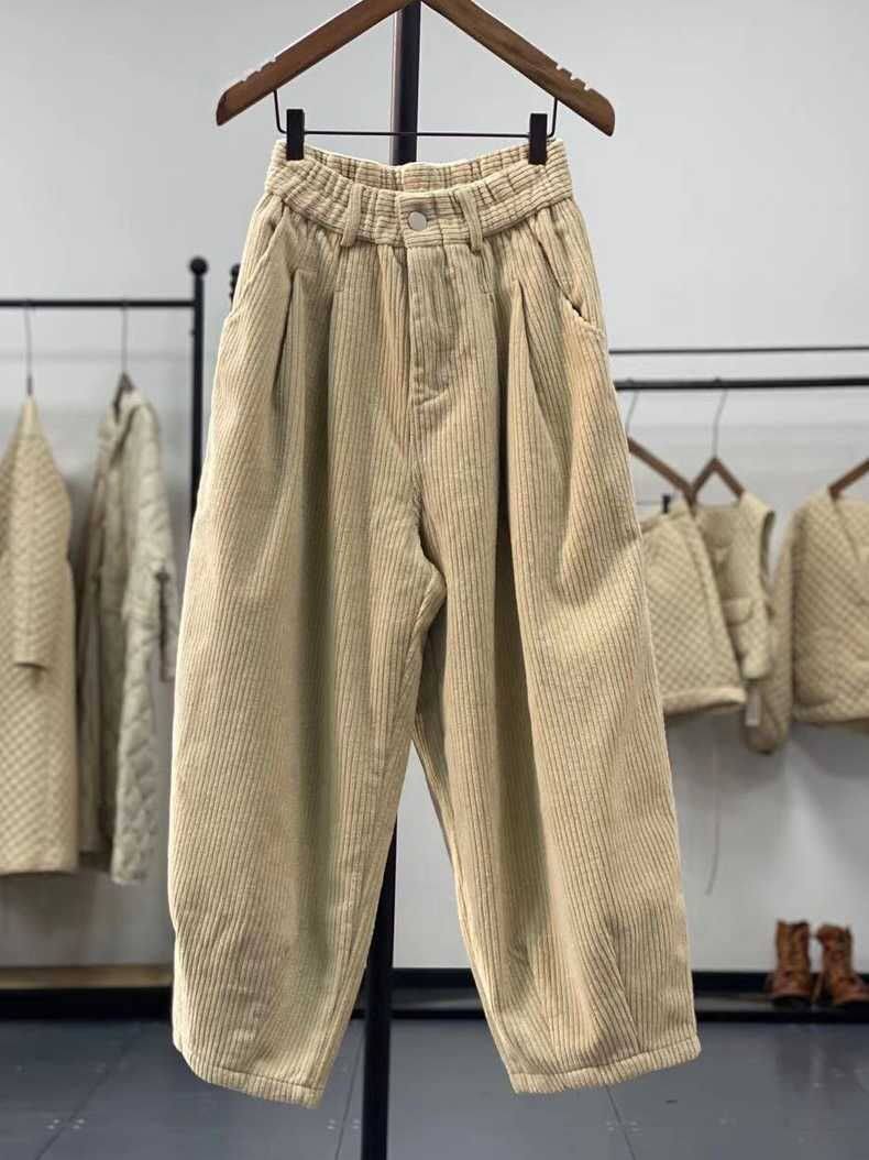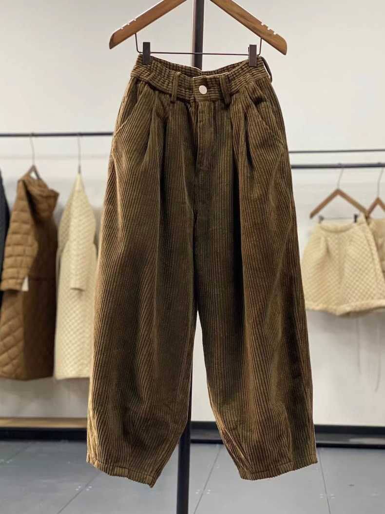 復古燈芯絨濶腿褲女冬季加絨加厚松緊腰大碼媽媽休閒保暖條絨長褲