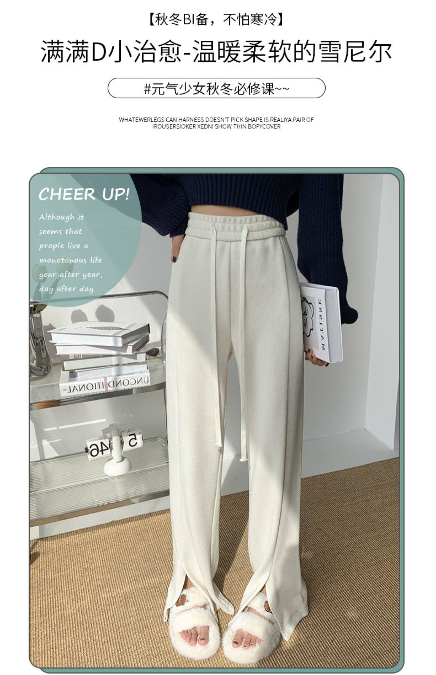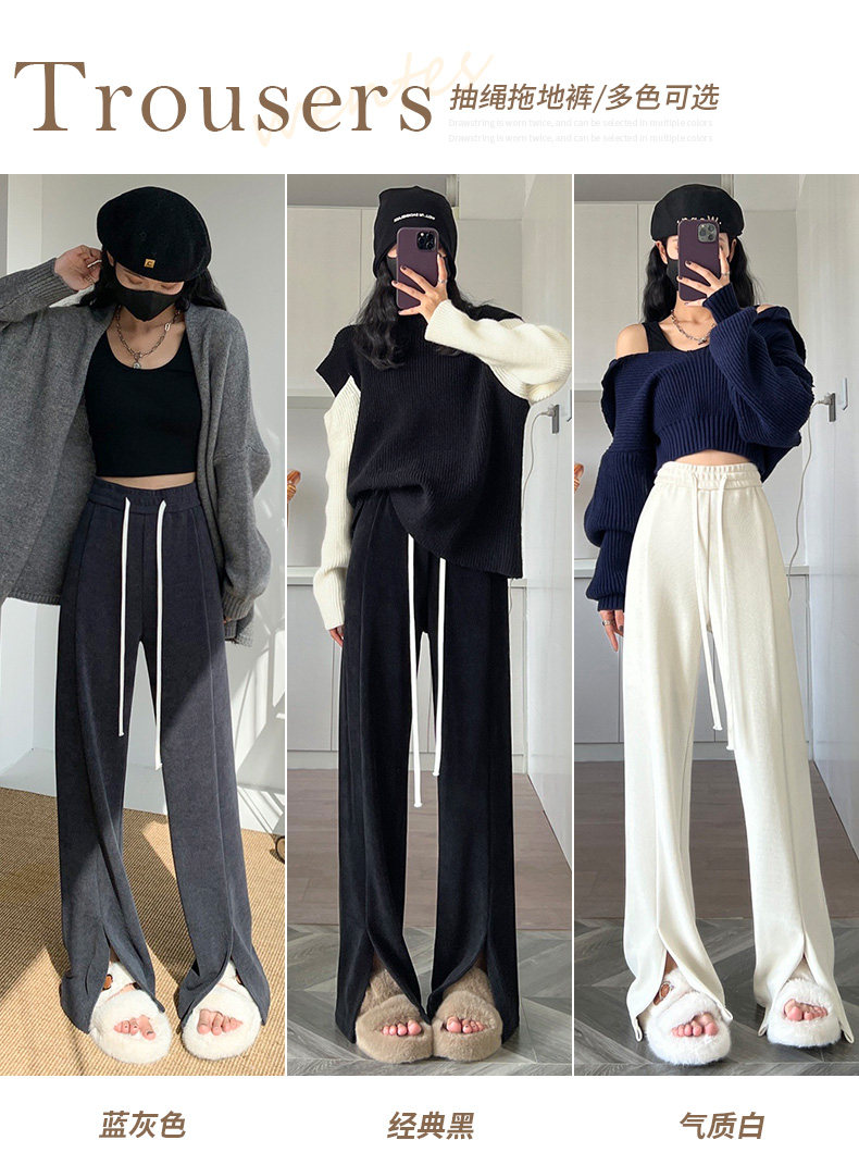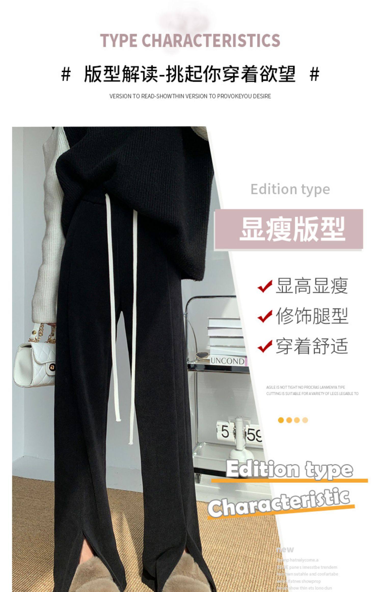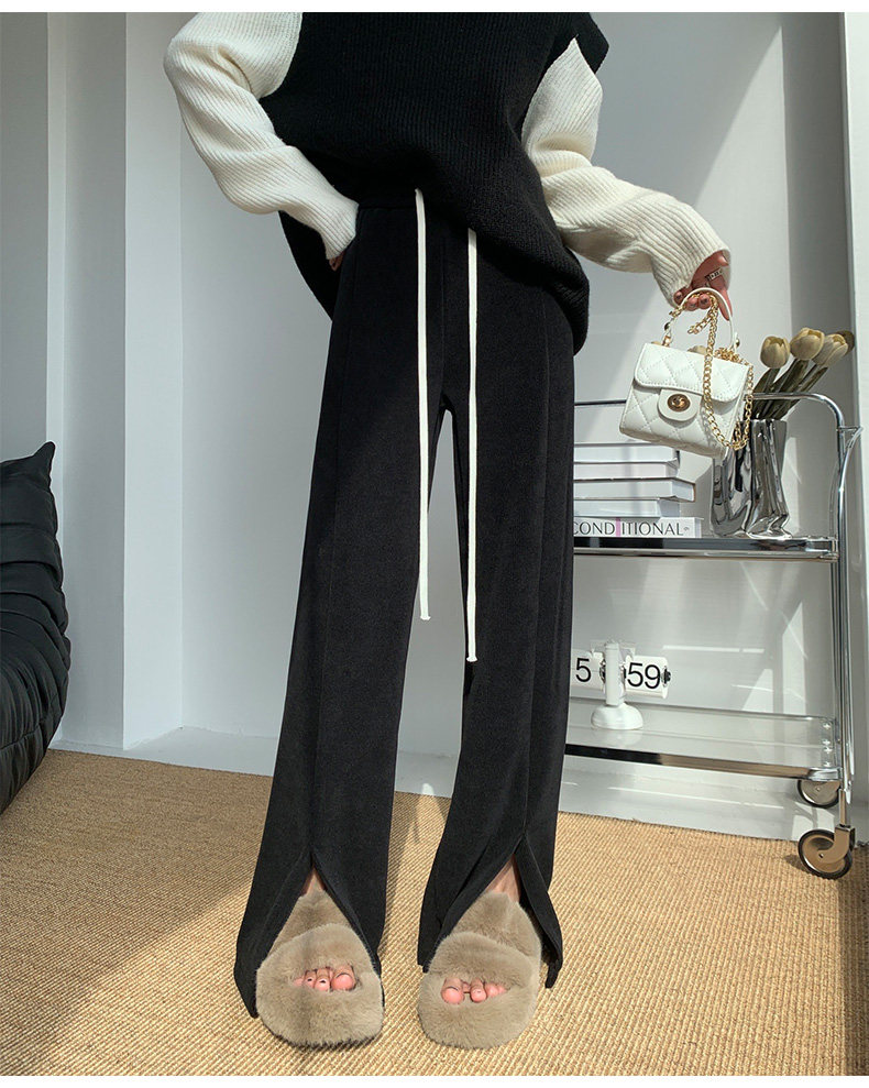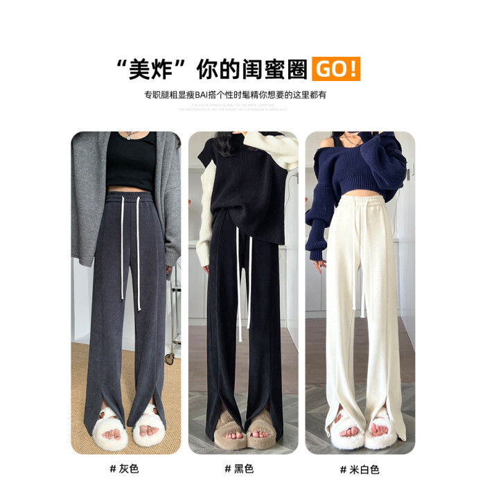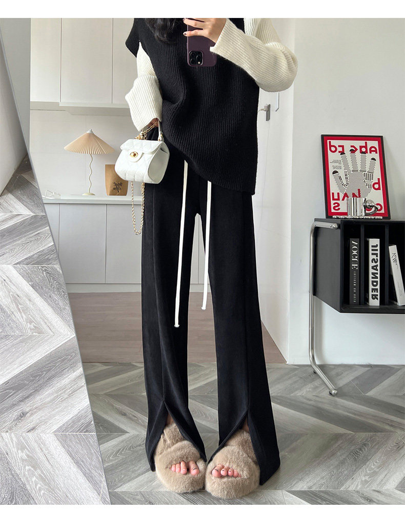 拉夏貝爾窄版開叉濶腿褲女冬季新款高腰垂感拖地加絨雪尼爾直筒褲