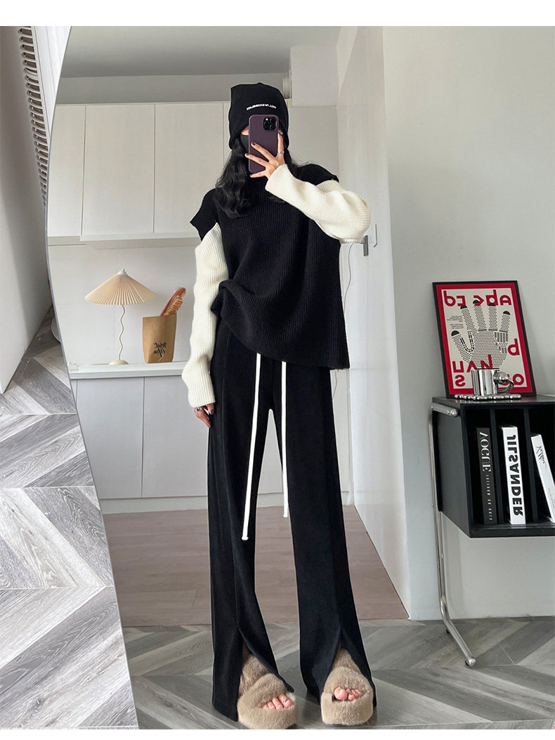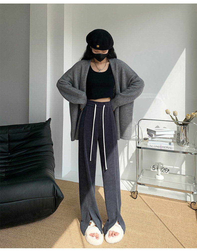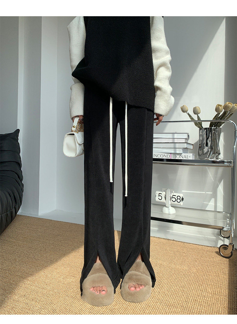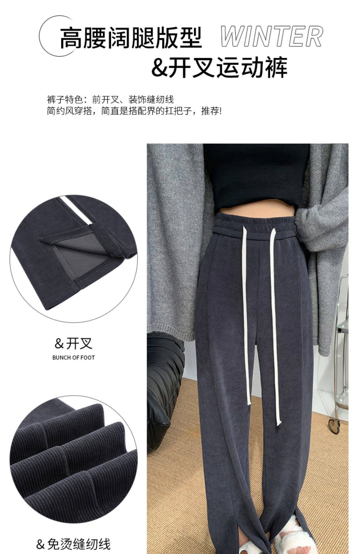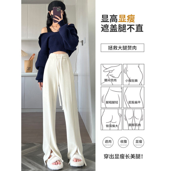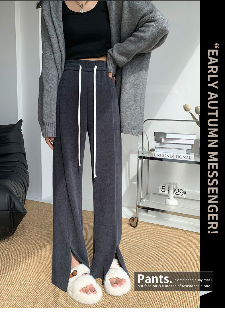 拉夏貝爾窄版開叉濶腿褲女冬季新款高腰垂感拖地加絨雪尼爾直筒褲