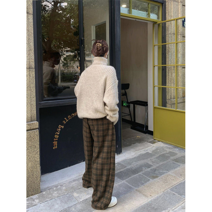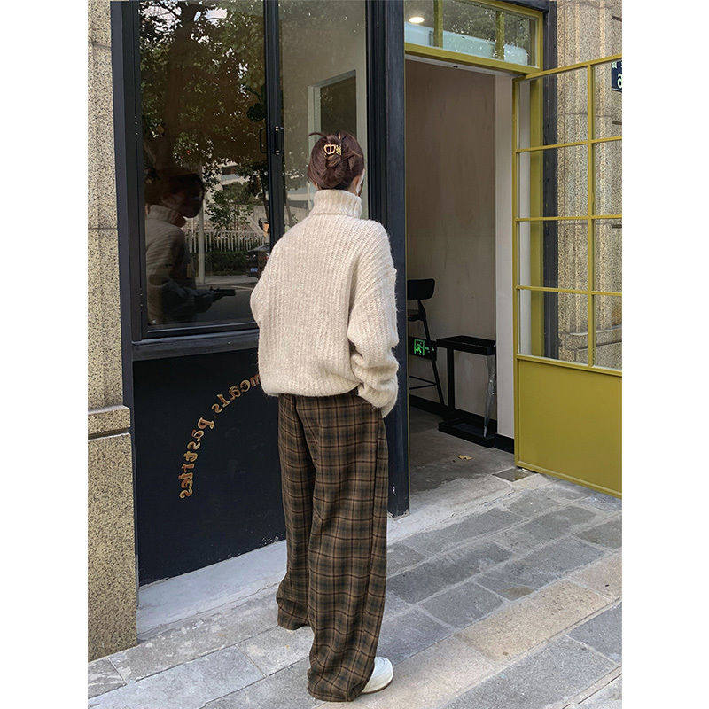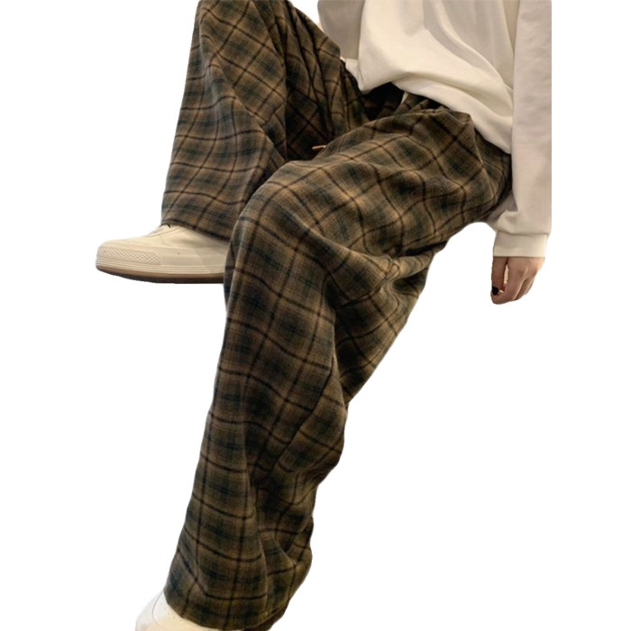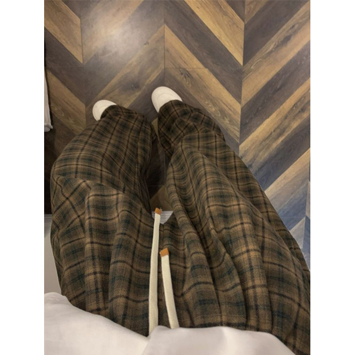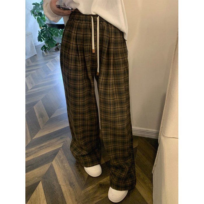 胖mm300斤大碼復古休閒直筒長褲女秋季寬鬆高腰顯瘦格子濶腿褲子