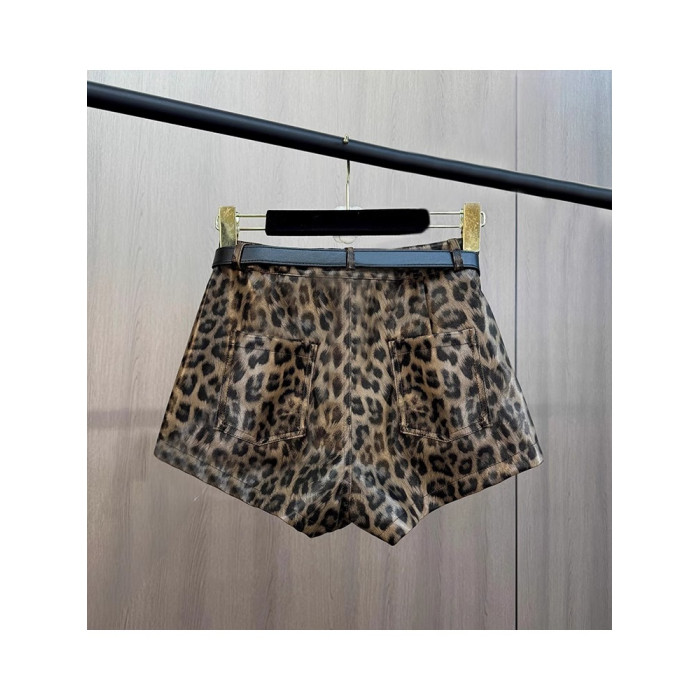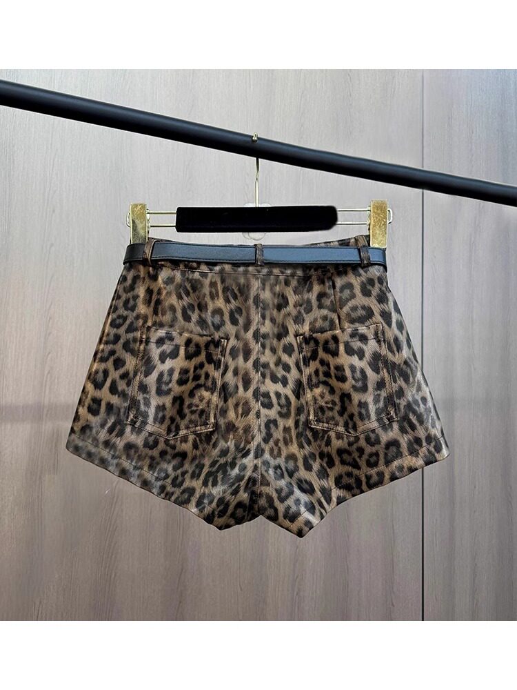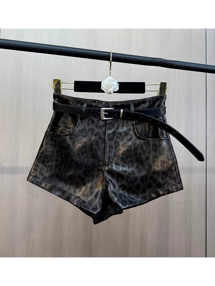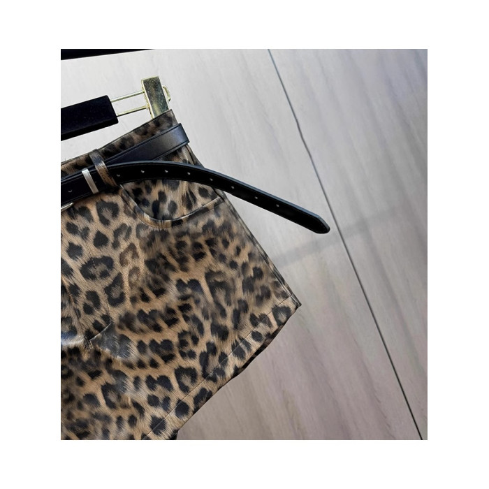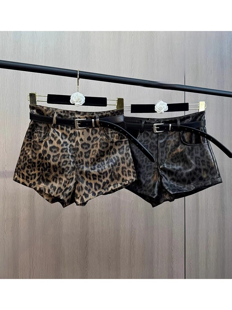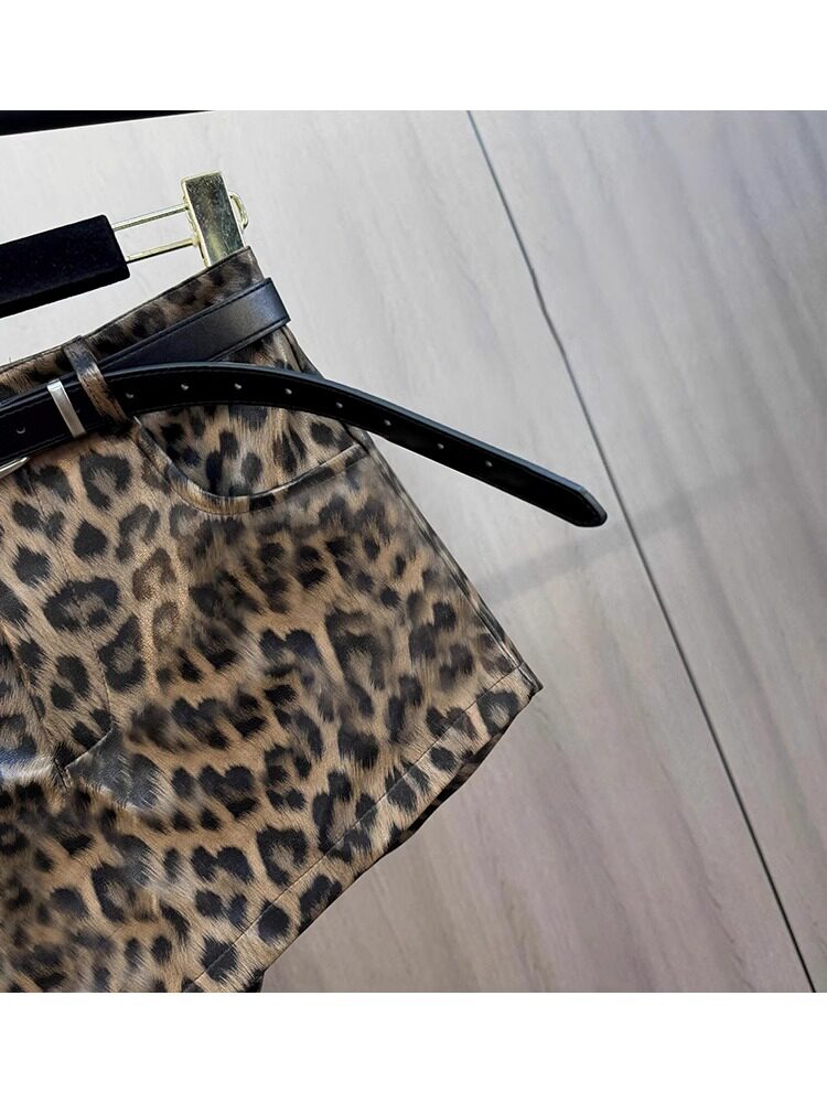 時尚港味豹紋短褲子女夏季高腰顯瘦氣質辣妹PU皮休閒濶腿褲配腰帶