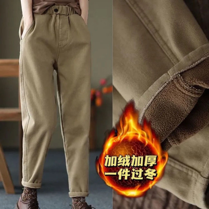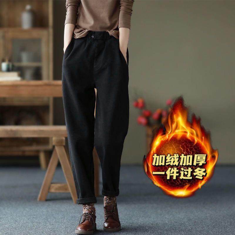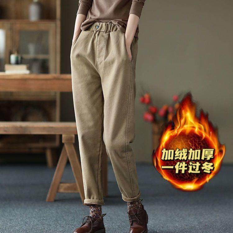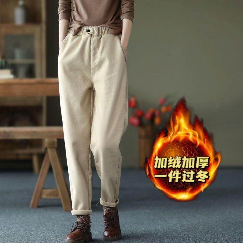 2022新款全棉加厚褲子休閒褲女冬季松緊腰加絨哈倫褲純色外穿長褲