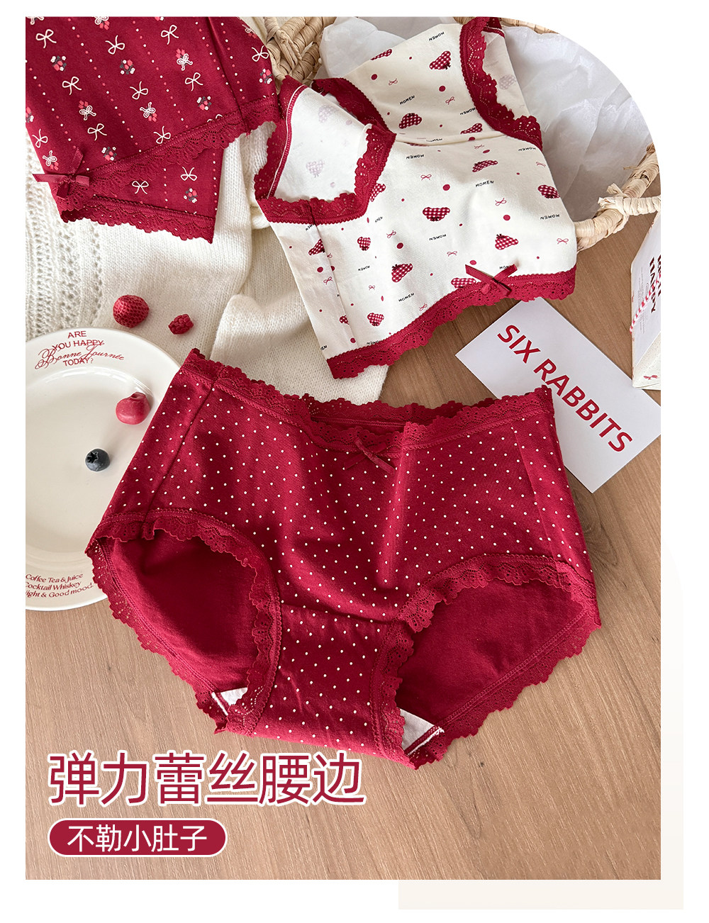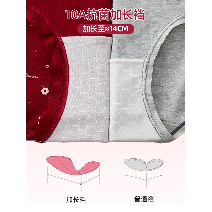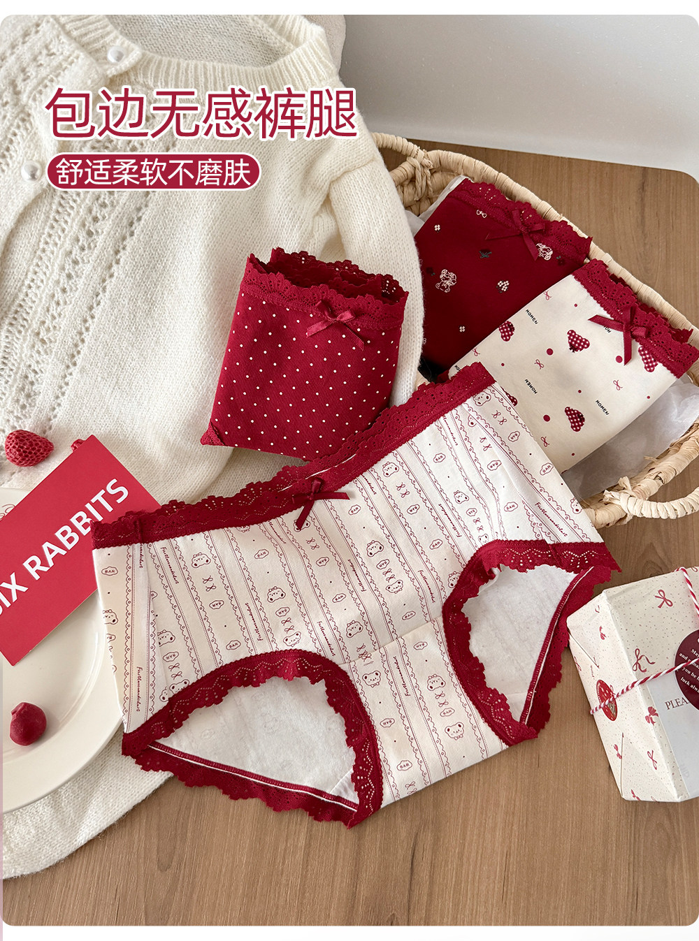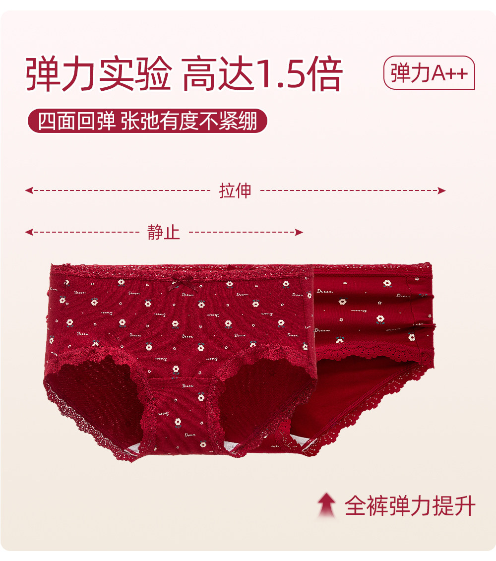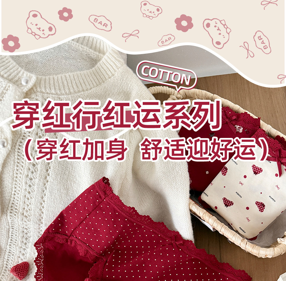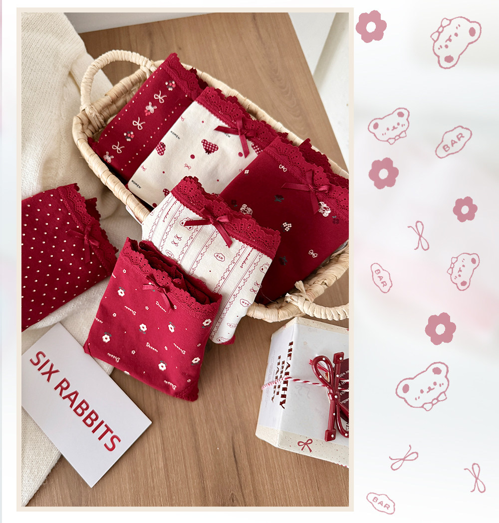 六隻兔子3條裝紅色內褲女10A抑菌襠加長純棉襠中腰本命年三角褲