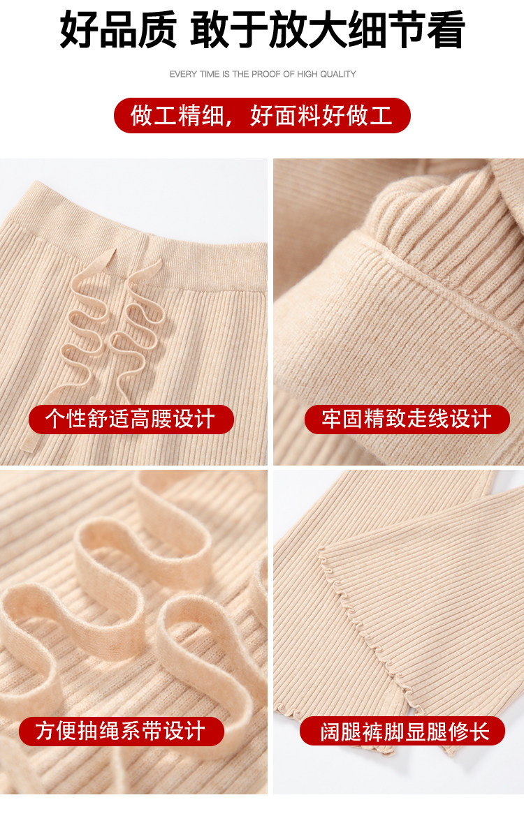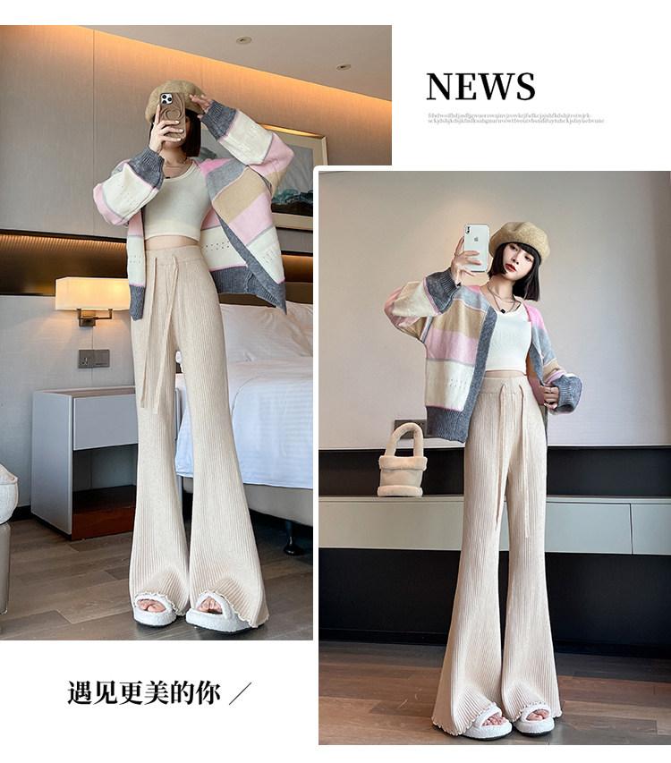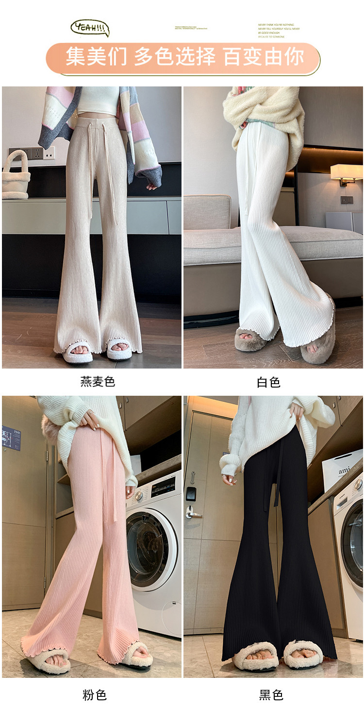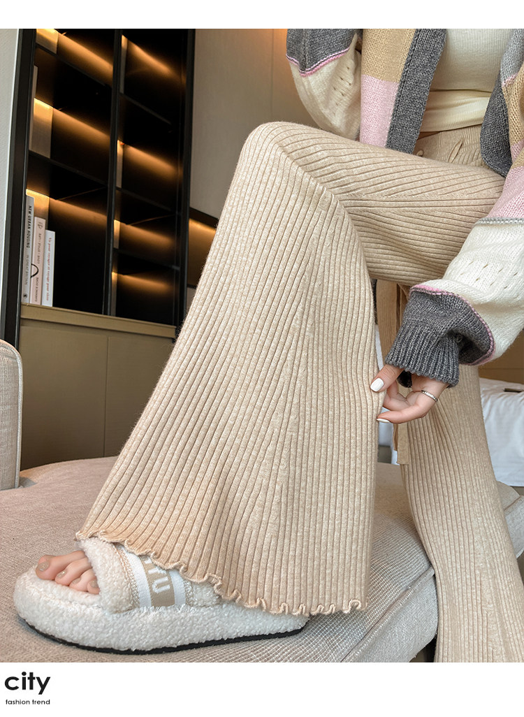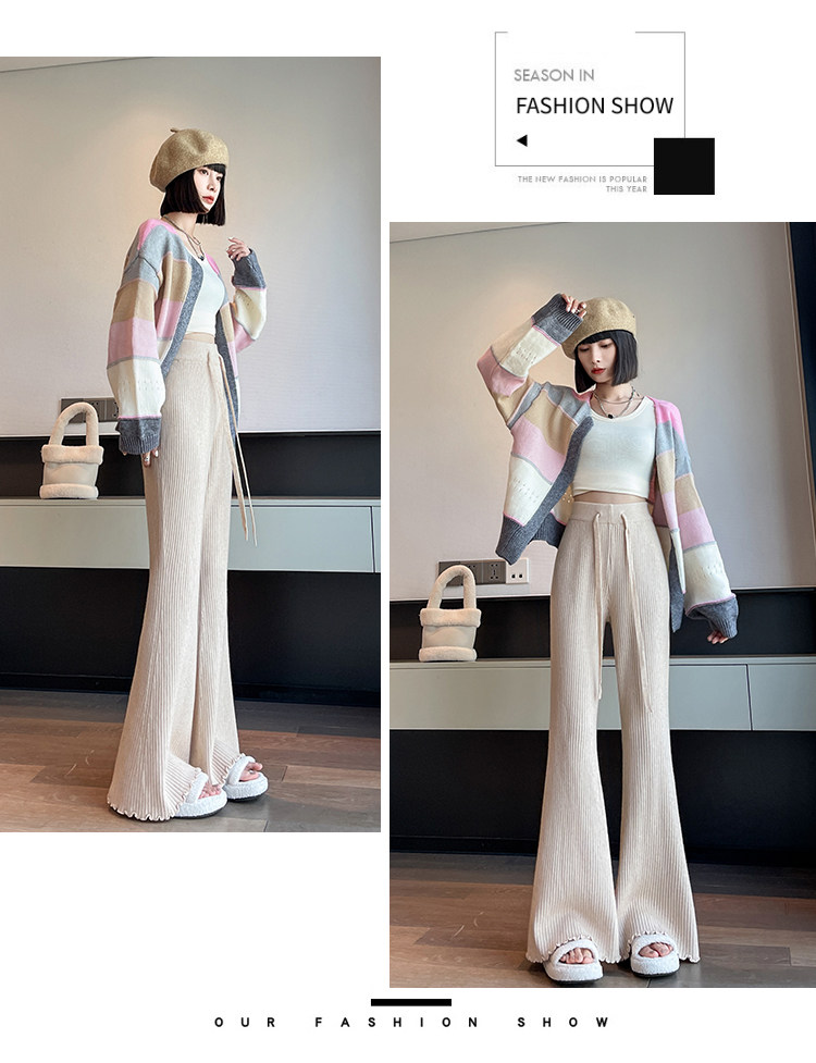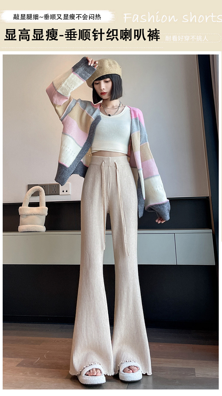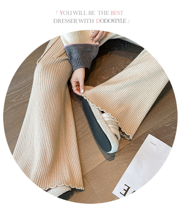 軟糯坑條針織褲子女秋冬加厚高腰顯瘦濶腿褲寬鬆休閒垂感微喇叭褲