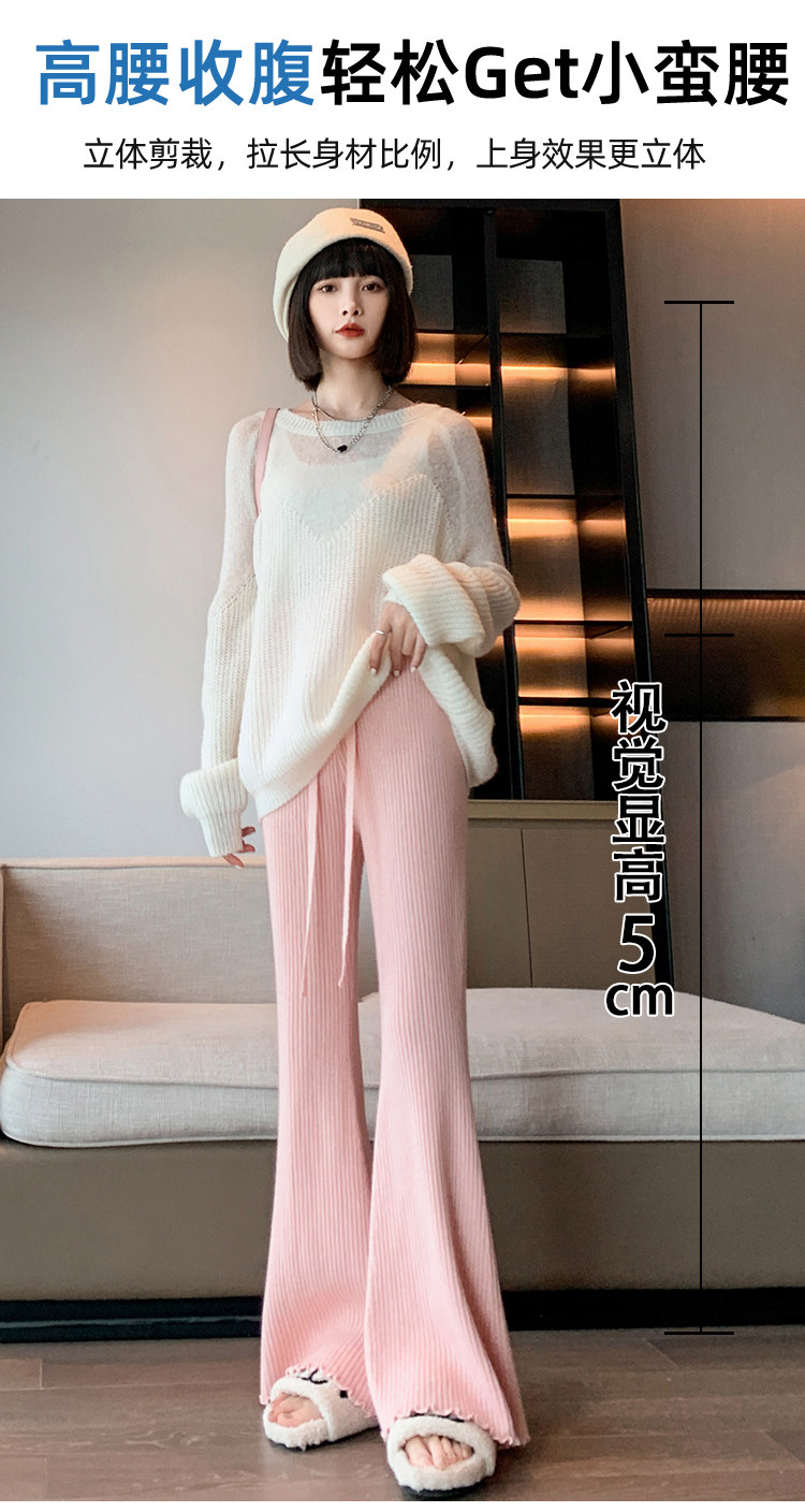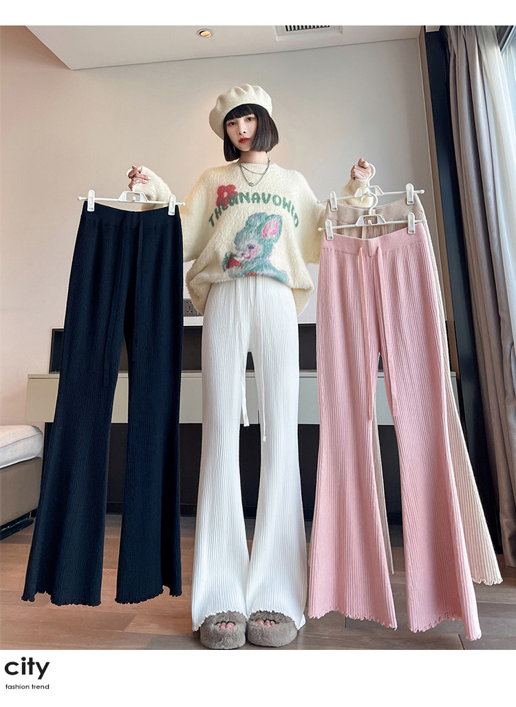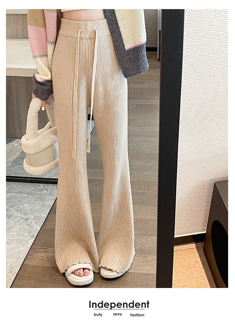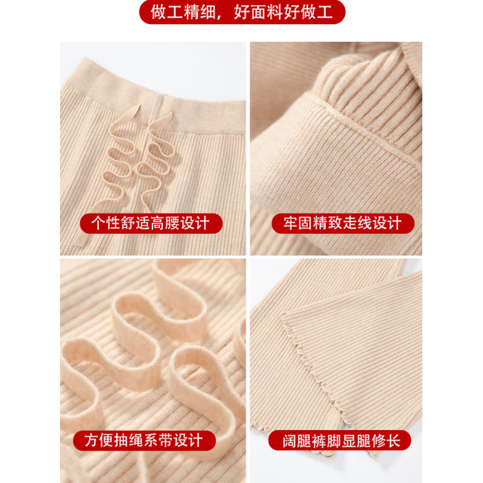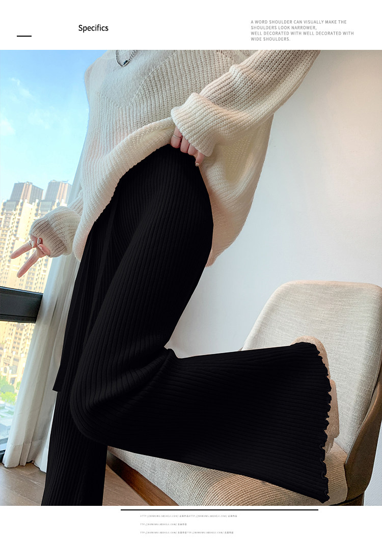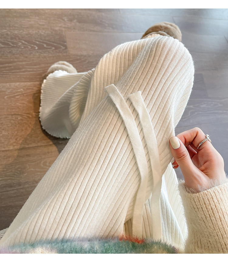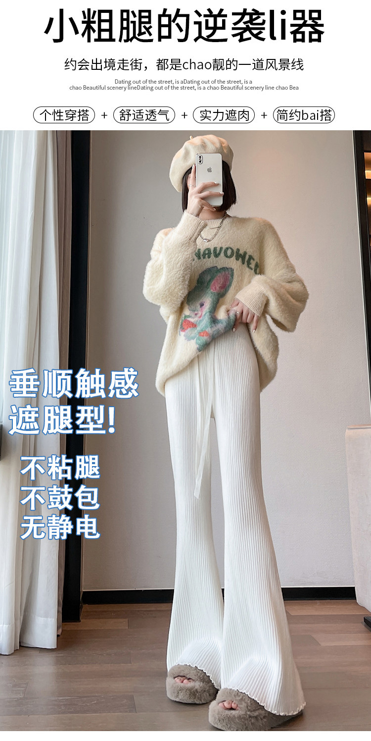 軟糯坑條針織褲子女秋冬加厚高腰顯瘦濶腿褲寬鬆休閒垂感微喇叭褲