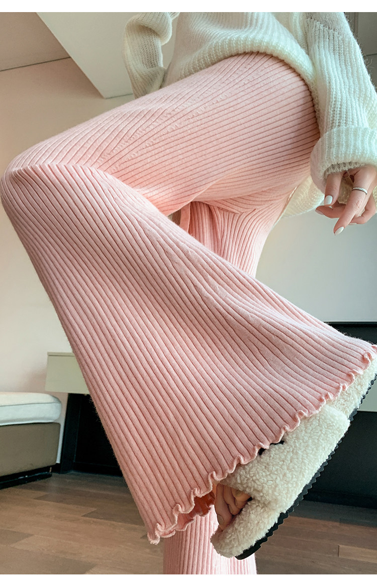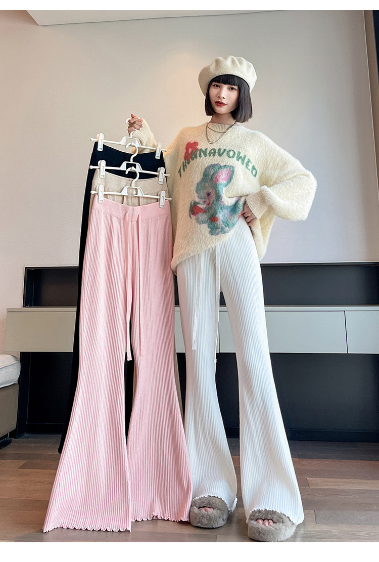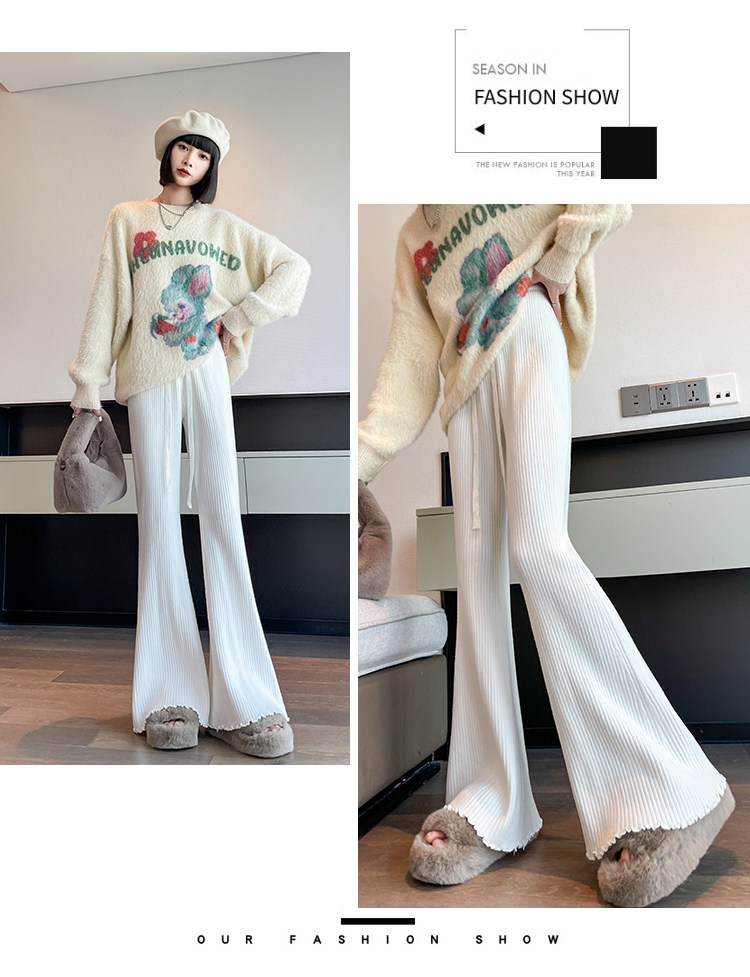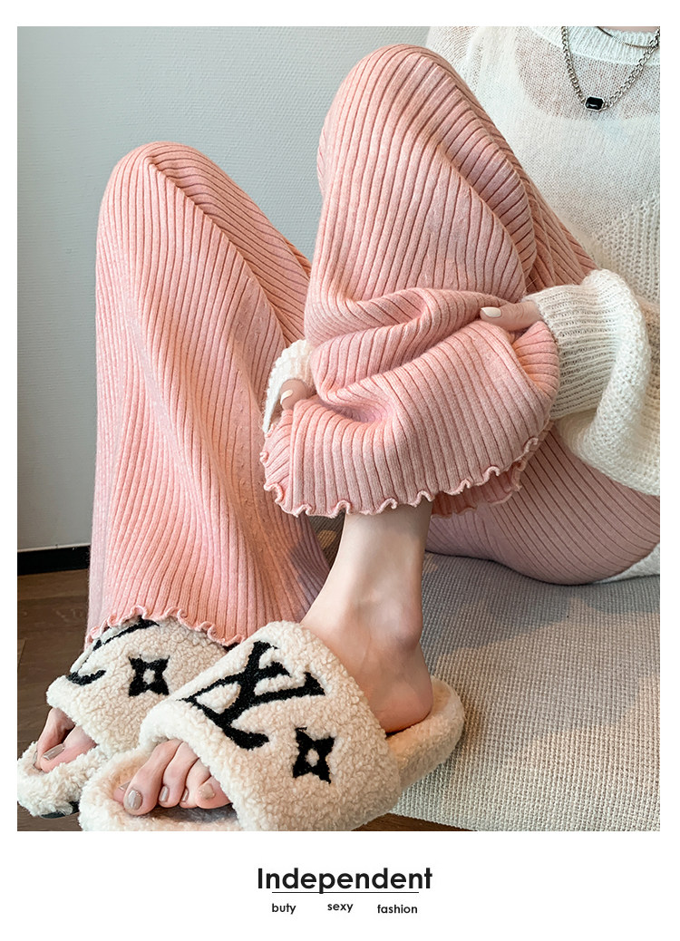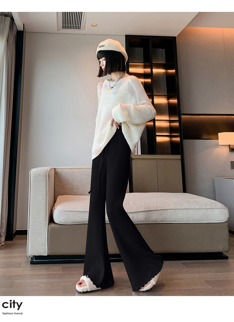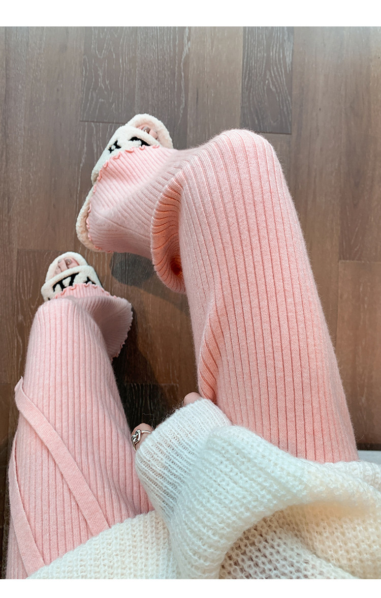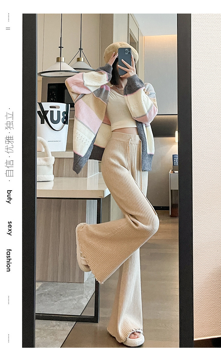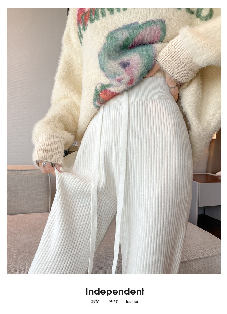 軟糯坑條針織褲子女秋冬加厚高腰顯瘦濶腿褲寬鬆休閒垂感微喇叭褲